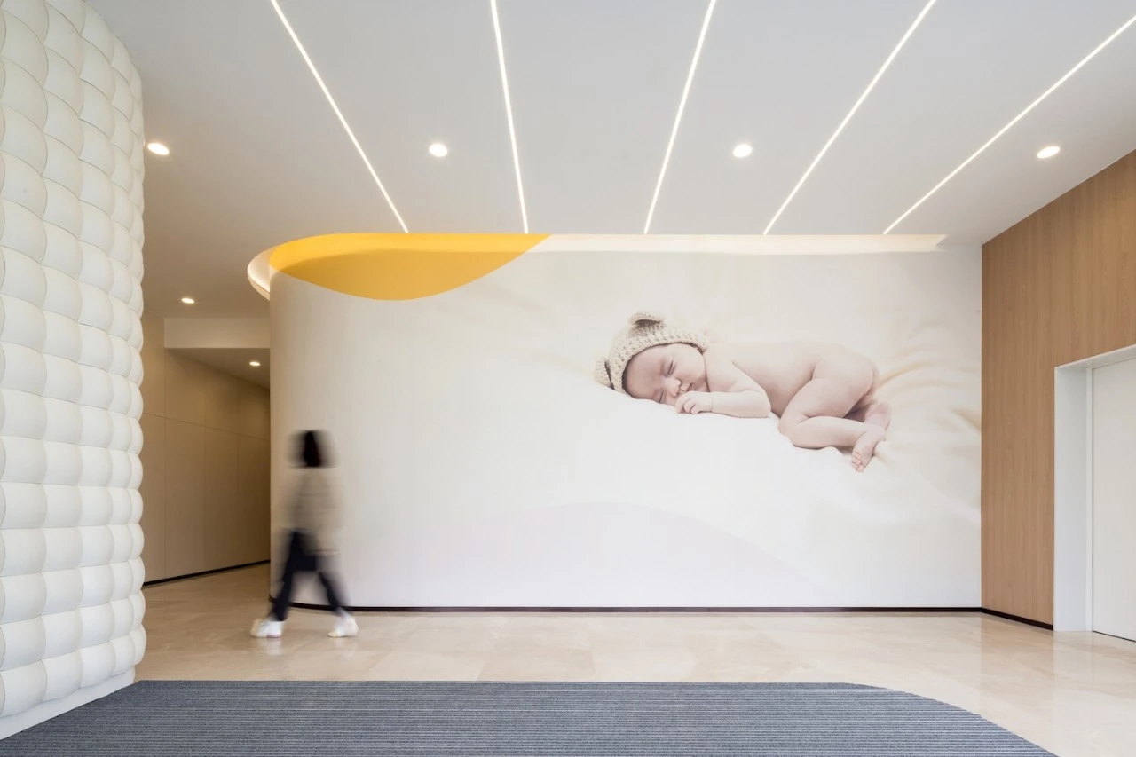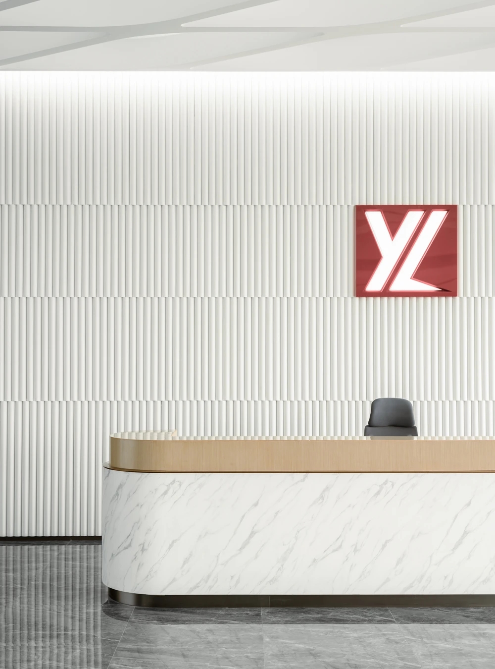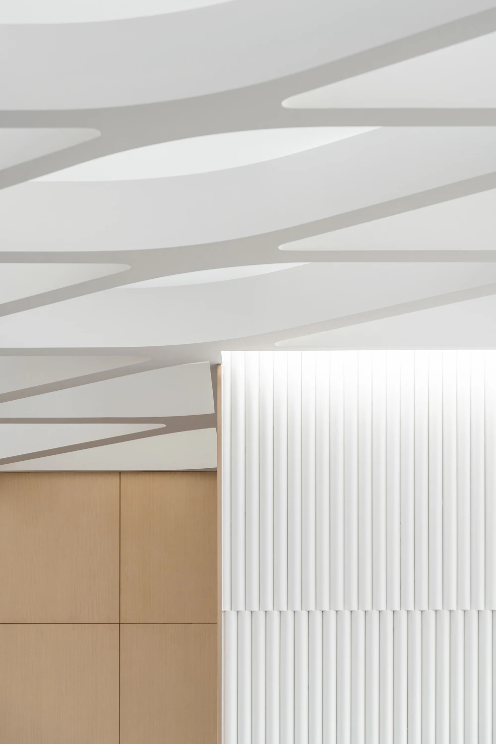 入口大堂的天花设计上遵循人的视觉心理,利用竖向线条的元素加强了空间的纵深感。并以此为模数延伸至大堂,突出空间的连贯性,将原本割离的两个空间连接起来,丰富了流线上的空间体验。同时独特的造型也体现了业主施工工艺的专业性。