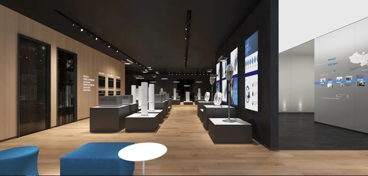 中国明显的鲜红色在设计中占据突出地位,并通过柔和的色彩和各种反光表面突出。进入展厅,映入眼帘的是一片红色的星空和独特的中国国旗展示——一个由红色波纹玻璃组成的矩形立方体,从上到下点亮。展厅内温暖的红光与内部的银灰色 BOLON 地毯、深灰色镜子、黑色玻璃和柔和的白色镶板天花板相得益彰。