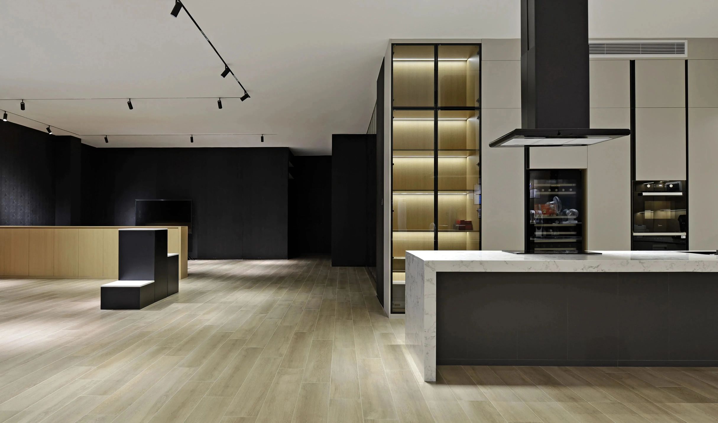 不同材料的质感对比,在统一的设计语言中又相互融合。空间以白色与木色构成了利落的体块关系,整体空间明亮开阔且简约自然。在统一的白色体块中,石材、发泡陶瓷与圆柱形白瓷砖的组合又形成丰富的层次感。