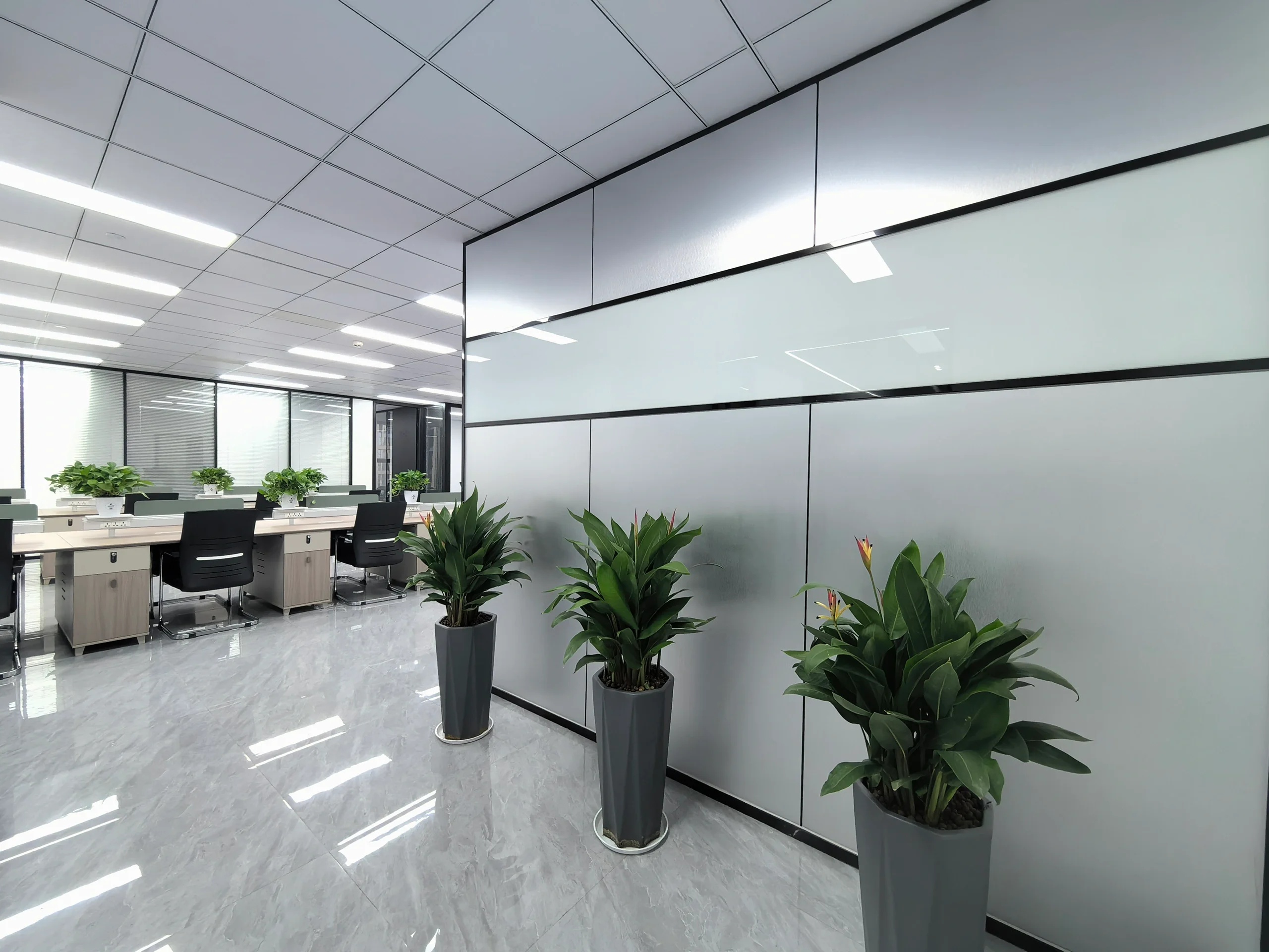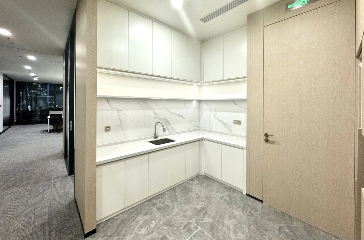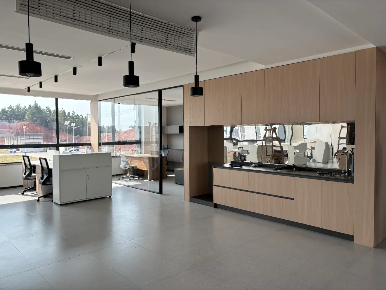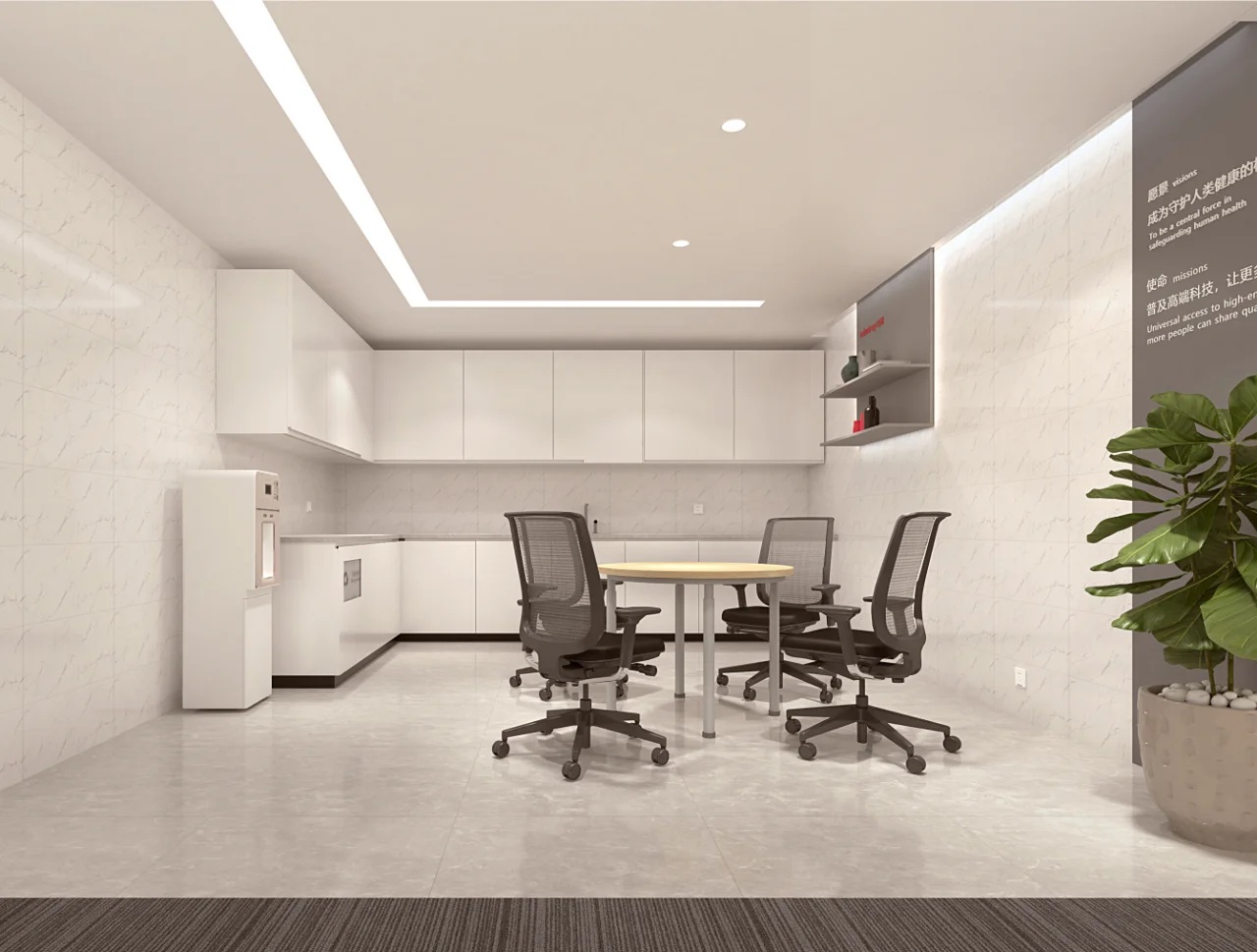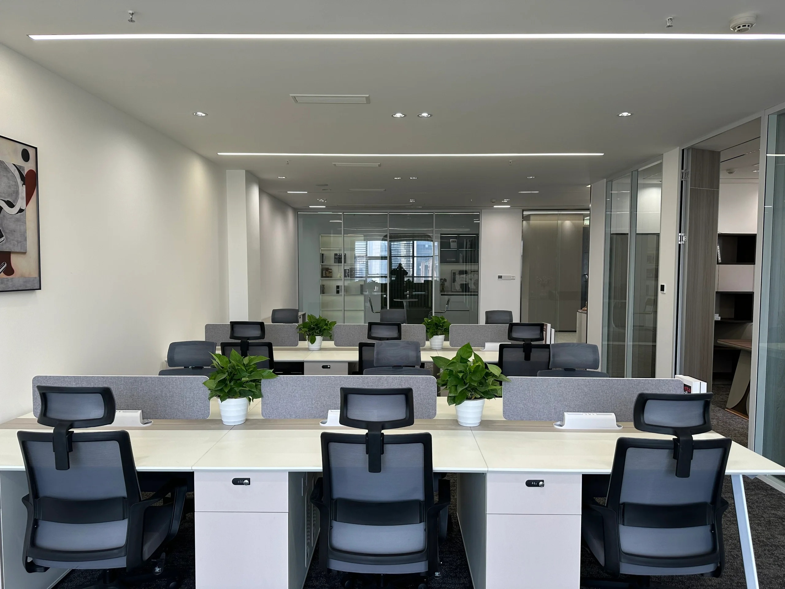 白色石纹墙板与整块区域相得益彰,前台选用透光不透明的哑光玻璃背景墙,暖光灯带把前台区域映衬的更显气质。没有茶水间的办公室装修设计得再温馨也还是少了灵魂,烟火味热气儿才是生活的味道。一间像极了家里小厨房的茶水间一定能给员工带来一丝温暖。同时,茶水间背后留出杂物间,不占用办公室空间额外面积。玻璃隔断将独立办公室与共享办公区融为一体,将原来的百叶遮光帘设计改为内贴防窥渐变膜,既增高颜值又保障了领导的隐私空间。