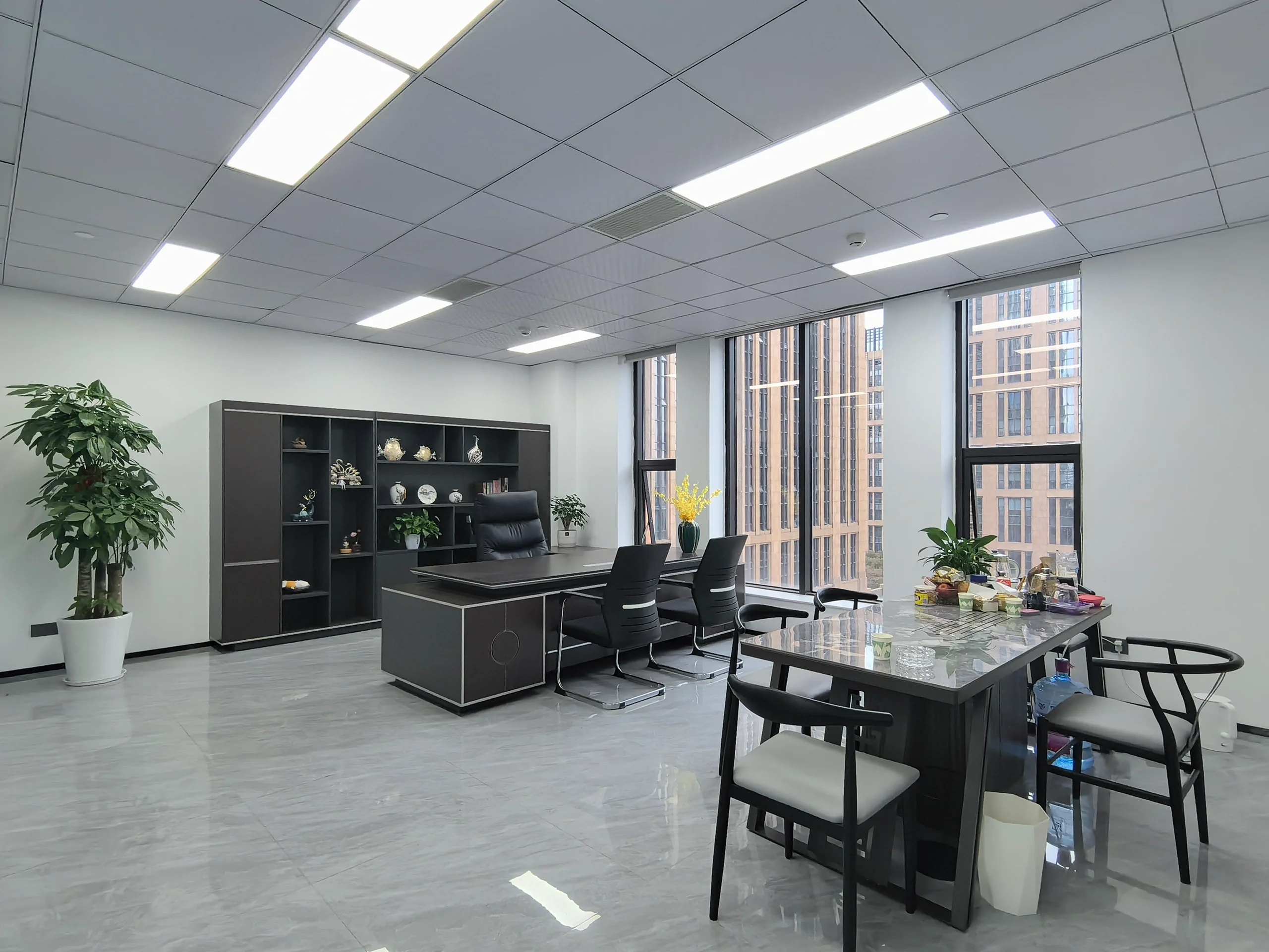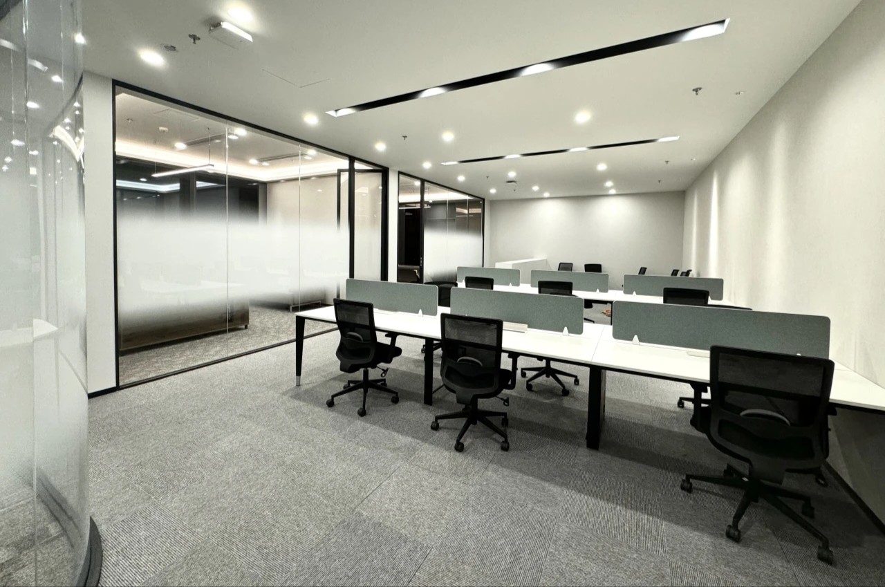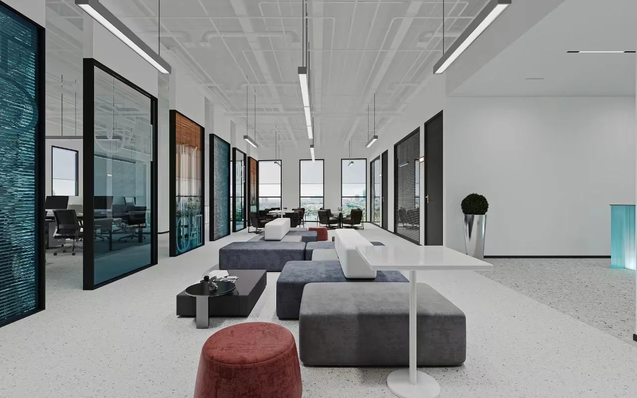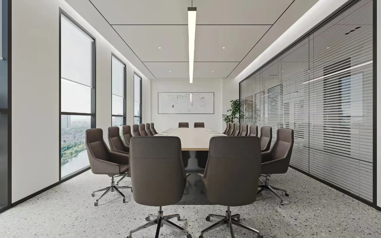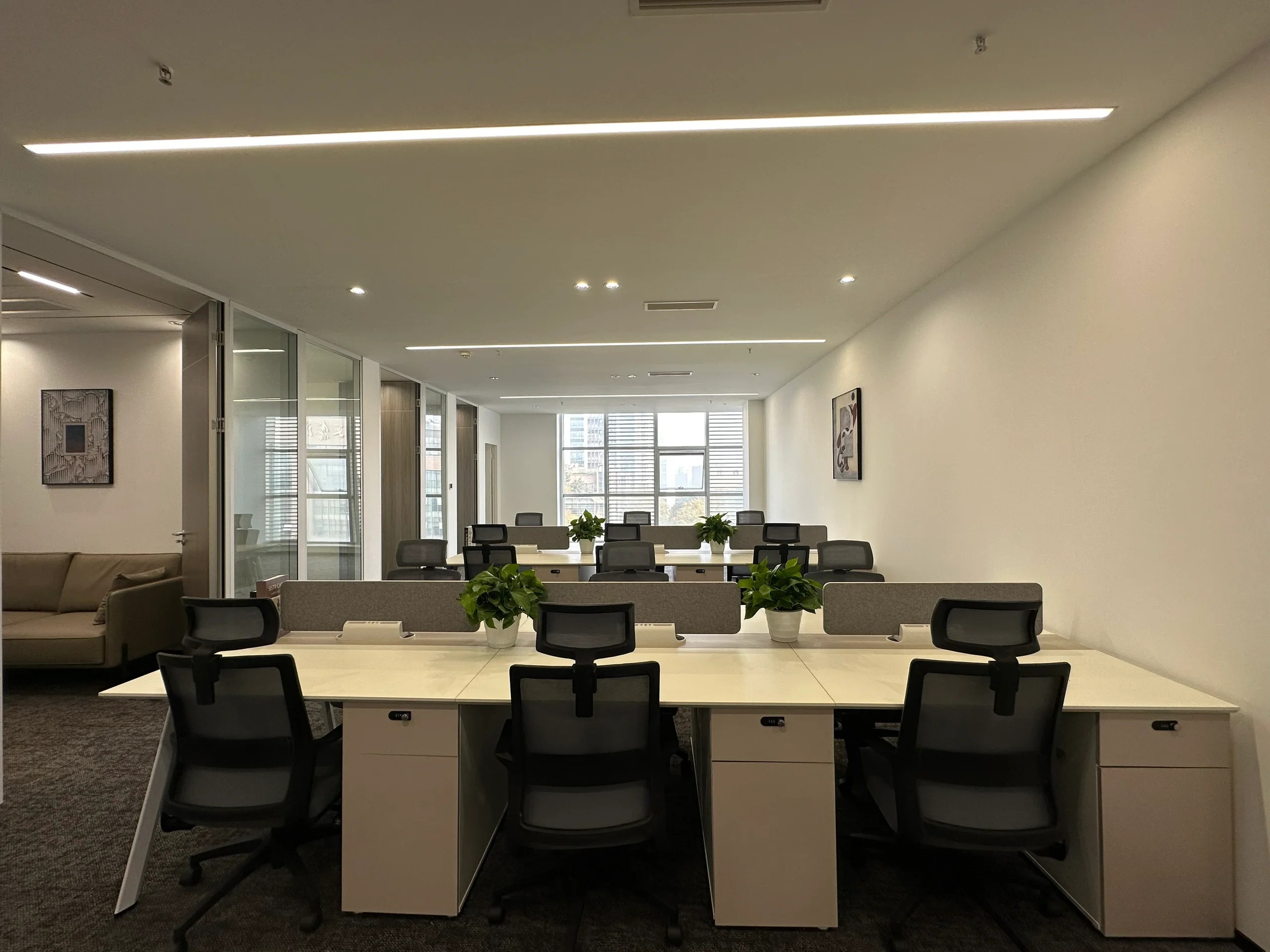 白色石纹墙板与整块区域相得益彰,前台选用透光不透明的哑光玻璃背景墙,暖光灯带把前台区域映衬的更显气质。没有茶水间的办公室装修设计得再温馨也还是少了灵魂,烟火味热气儿才是生活的味道。一间像极了家里小厨房的茶水间一定能给员工带来一丝温暖。同时,茶水间背后留出杂物间,不占用办公室空间额外面积。玻璃隔断将独立办公室与共享办公区融为一体,将原来的百叶遮光帘设计改为内贴防窥渐变膜,既增高颜值又保障了领导的隐私空间。