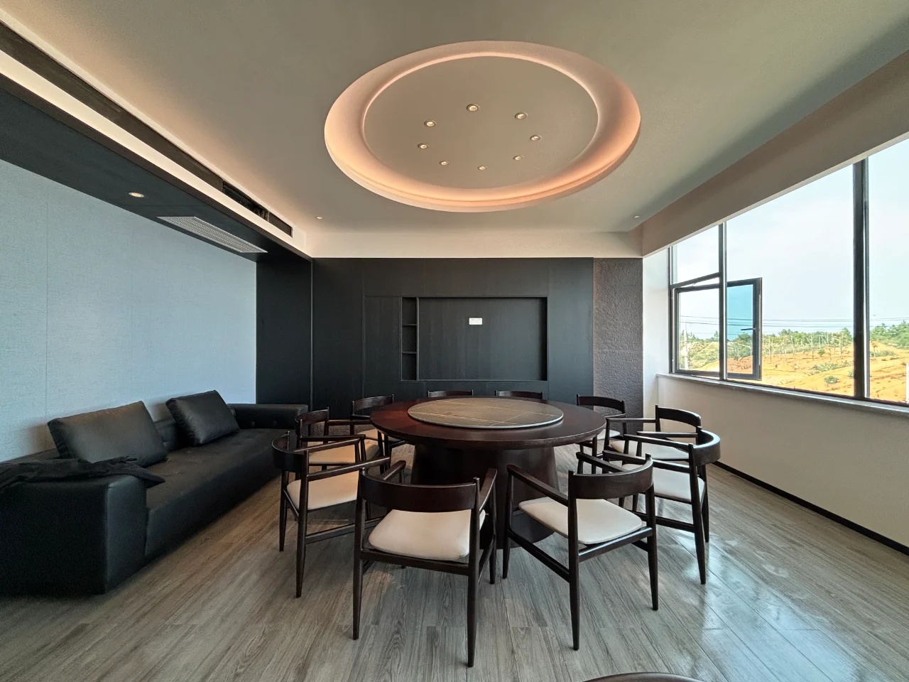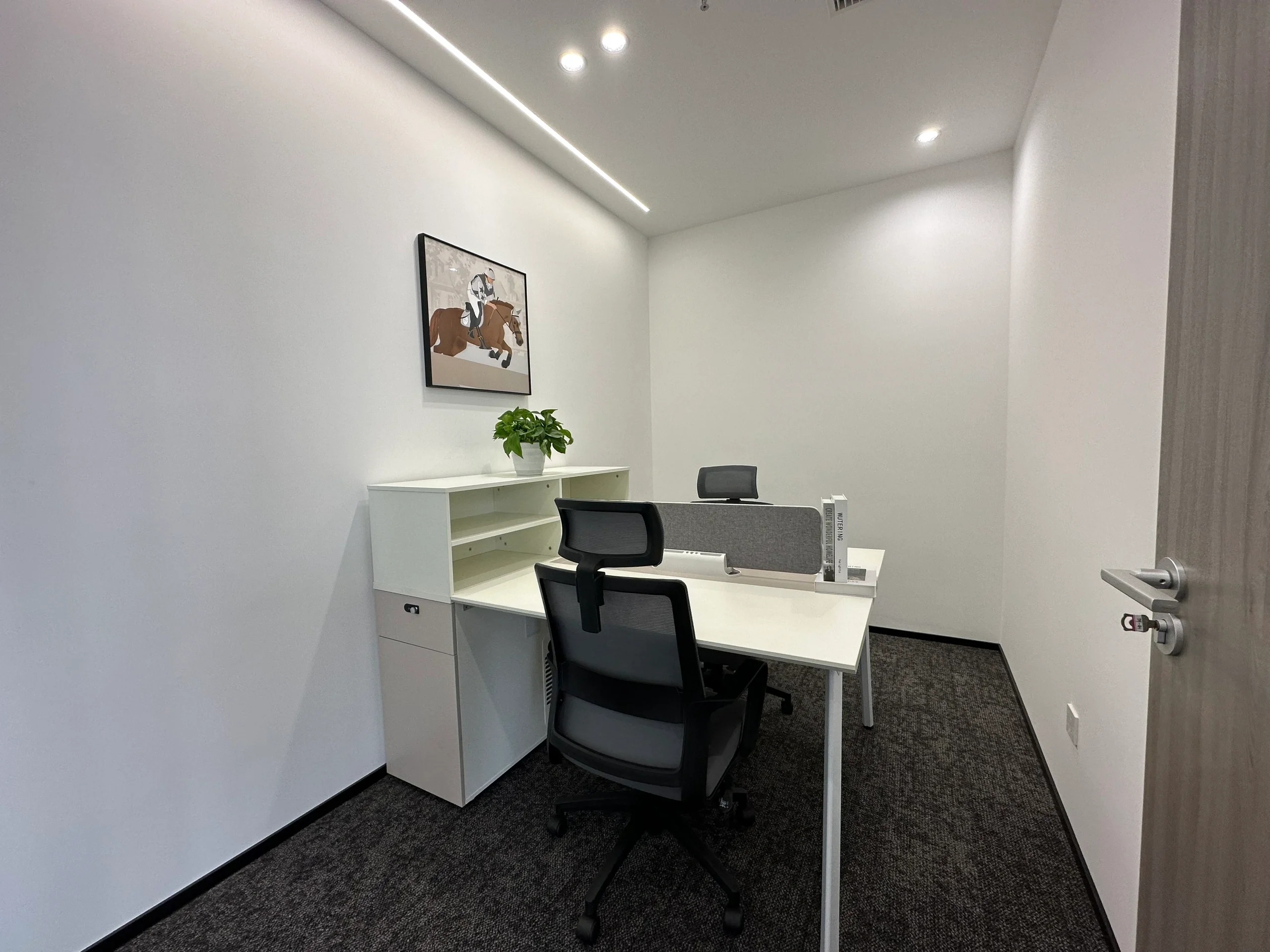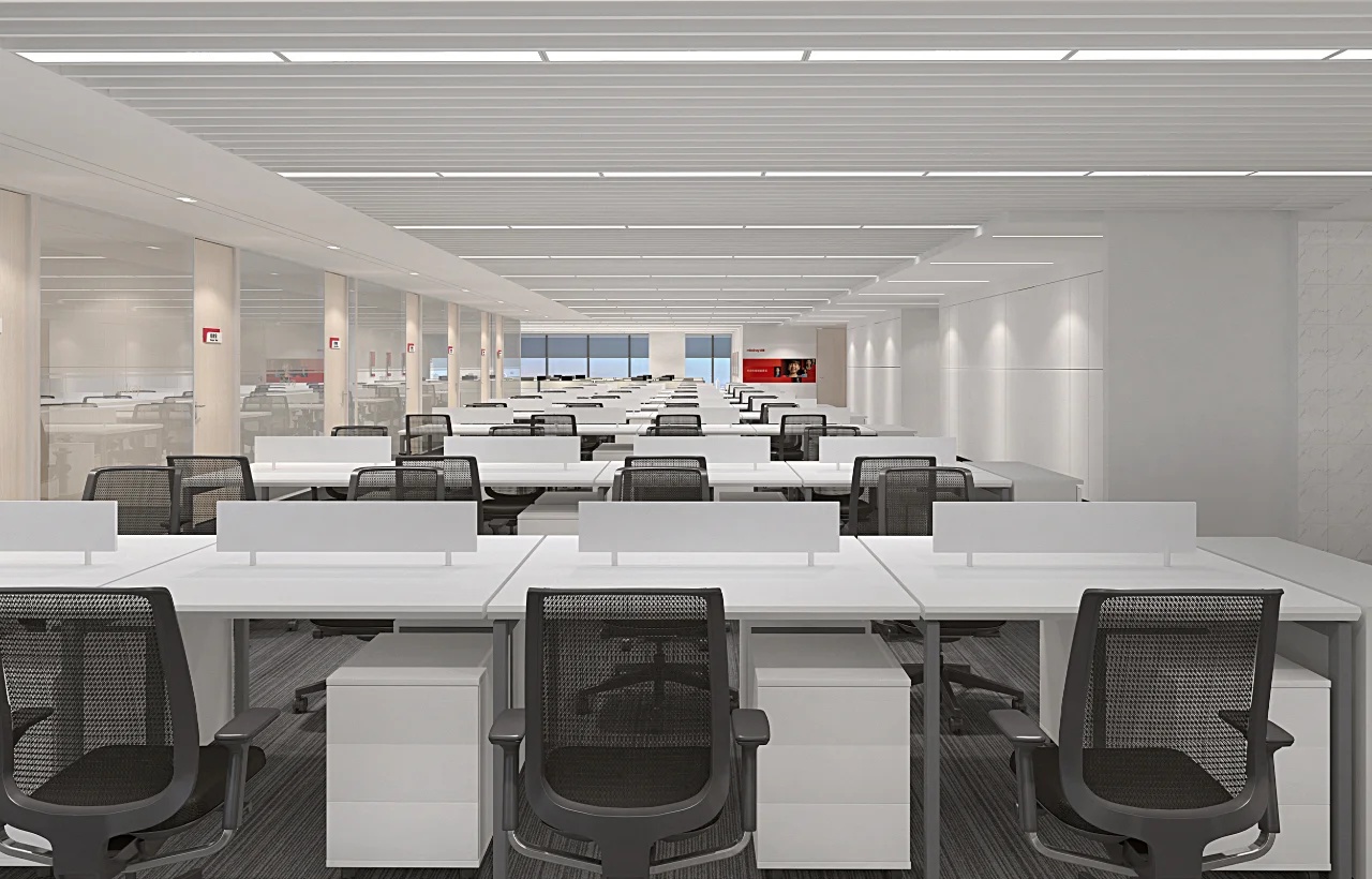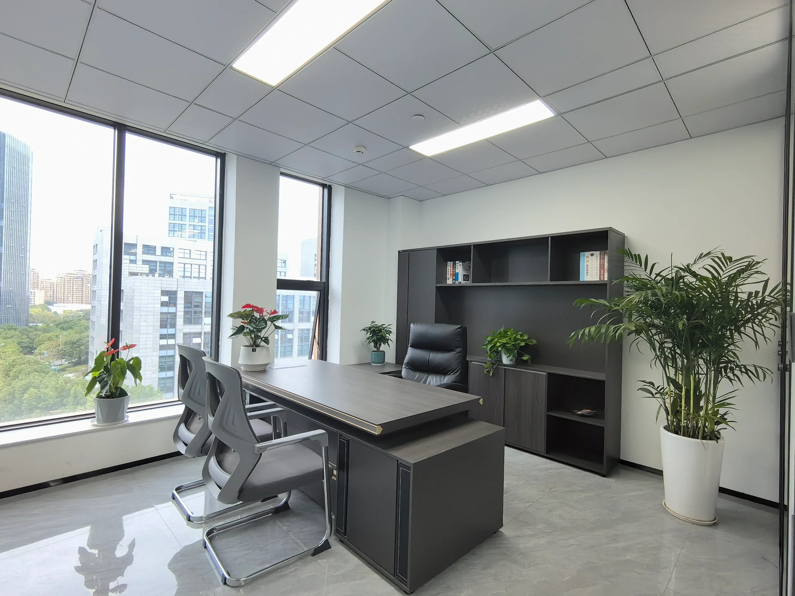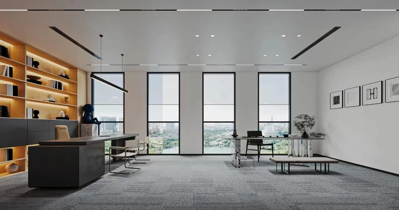 白色石纹墙板与整块区域相得益彰,前台选用透光不透明的哑光玻璃背景墙,暖光灯带把前台区域映衬的更显气质。没有茶水间的办公室装修设计得再温馨也还是少了灵魂,烟火味热气儿才是生活的味道。一间像极了家里小厨房的茶水间一定能给员工带来一丝温暖。同时,茶水间背后留出杂物间,不占用办公室空间额外面积。玻璃隔断将独立办公室与共享办公区融为一体,将原来的百叶遮光帘设计改为内贴防窥渐变膜,既增高颜值又保障了领导的隐私空间。