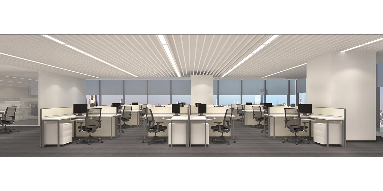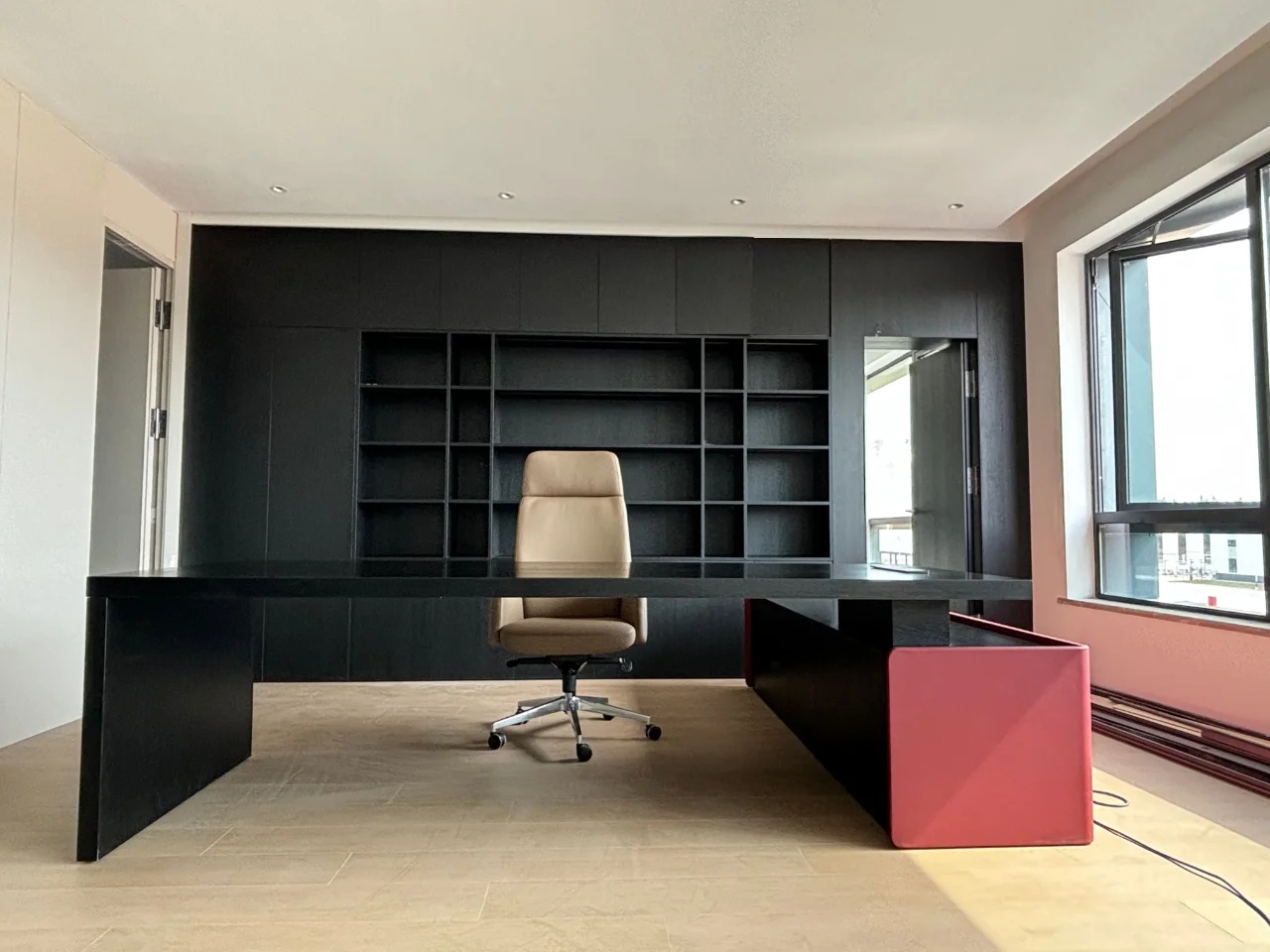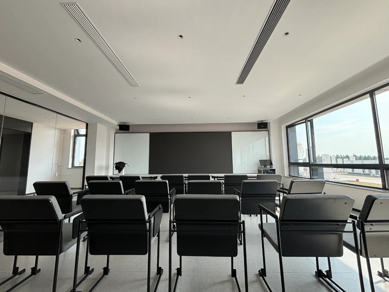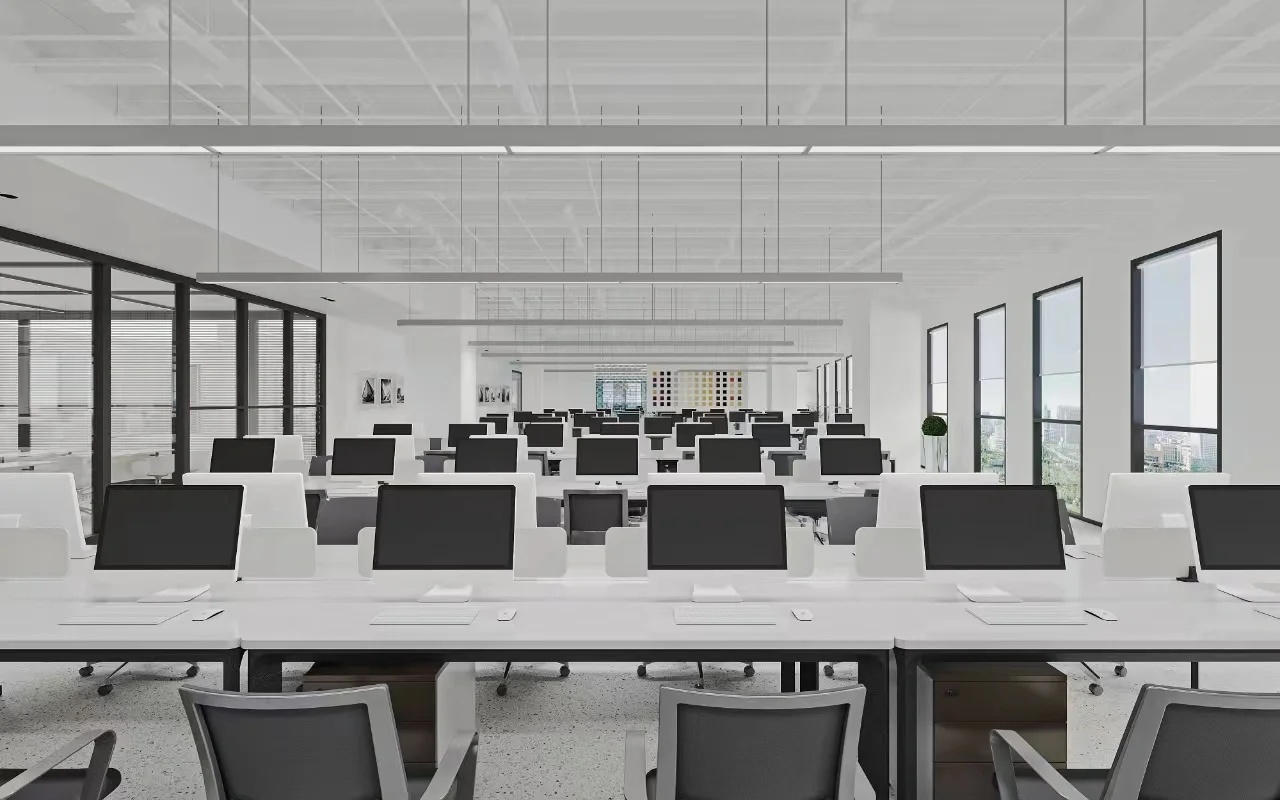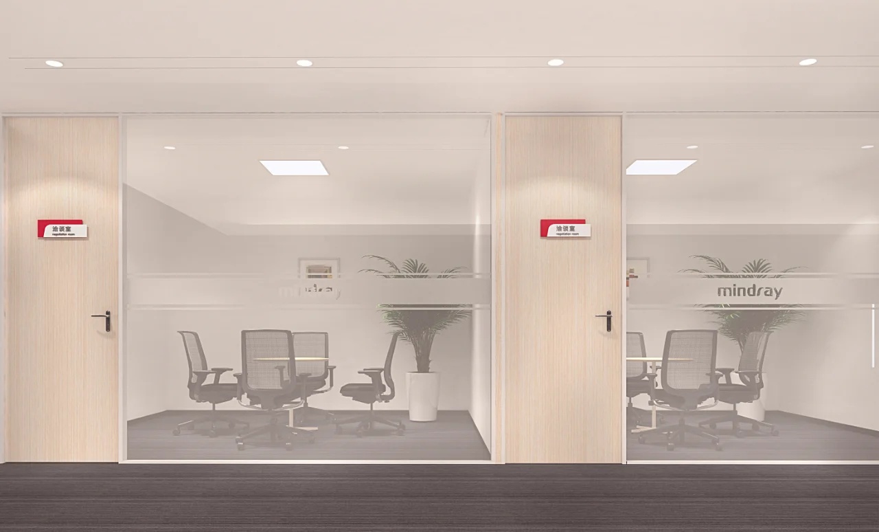 白色石纹墙板与整块区域相得益彰,前台选用透光不透明的哑光玻璃背景墙,暖光灯带把前台区域映衬的更显气质。没有茶水间的办公室装修设计得再温馨也还是少了灵魂,烟火味热气儿才是生活的味道。一间像极了家里小厨房的茶水间一定能给员工带来一丝温暖。同时,茶水间背后留出杂物间,不占用办公室空间额外面积。玻璃隔断将独立办公室与共享办公区融为一体,将原来的百叶遮光帘设计改为内贴防窥渐变膜,既增高颜值又保障了领导的隐私空间。