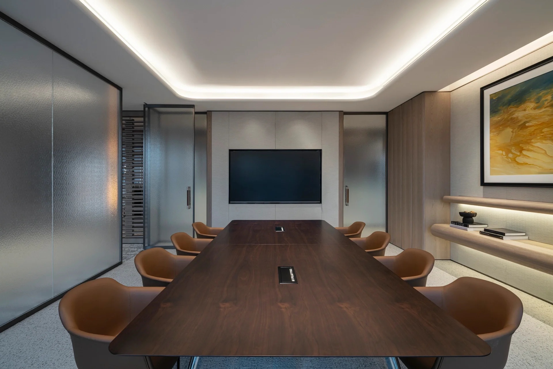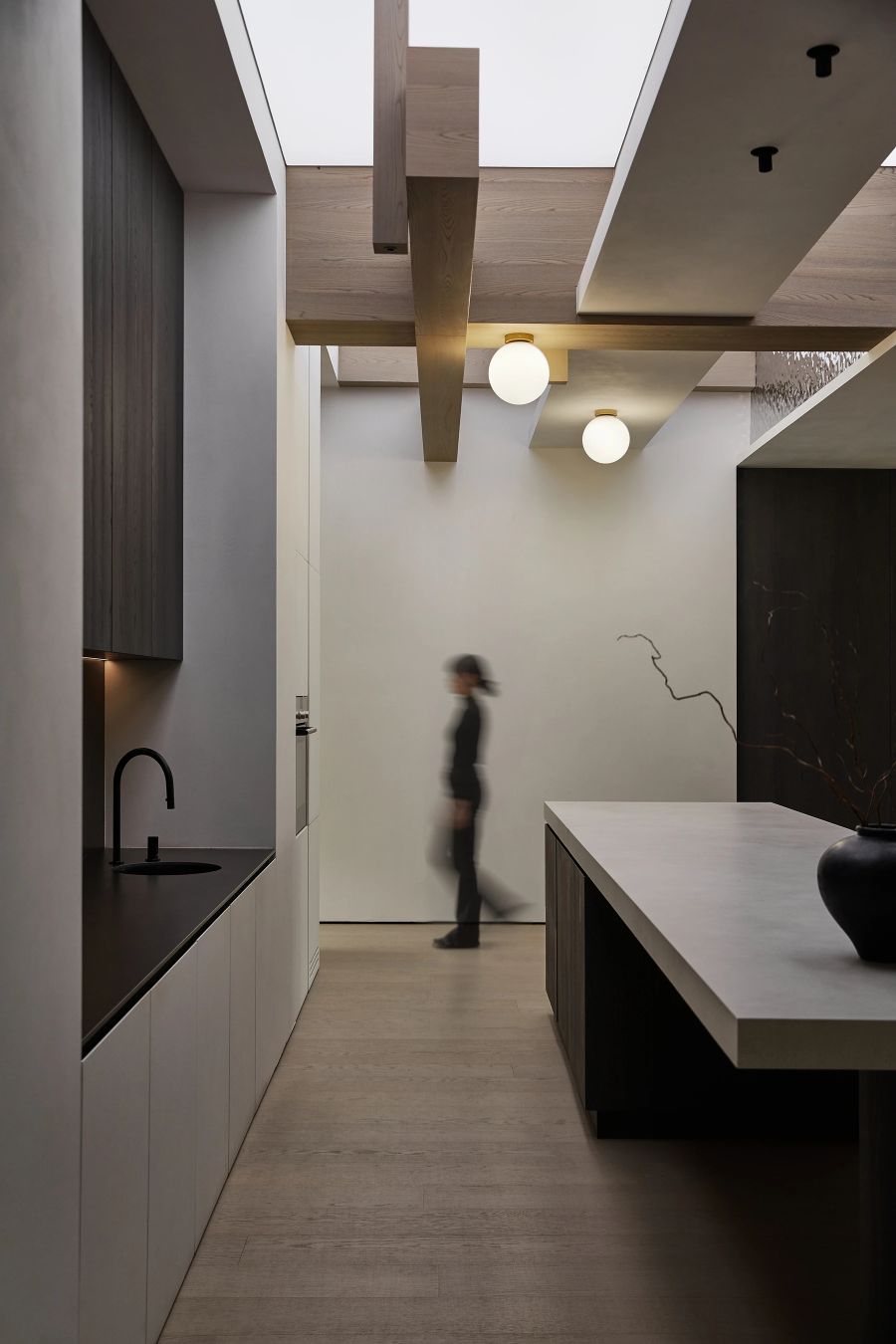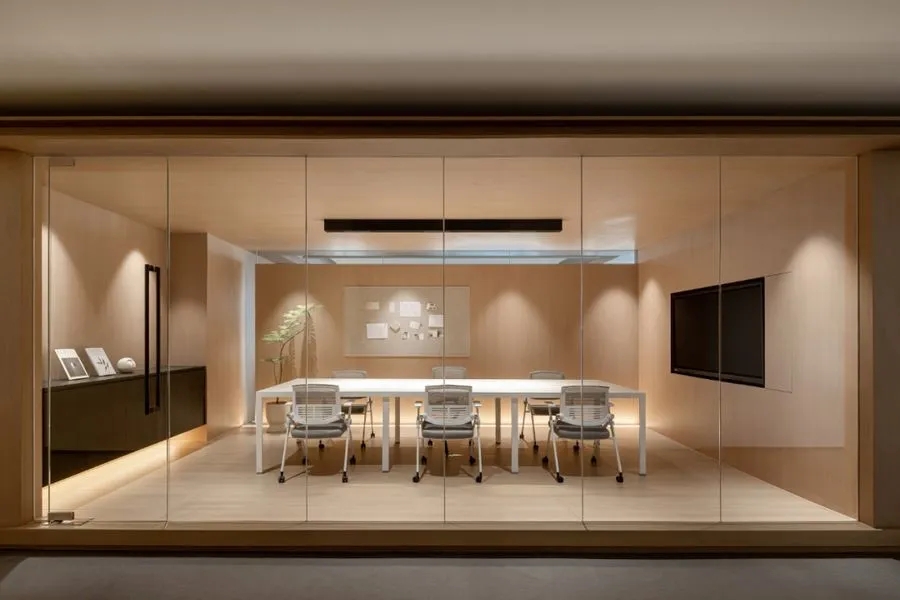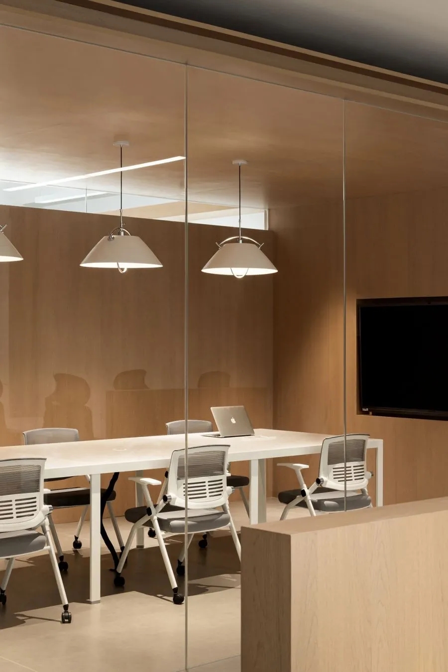 沿过道进入,来到空间的主要活动场所——GTTO 中岛区,作为链接所有空间的纽带,承载着日常休闲、友人接待、办公服务以及情感转换的功能。由于此处位于空间的中心位置,四周围绕办公区,尽管在布局上设计师采用开放式结构尽量引入横向光线,但明度上仍然无法满足所要达到的要求。于是在天花处错开部分管道与廊柱,置入变化的软膜模拟自然天光的效果。这一处理也同样为空间带来向上的张力与开阔明朗的结构。