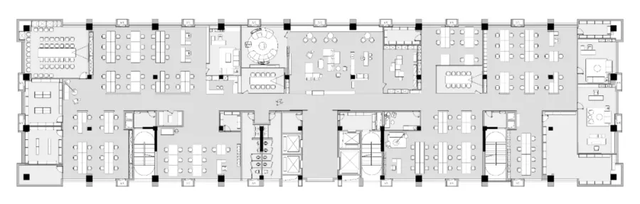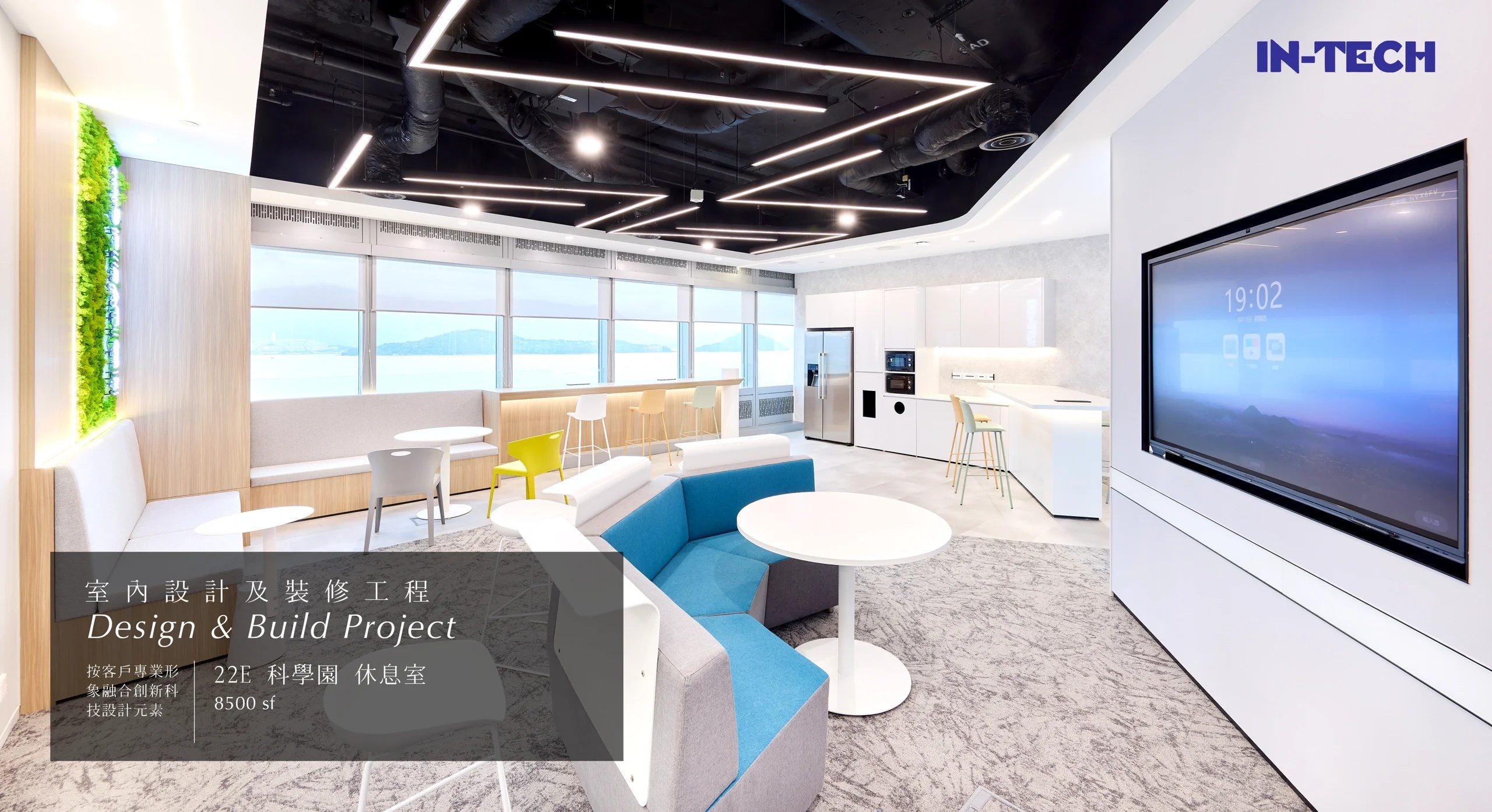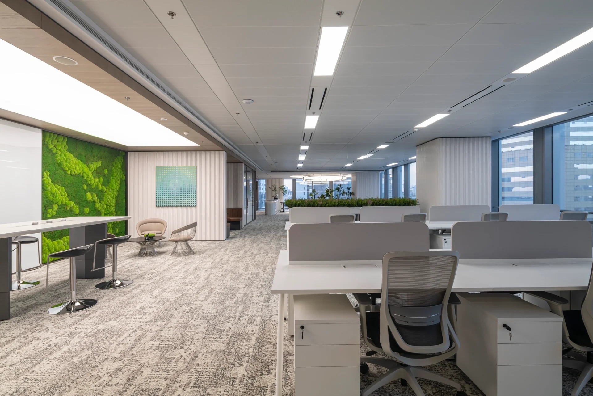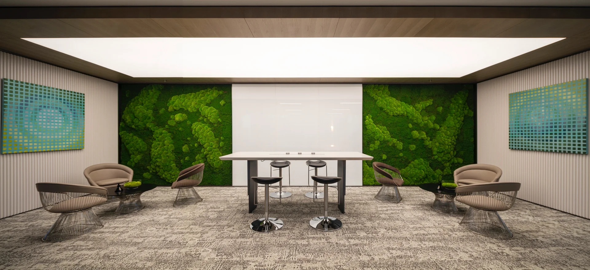 沿过道进入,来到空间的主要活动场所——GTTO 中岛区,作为链接所有空间的纽带,承载着日常休闲、友人接待、办公服务以及情感转换的功能。由于此处位于空间的中心位置,四周围绕办公区,尽管在布局上设计师采用开放式结构尽量引入横向光线,但明度上仍然无法满足所要达到的要求。于是在天花处错开部分管道与廊柱,置入变化的软膜模拟自然天光的效果。这一处理也同样为空间带来向上的张力与开阔明朗的结构。