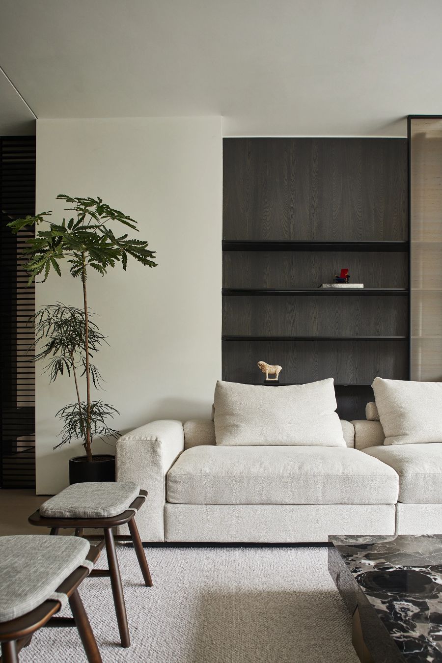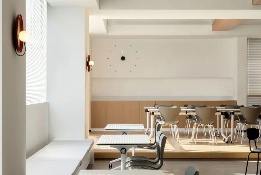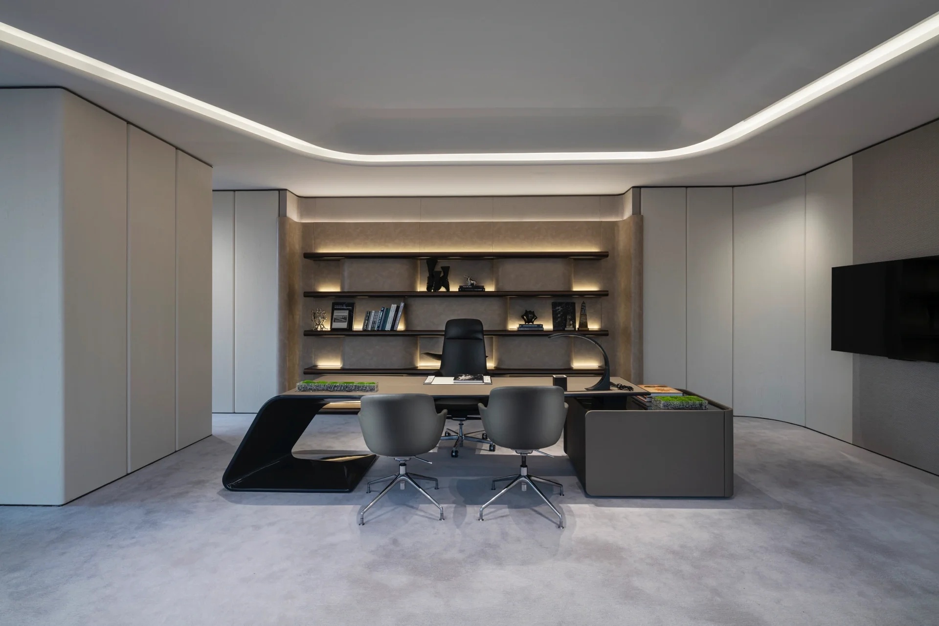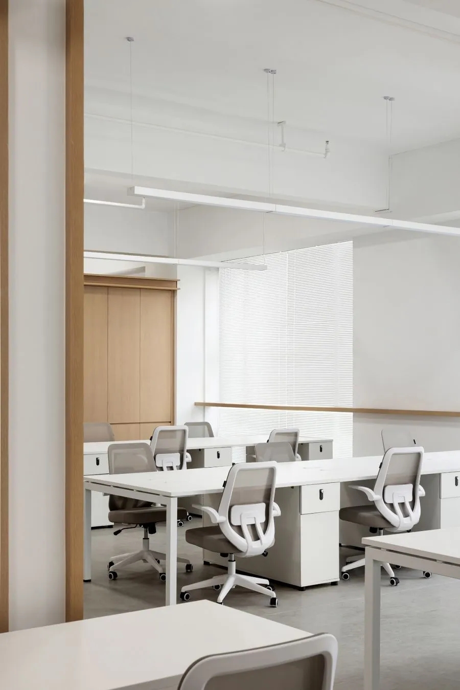 纯粹的黑白体块交错,呈现为严谨有序的办公状态。在生活化场景与办公场景的相互置入中,设计师没有明晰地采取直接的分割,而是更愿意通过融合的方式弱化办公的肃然,即使在工作状态中,也可以通过区域的转换起到放松与休憩的作用。