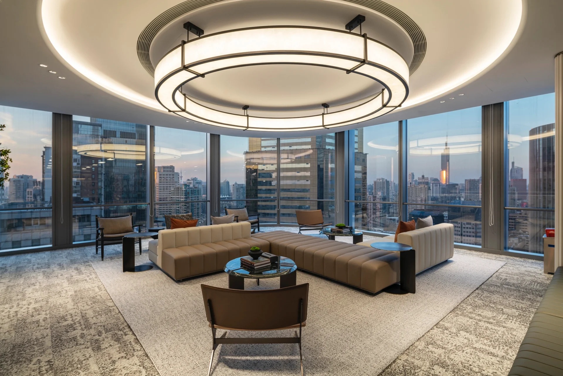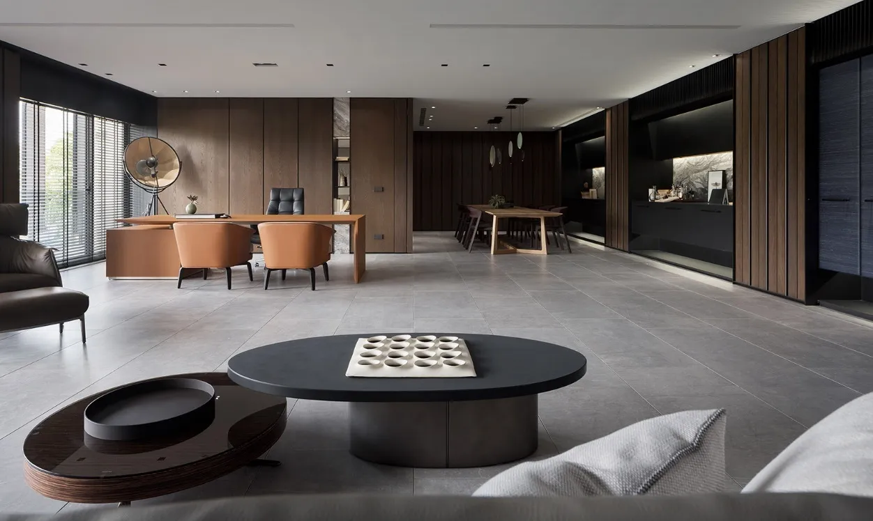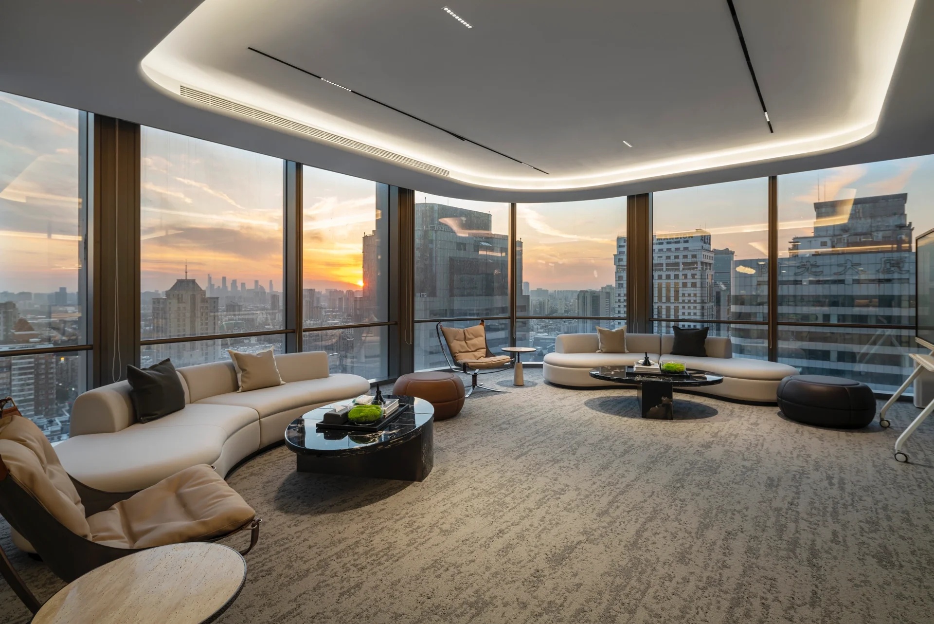纯粹的黑白体块交错,呈现为严谨有序的办公状态。在生活化场景与办公场景的相互置入中,设计师没有明晰地采取直接的分割,而是更愿意通过融合的方式弱化办公的肃然,即使在工作状态中,也可以通过区域的转换起到放松与休憩的作用。