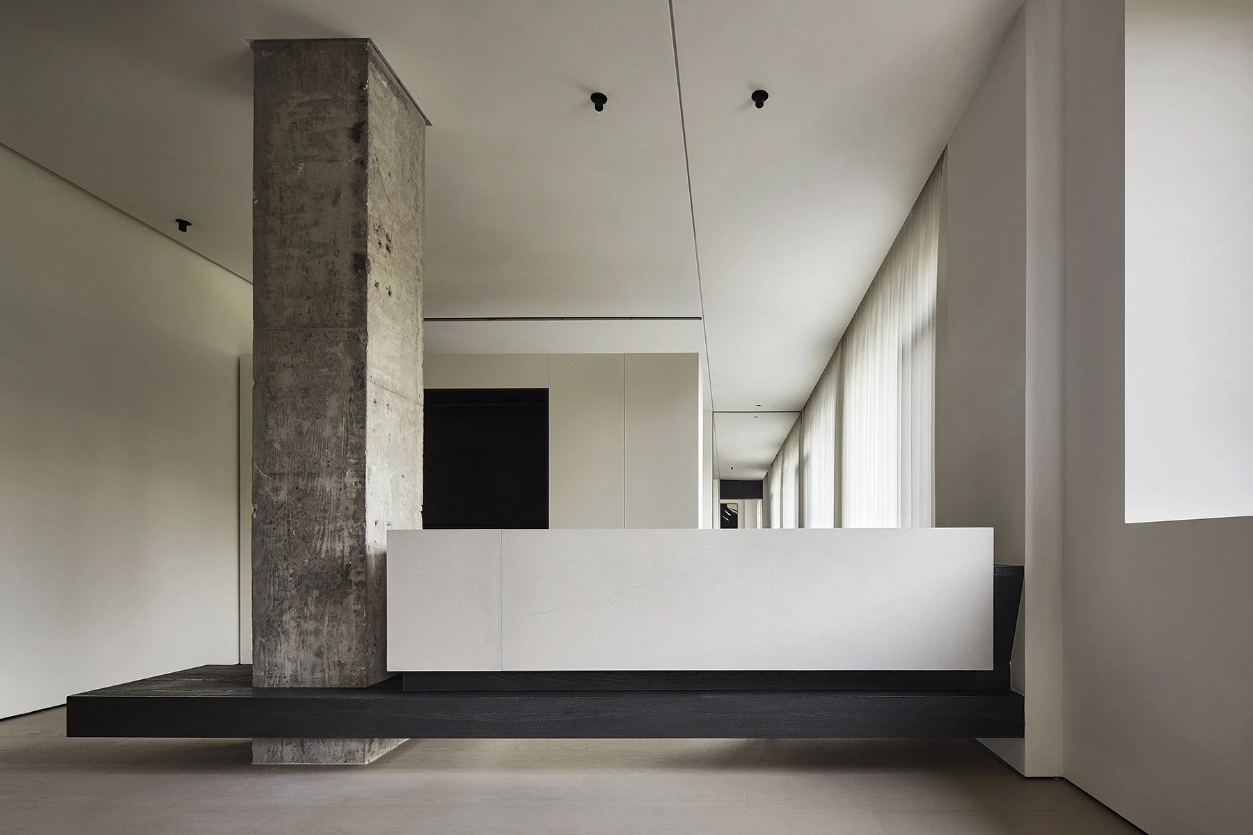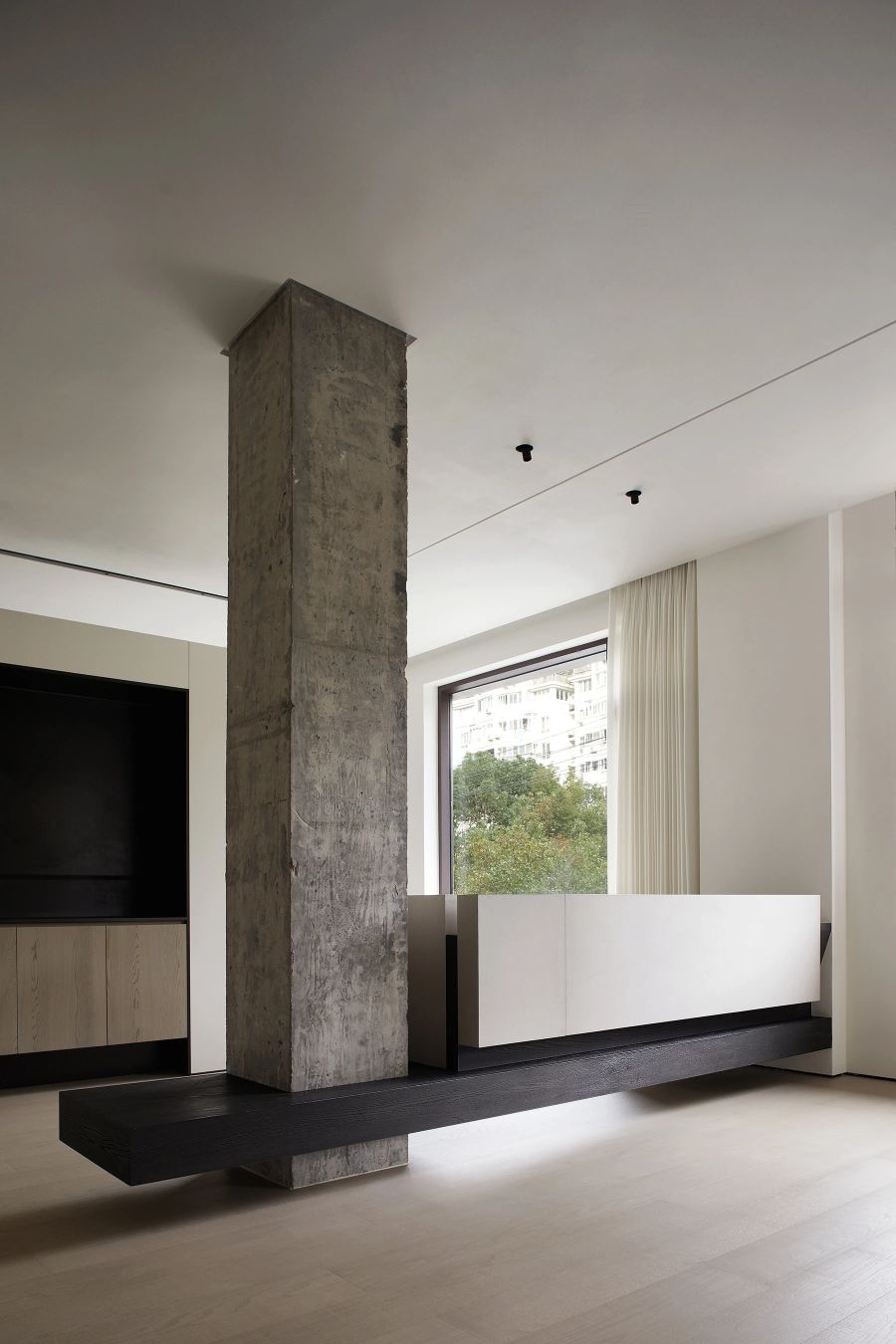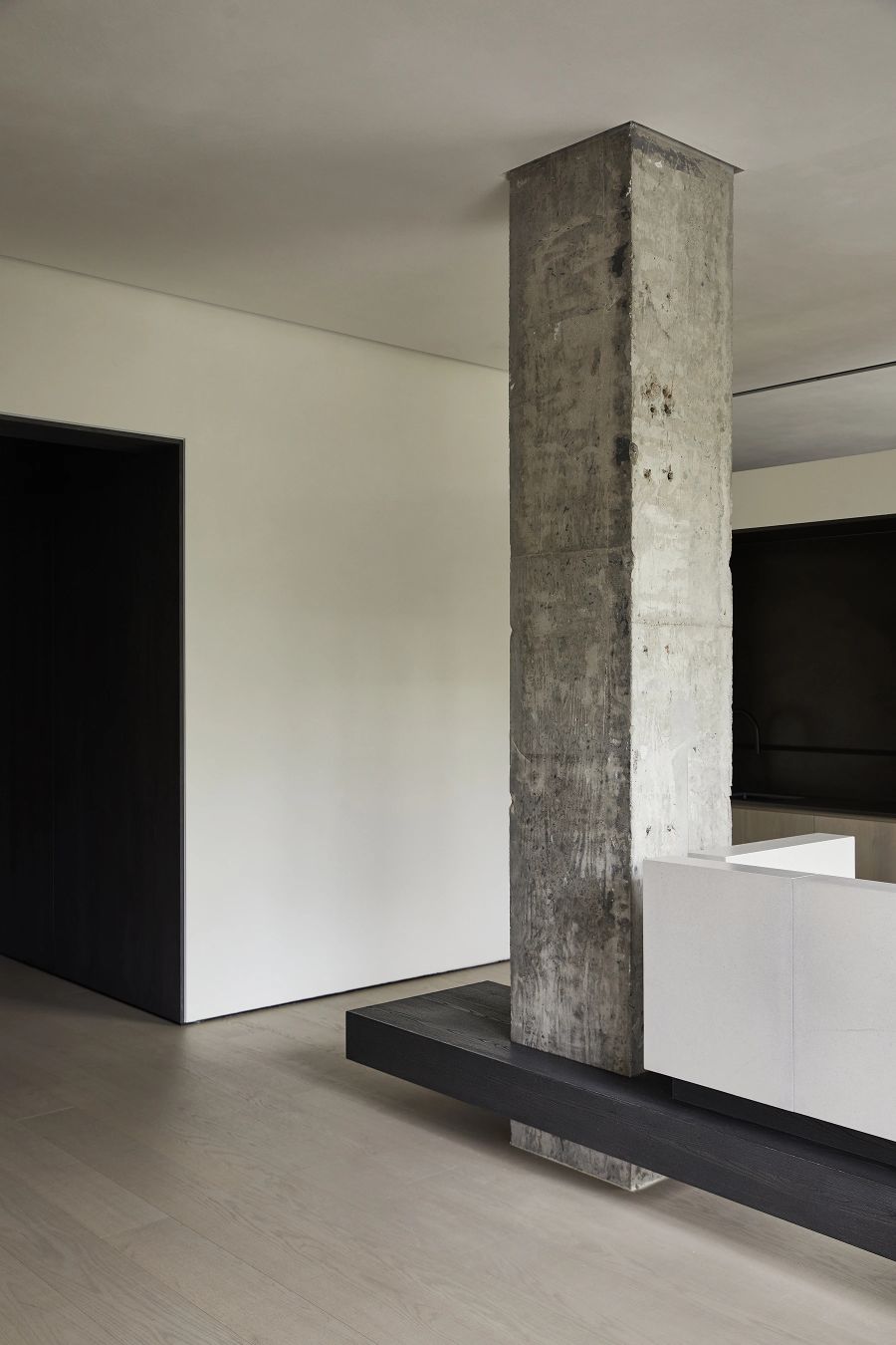 原空间为整层的平面结构,在设计入口时,设计师通过大量的留白,呈现开阔明朗的第一印象。对原始梁柱肌理的保留,让空间在精致与粗犷的对比中,表达着剧烈的反差感,在细腻的表壳下,透着破土而出的张力。