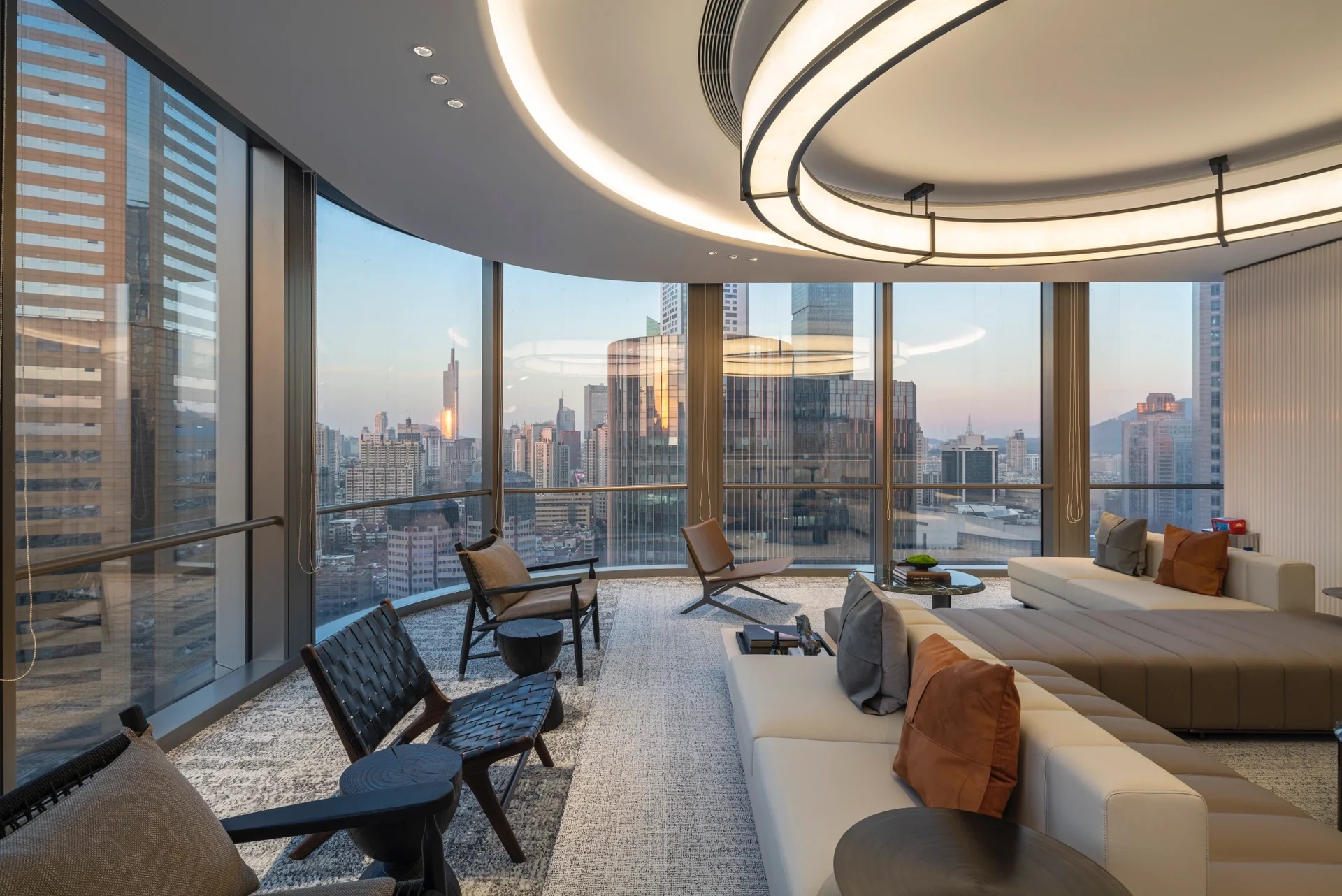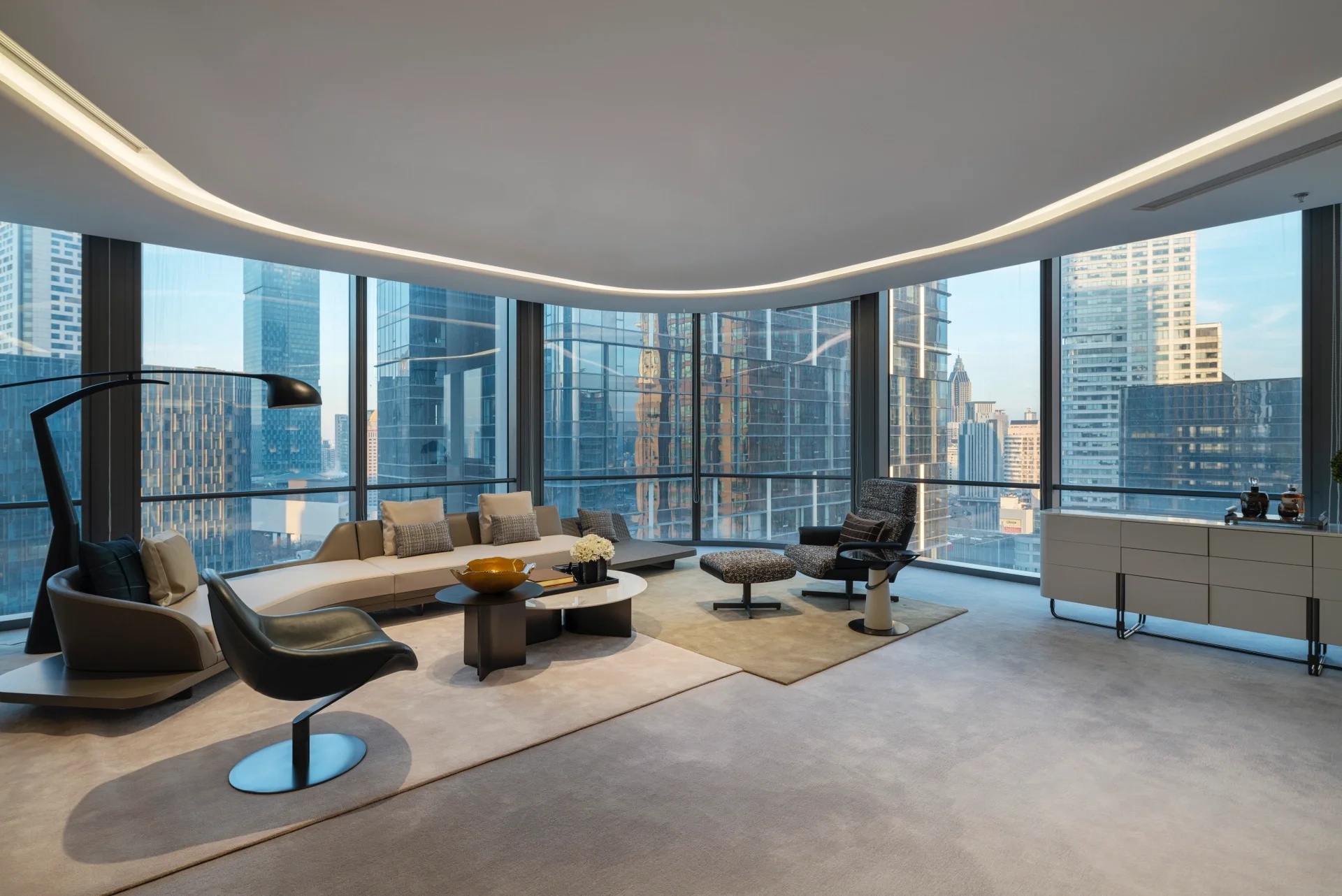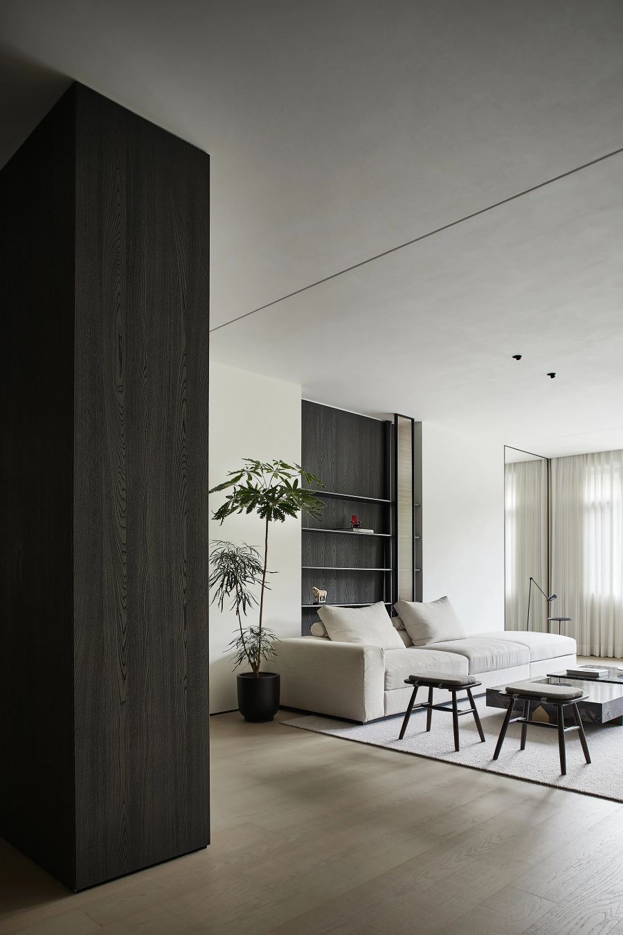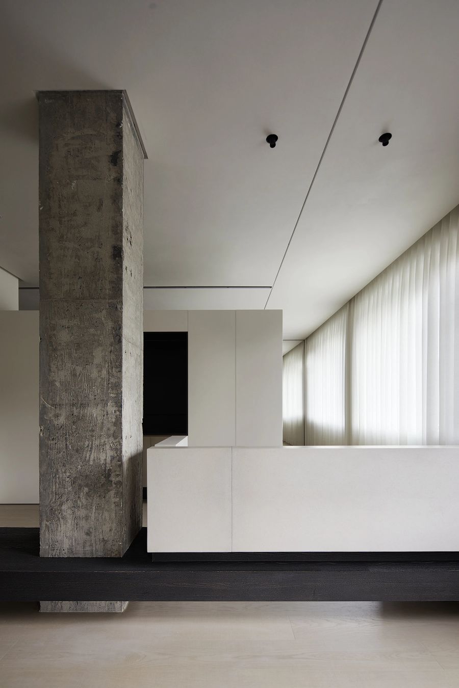 原空间为整层的平面结构,在设计入口时,设计师通过大量的留白,呈现开阔明朗的第一印象。对原始梁柱肌理的保留,让空间在精致与粗犷的对比中,表达着剧烈的反差感,在细腻的表壳下,透着破土而出的张力。