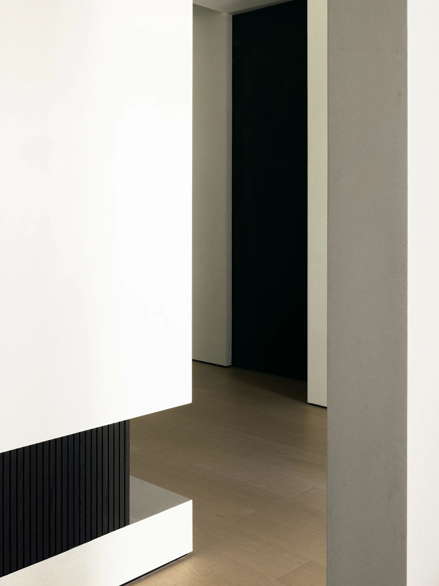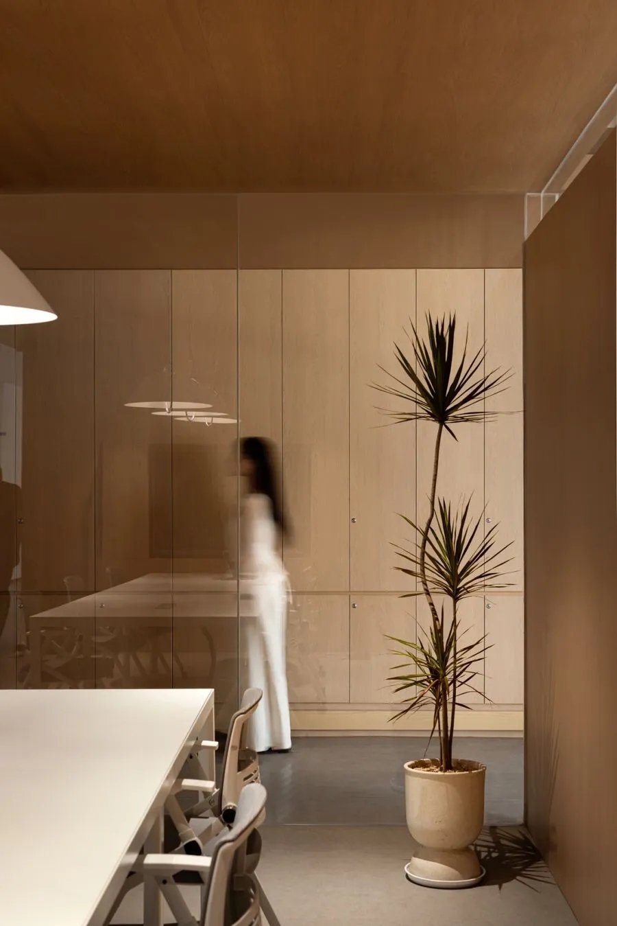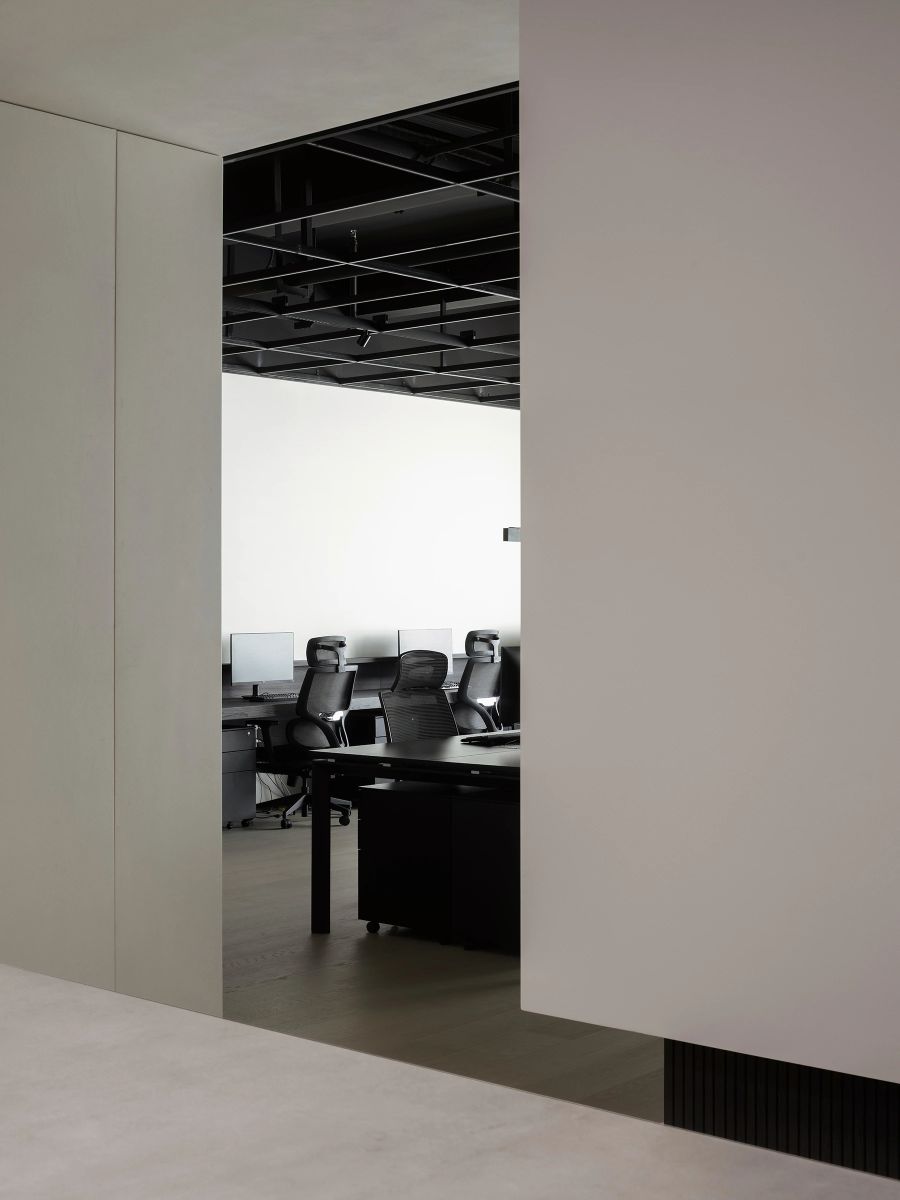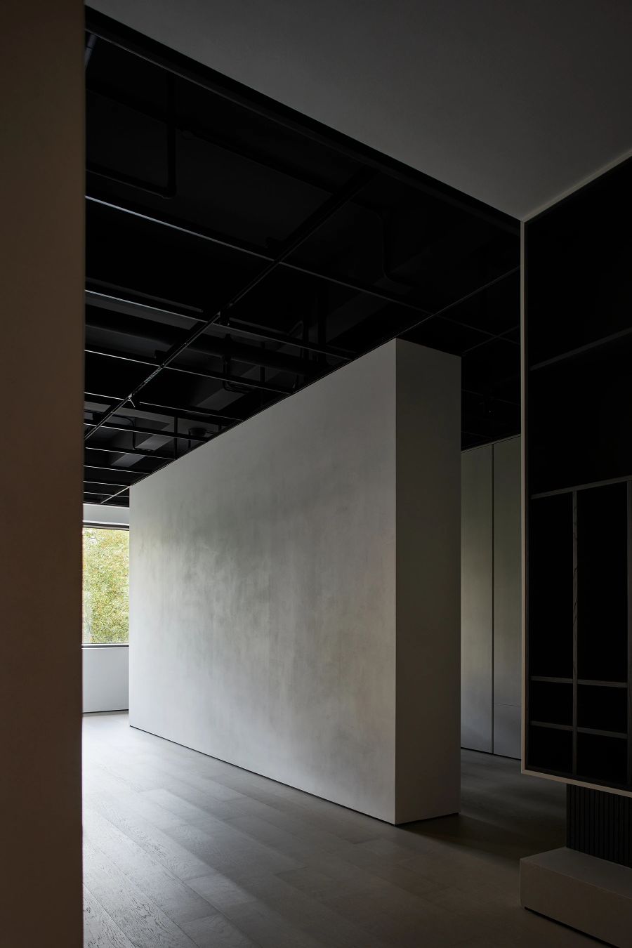 设计师相信建筑的生命感来自其与自然的互动,当室外的绿经过方正的窗落于黑白色系的空间,场景瞬时鲜活。在刻意简化空间内的装饰存在之后,人们的注意力自然被引至户外与对细节处的考量。设计师希望办公空间不光是浅显地用于办公与待客这种直接的商业需求,更是能够体现对于空间设计的态度与理解。