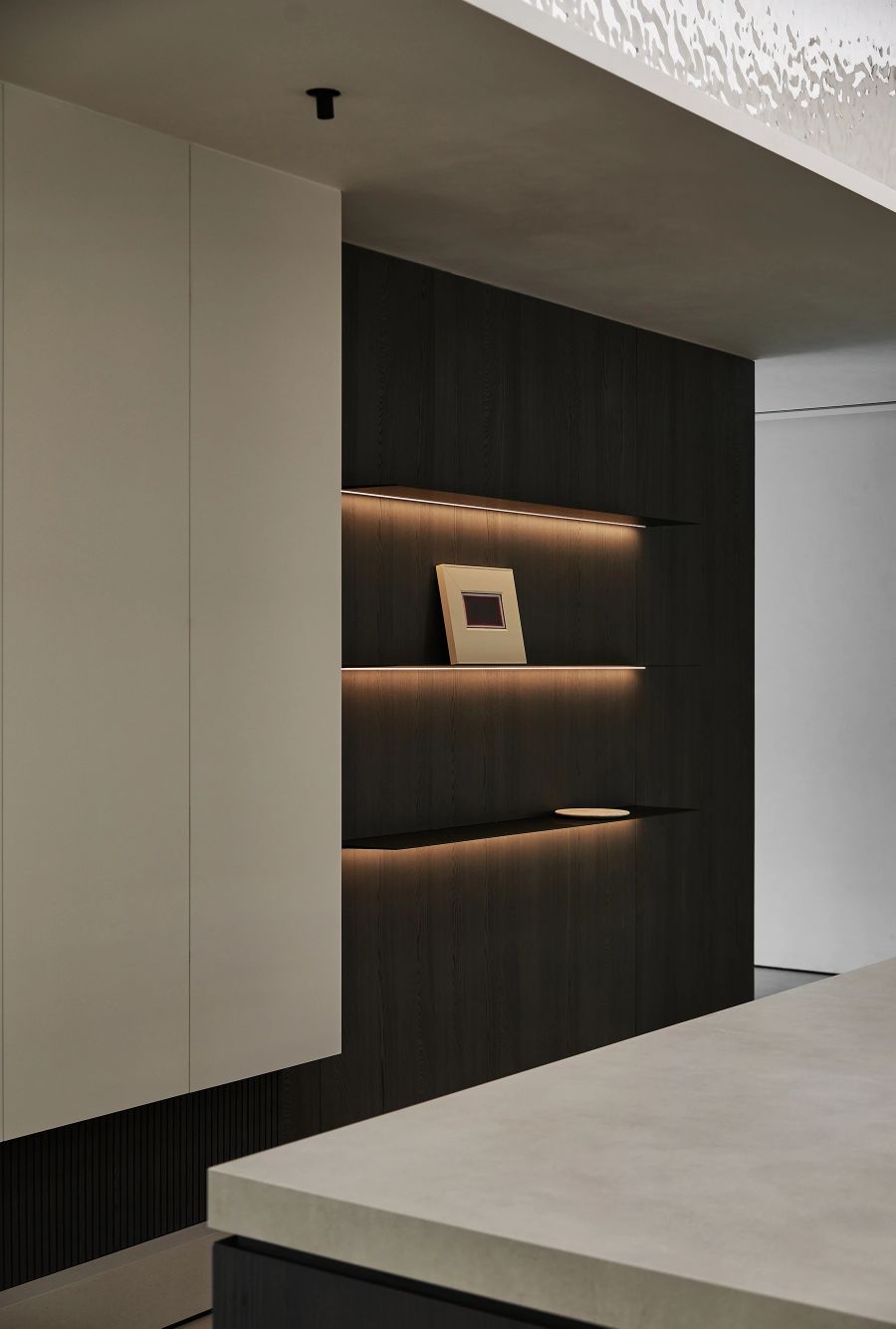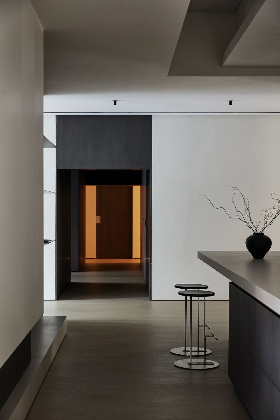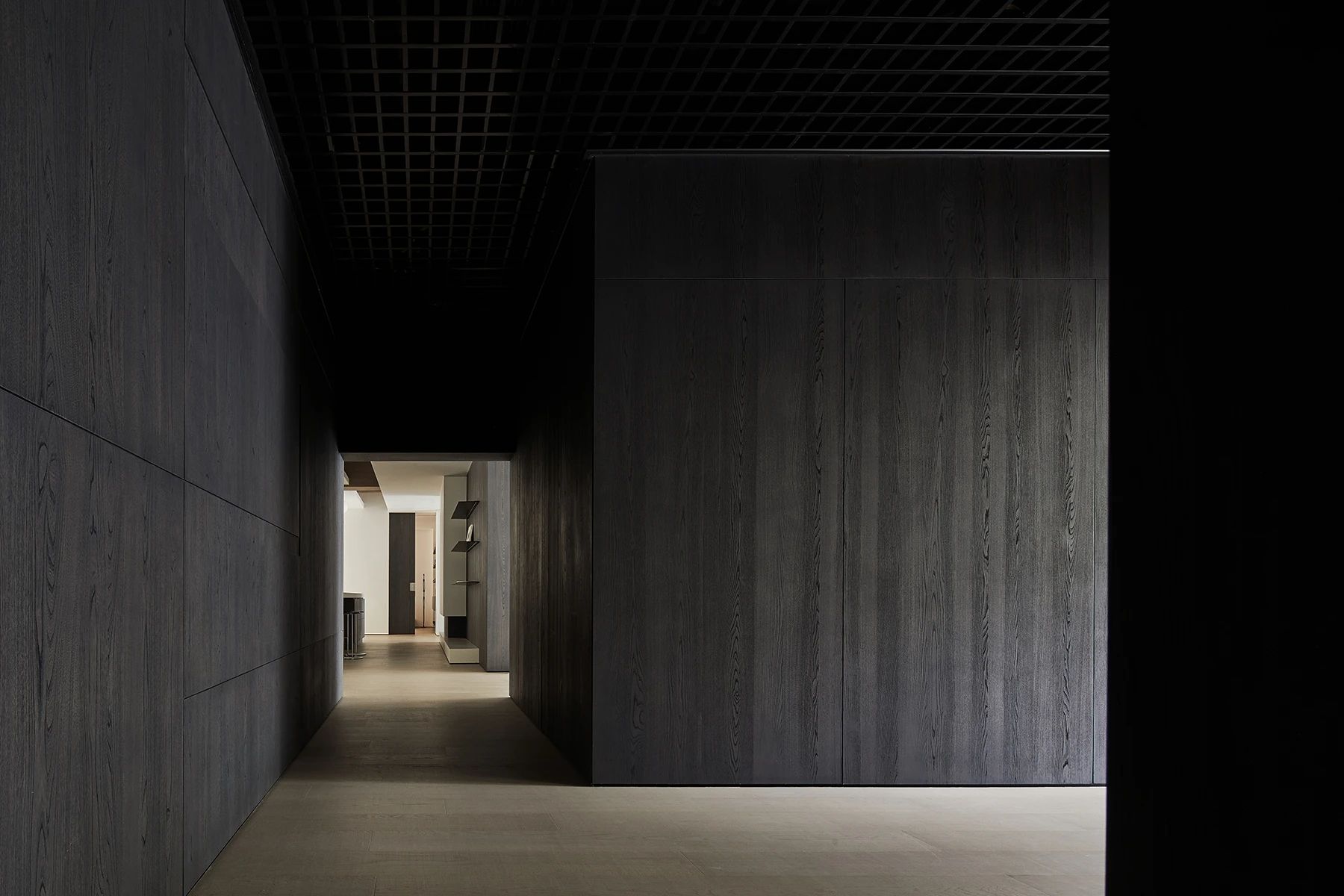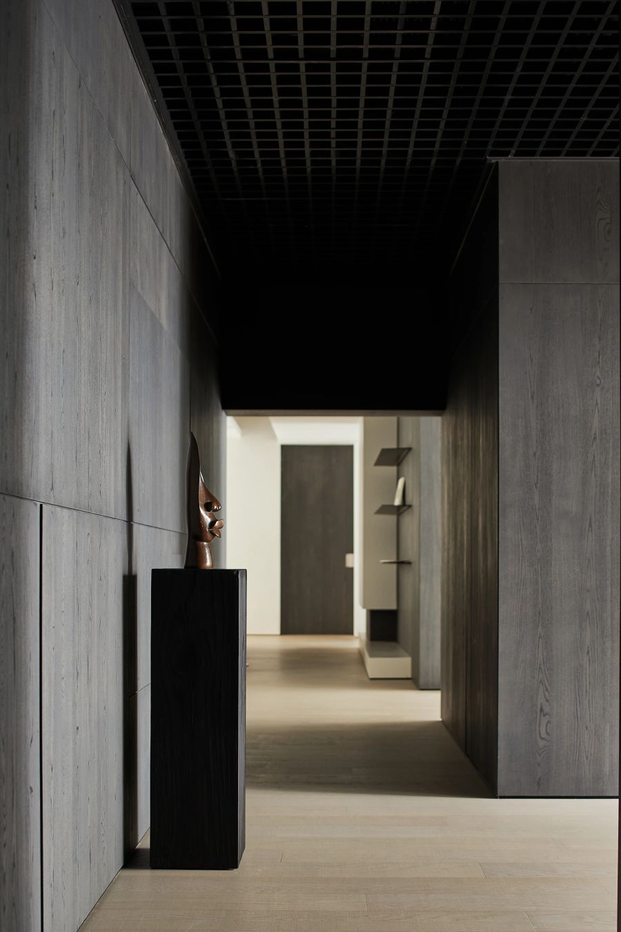 由于过廊处梁柱的压迫,空间中心必然会有光线较弱的阴暗面,于是设计便顺势而为,在暗区设置环形廊道,寓意设计作品在面世之前,经历的漫长煎熬与等待。同样的,廊道作为空间对外与对内两向区域的链接点,也成为天然的隔断,引领访客驻足于明亮宽松的待客区域。
