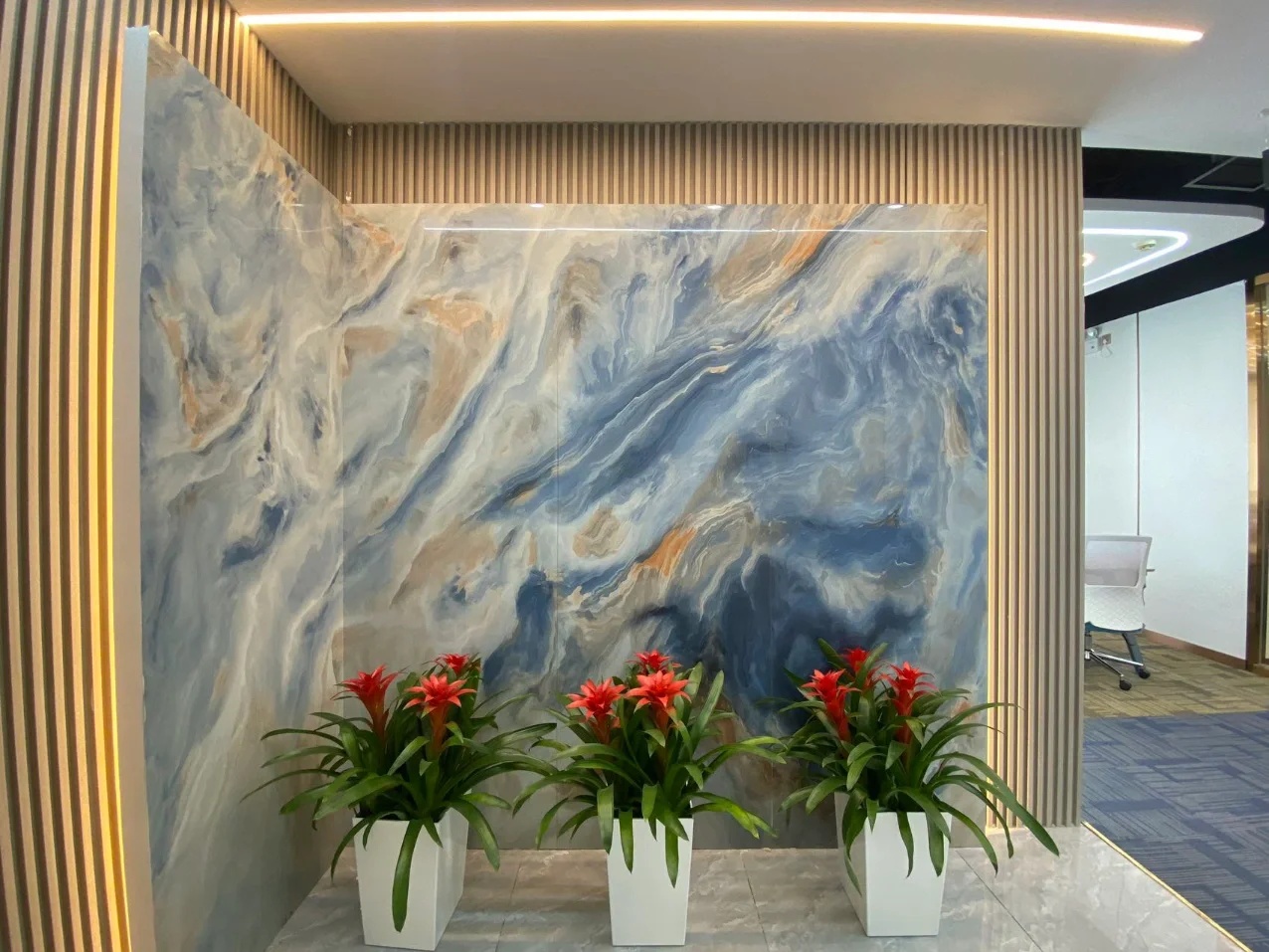错落有致的叠级造型,背景光洁的石材上,光线倾泻流淌金色入目,绚烂瑰丽!