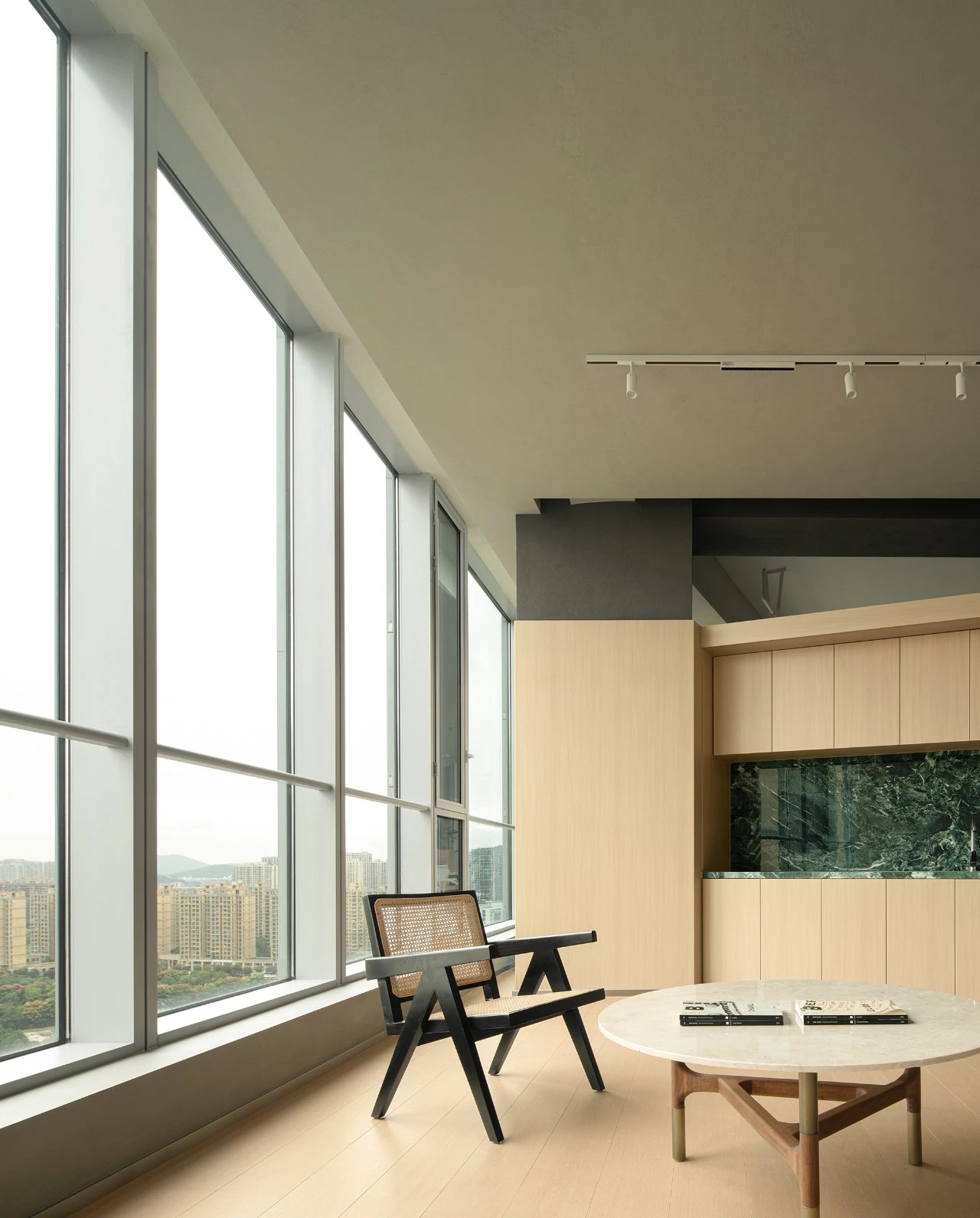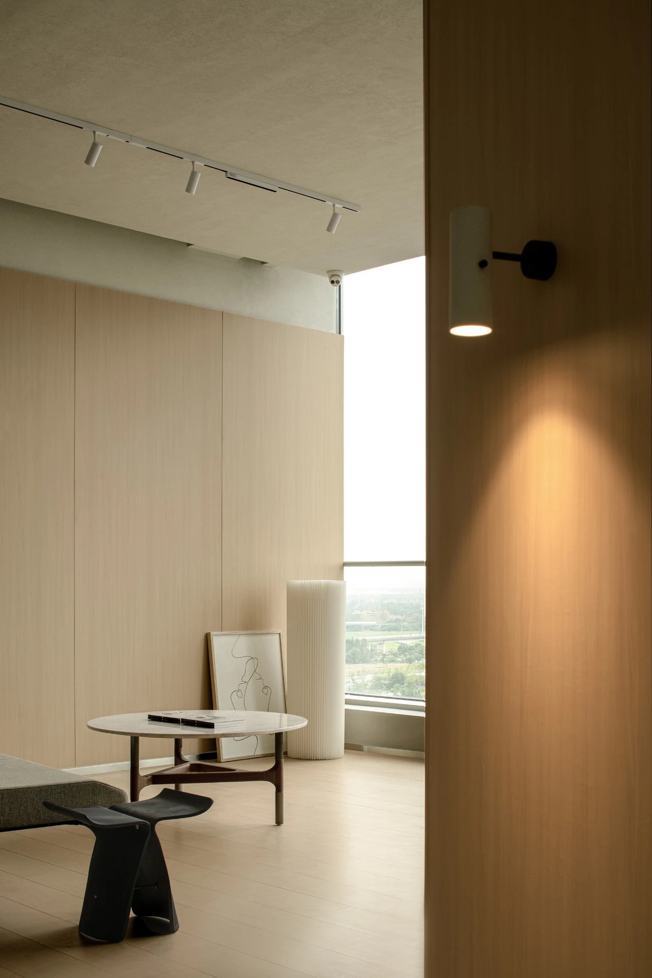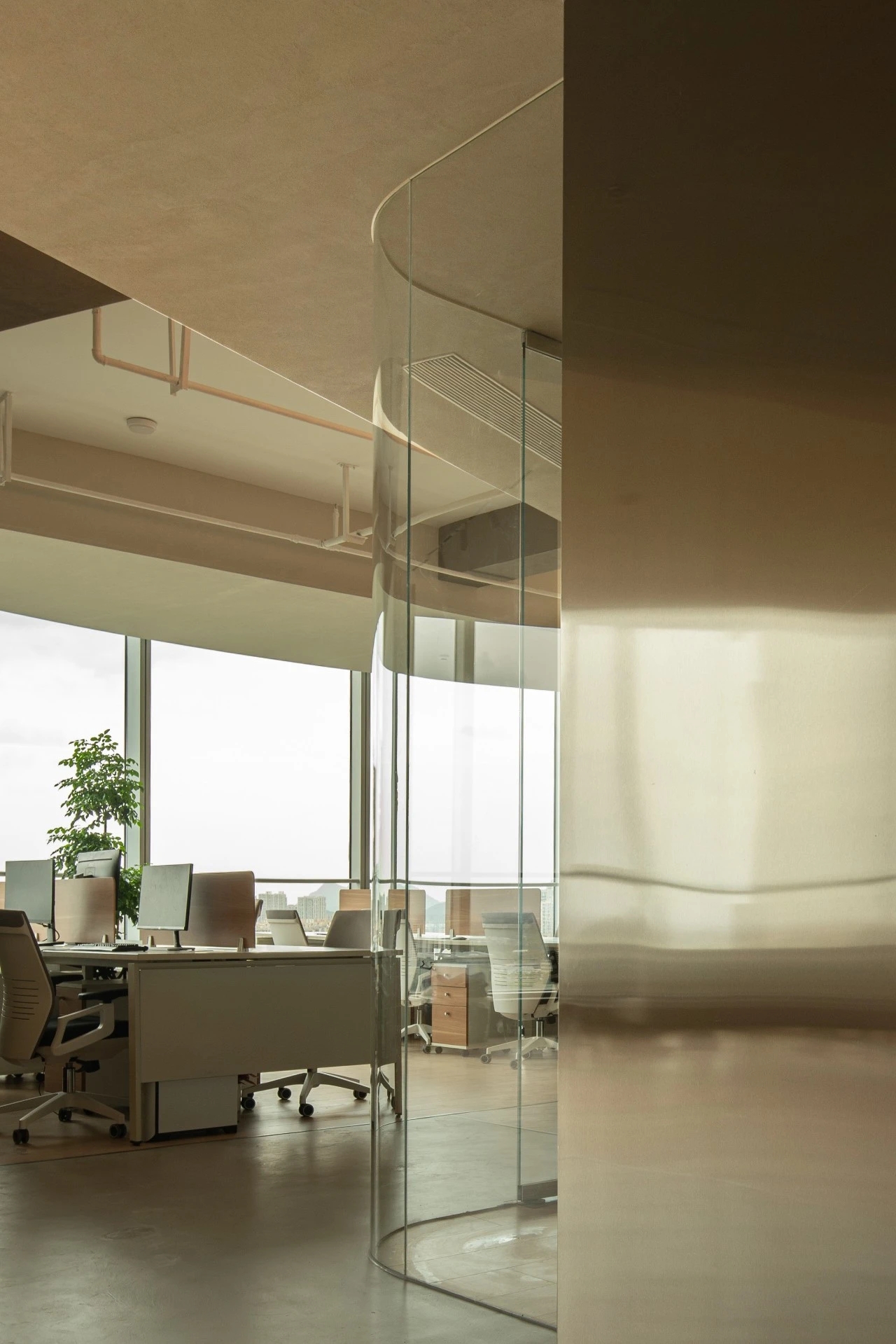 会议室空间采用圆弧形透明玻璃,会议桌和简约座椅的搭配凸显出整个空间,现代温暖的特性,会议室一角的沙发和茶几则便于简单会客。办公空间整体使用了原木色调的现代办公桌椅,搭配绿植简约而不失简单,圆弧形落地窗可以俯瞰整个城市天际线。