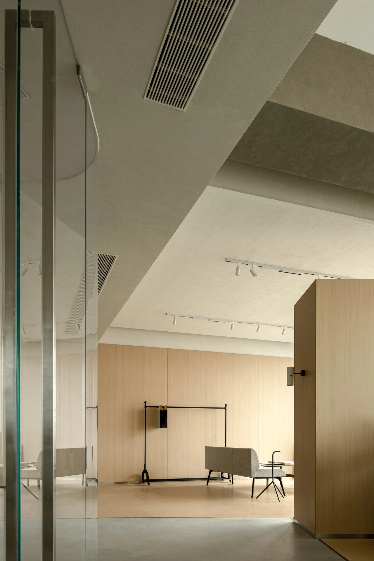 前台区域采用拉丝不锈钢板和墨绿色岩板做搭配,配合射灯打出整个空间氛围,凸显出企业现代而优雅的整体企业调性。这是一个开放,包容、舒适的办公空间。设计师希望通过对空间的建构,利用几何分割,划分出既清晰又包容的使用功能,也是希望与原结构的弧形空间做一次交流与融合。