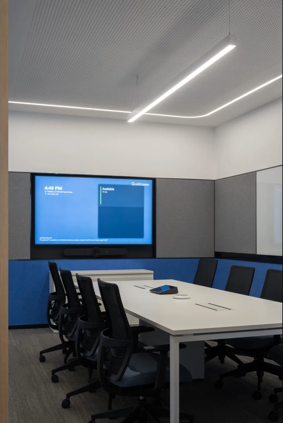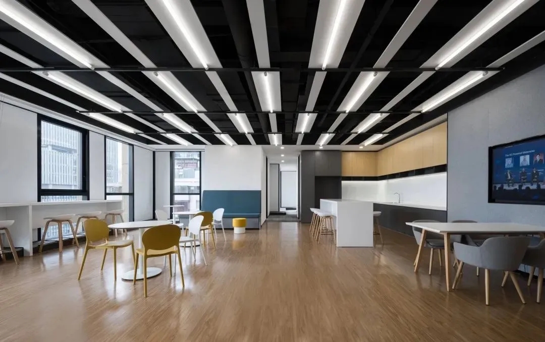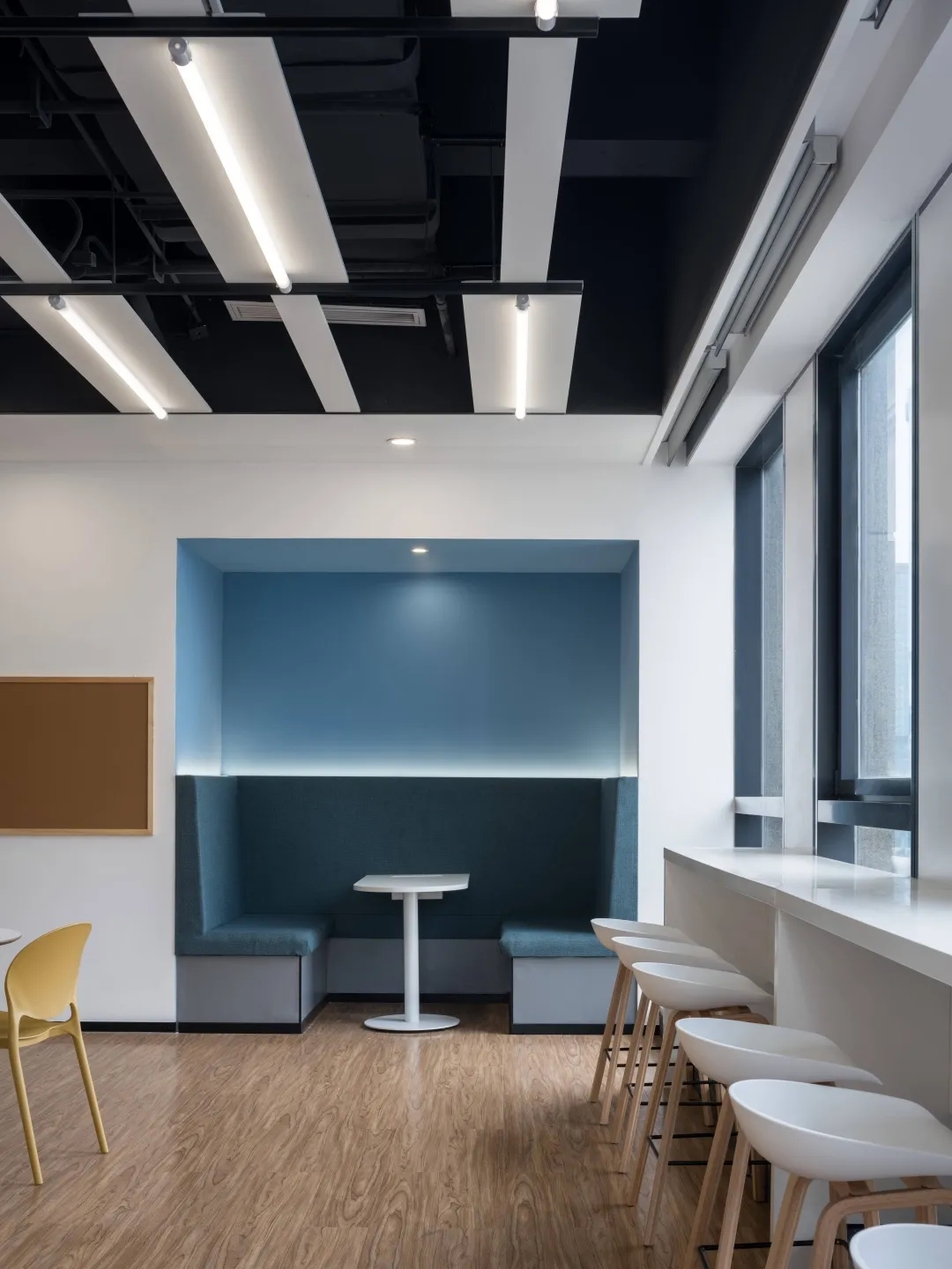 公共功能区位置选择在入口接待处的背后,利用该区域宽敞的空间以及充足的自然照明,汇集了多样的公共功能。开放式的布局设计,使得大堂与茶水间之间形成相互连接的空间,充分发挥了这一区域的动态性和多功能性。 天花板的长条形灯条体块交叉,营造出漂浮感以及强烈的反差感,将室内空间与外界构成了对比,内与外均是宜人风景,也让内部空间从外界之中凸显出来。