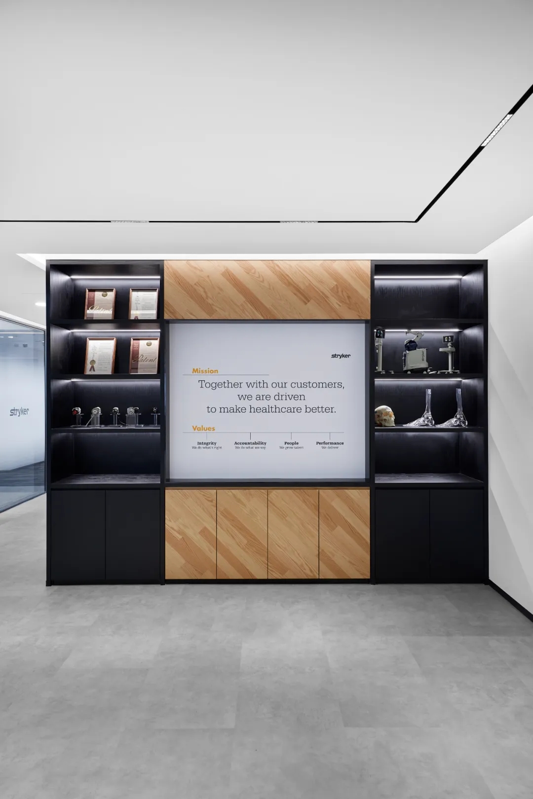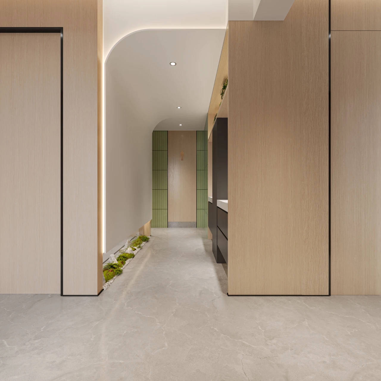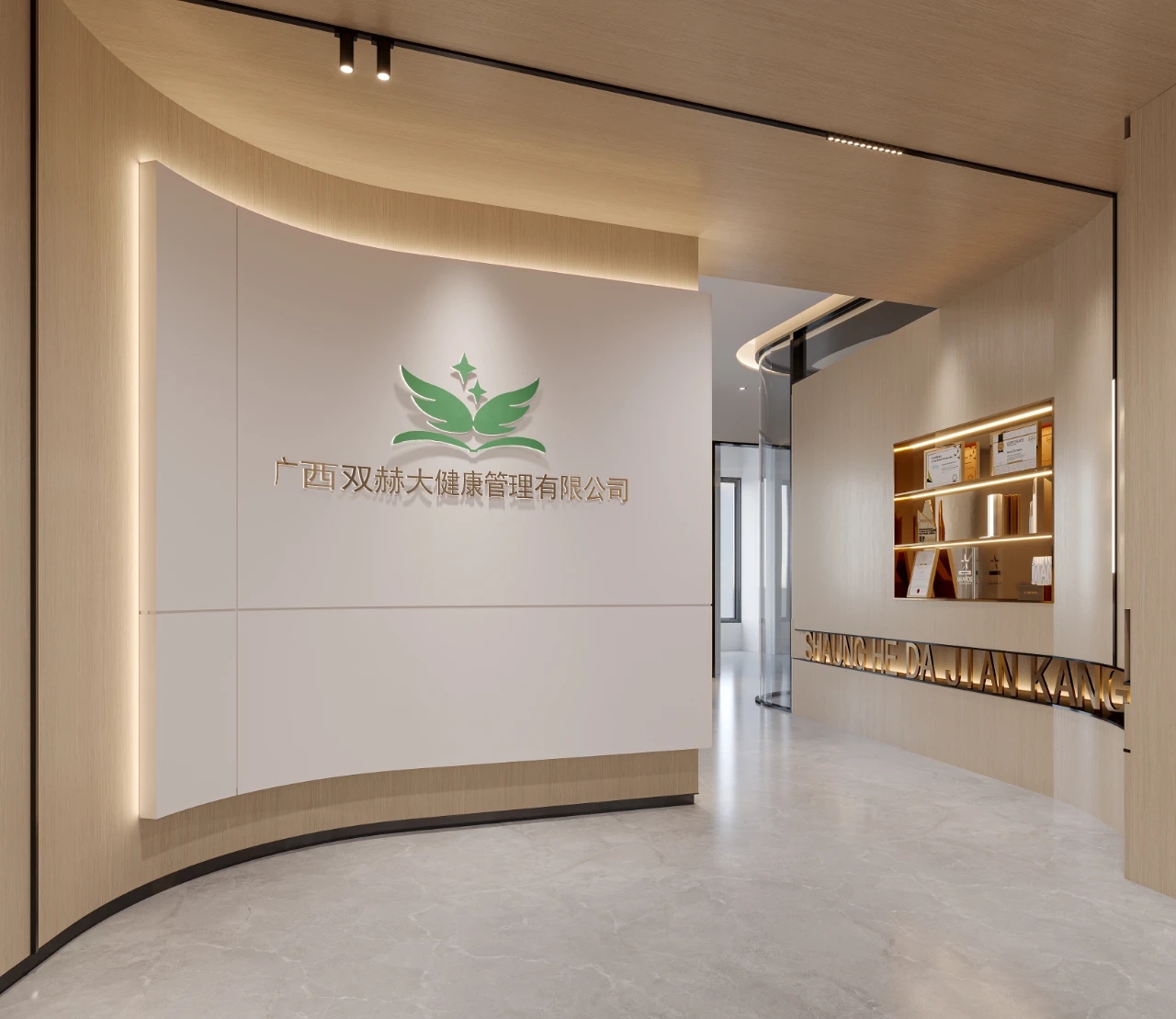 入口处,以原木作为主要材质,原木加灯带,使整面的背景墙简约又舒适。右边的镂空字设计,让空间更有立体感。