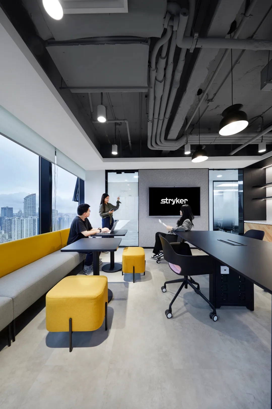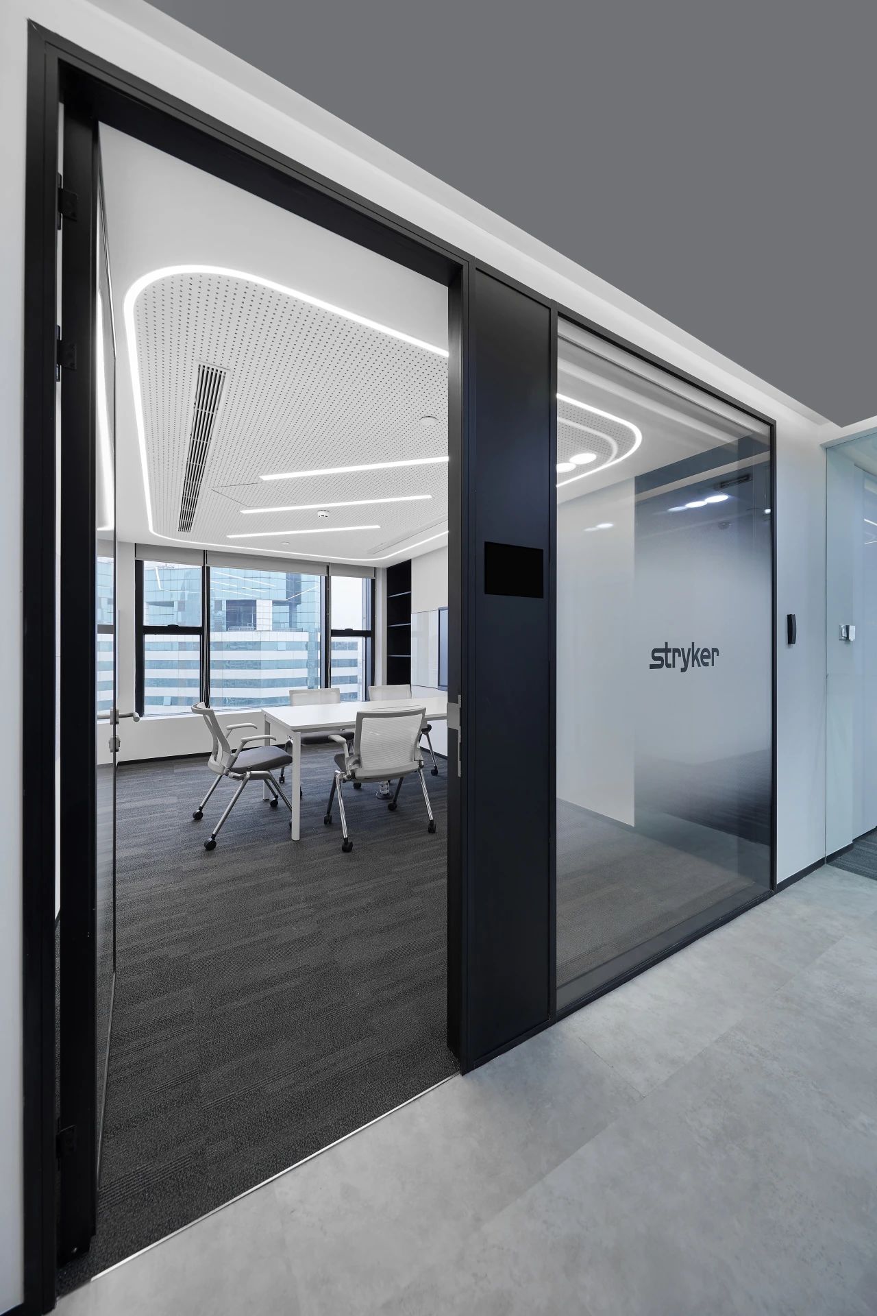 每个独立办公室,都选择半透明的窗帘,让阳光自由光线,减弱眼睛疲劳感。在办公室内添加一些简约的艺术品,抽象绘画作品和摄影作品,增添艺术要点。