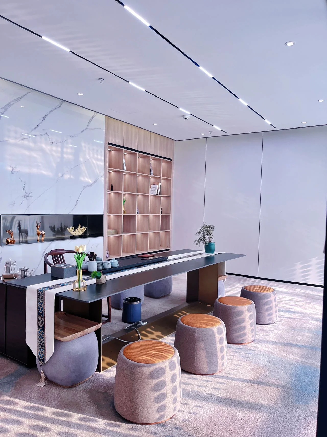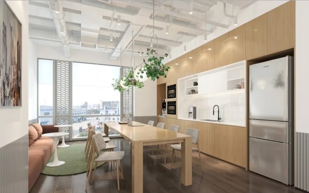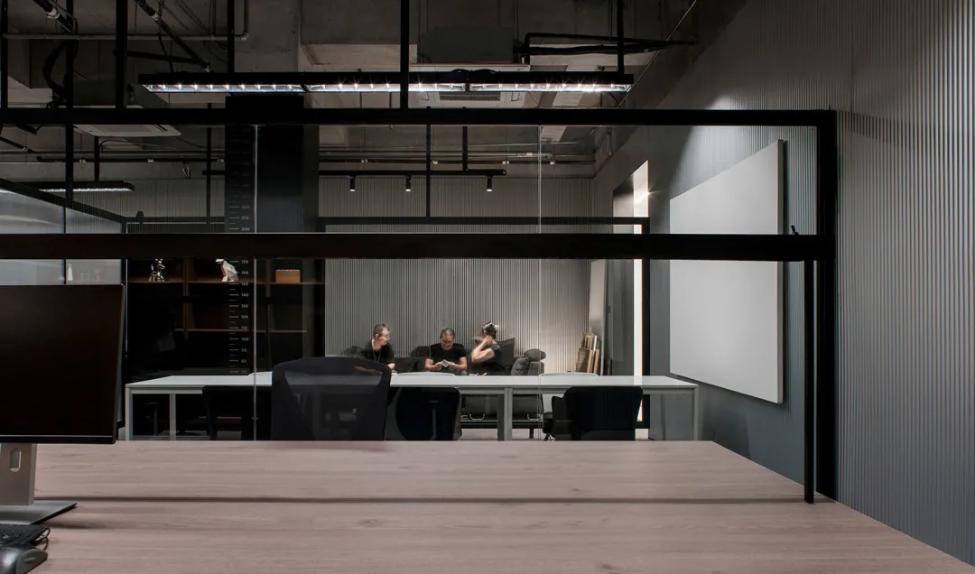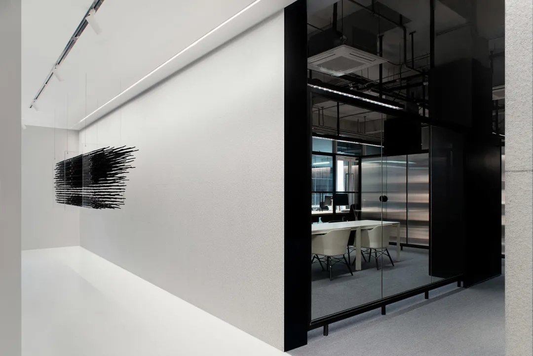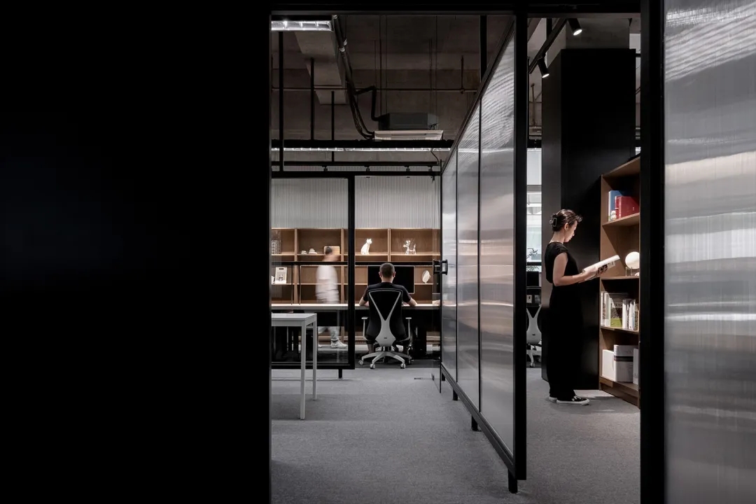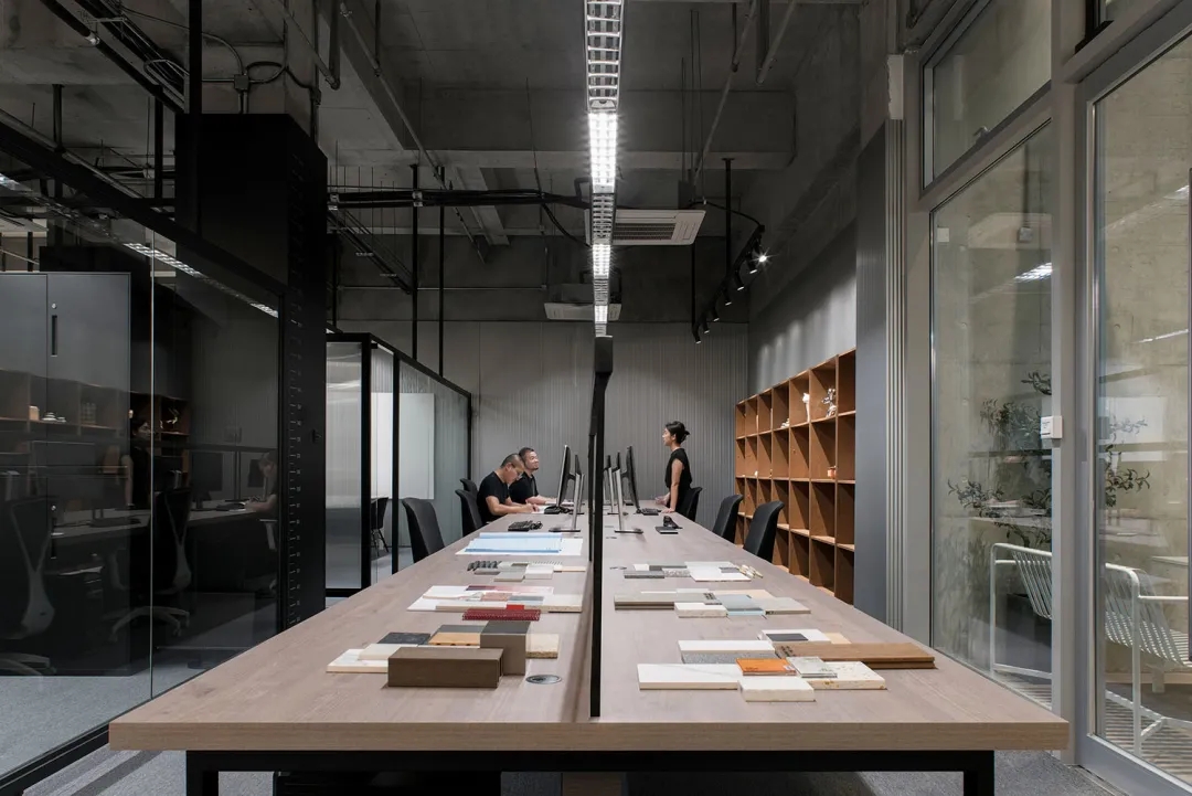 开放式的设计办公区,超常规的办公桌尺寸,以及桌面上方独立的照明控制等,在满足设计师日常工作需求的同时,兼顾了团队日常沟通讨论和办公舒适度的平衡,并且通过各个空间之间的互相联动,建立了一个平等、融合的工作氛围。办公室的次入口,与主入口一样都面向街区的公共走廊,是空间中另一处“现”的区域,我们在这个半户外空间设置了一个户外休闲区,既为社区住户提供日常休闲座位也适用于公司更多不同的办公情境。