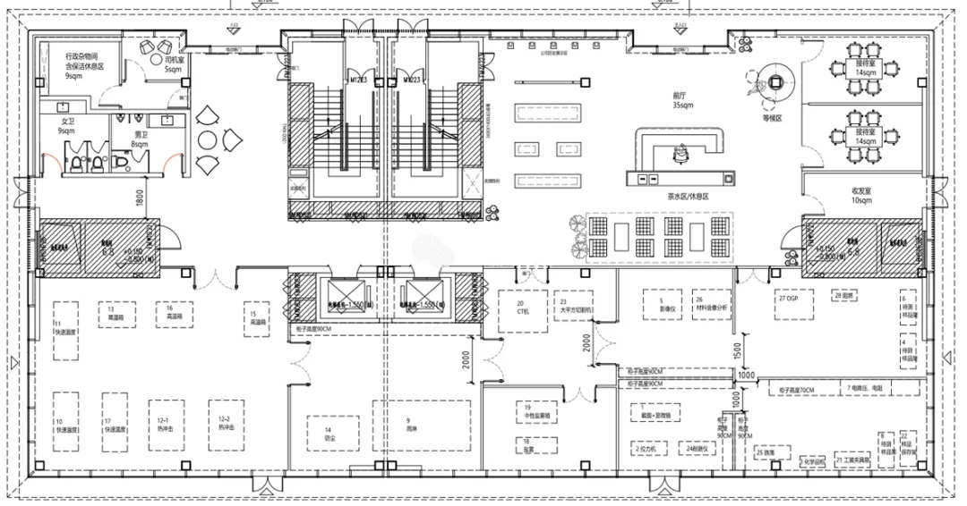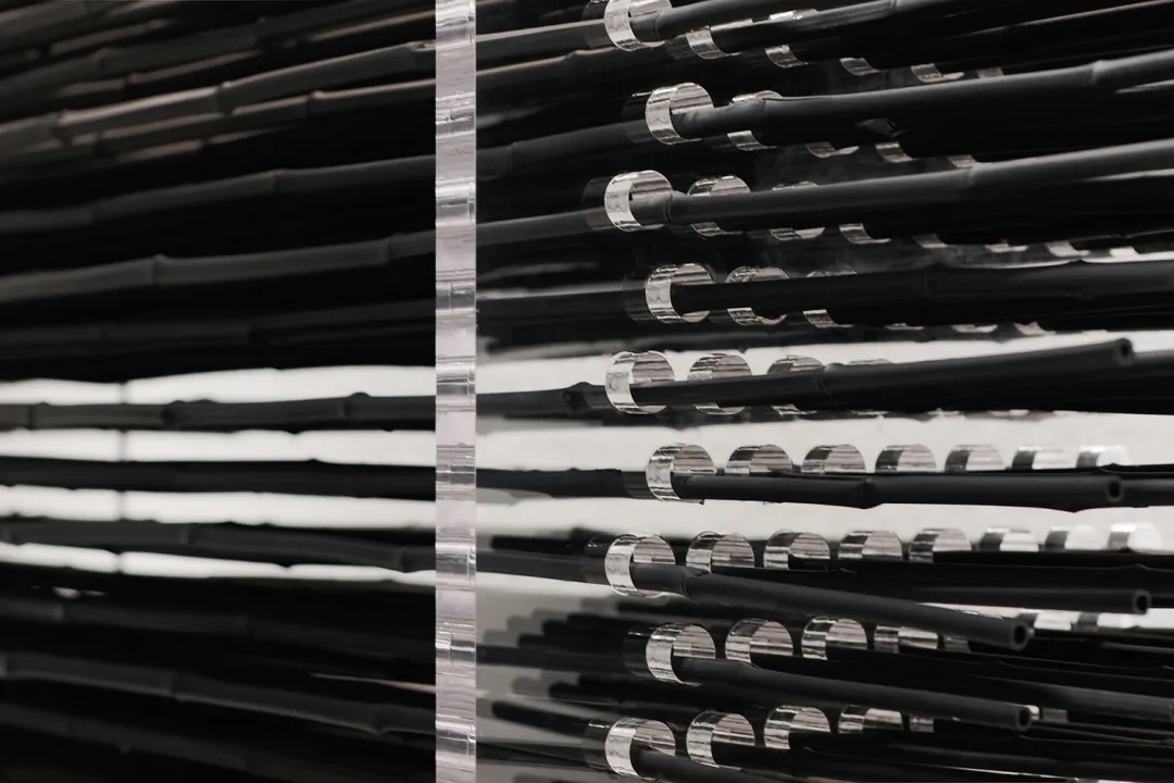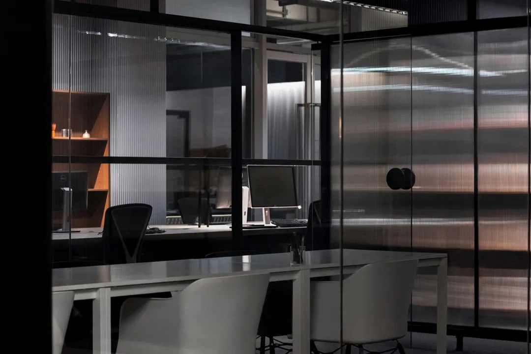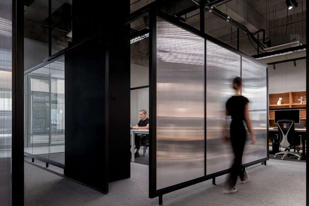 银灰色的镀锌波纹板包裹整个办公区墙体,其纵向的肌理与透明盒子隔断的双层阳光板、以及辅助区的大面积白色布帘,在肌理上互相呼应,但三者纹路疏密不一、质感冷暖相依,使整个空间在视觉上简洁统一又富于变化。镀锌波纹板和双层阳光板的纵向肌理互相呼应。