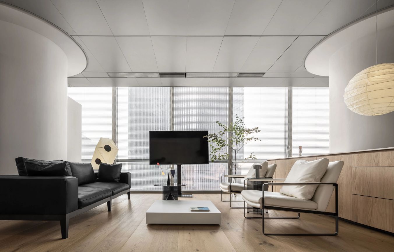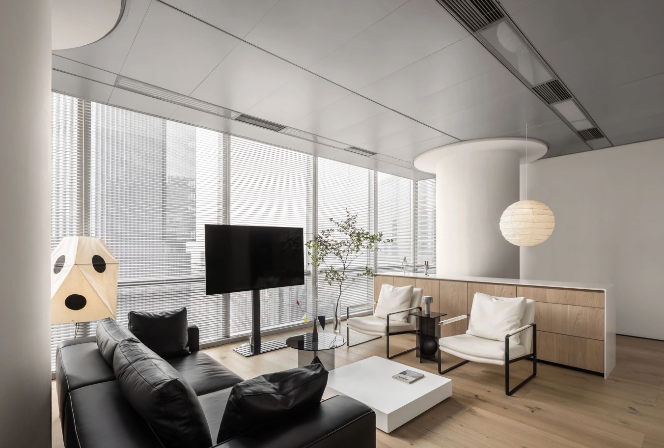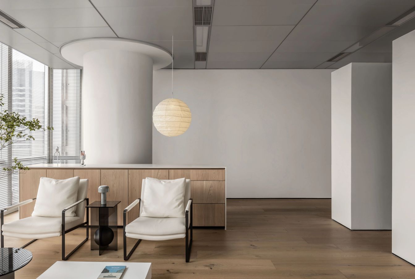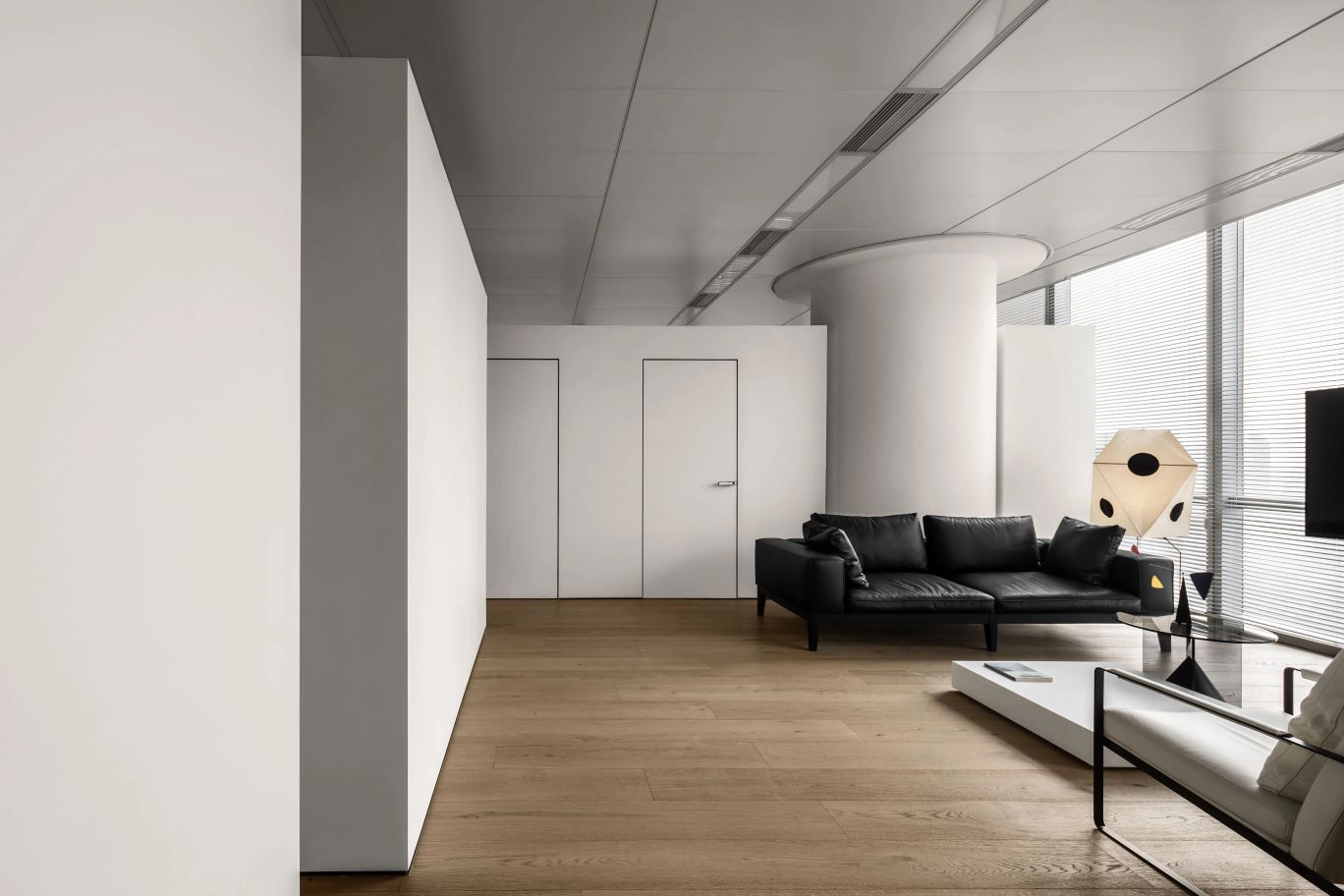 空间入口的纯白背景墙,公司LOGO跃然进入视线,便给予人们无尽的畅想。简洁、安静、自然、永恒的空间气质翩然而至,朴质为表,内里追求自然、艺术、美学的浸润,于自然中探索灵动、隽永、纯粹的设计本真。右转进入空间内,设计师将原有柱子只做了最简单的圈围造型,正所谓“万物初始,大道至简”。在会客区,设计师用浅木色地板搭配纯黑色简洁的皮质沙发,营造视觉空间的跳跃,缔造和谐宁静的会客氛围。