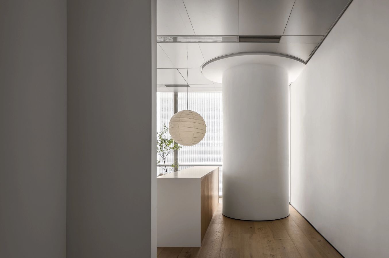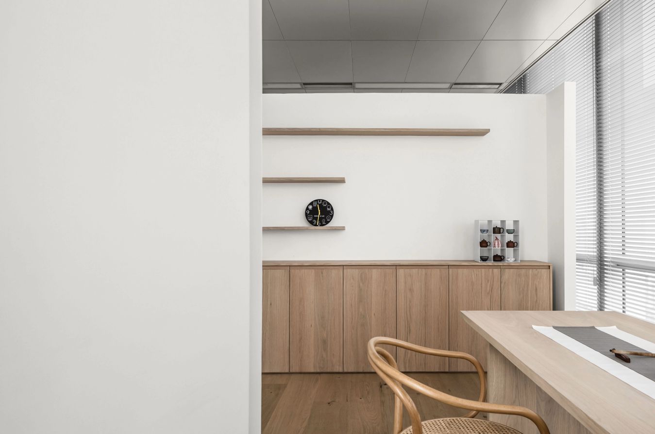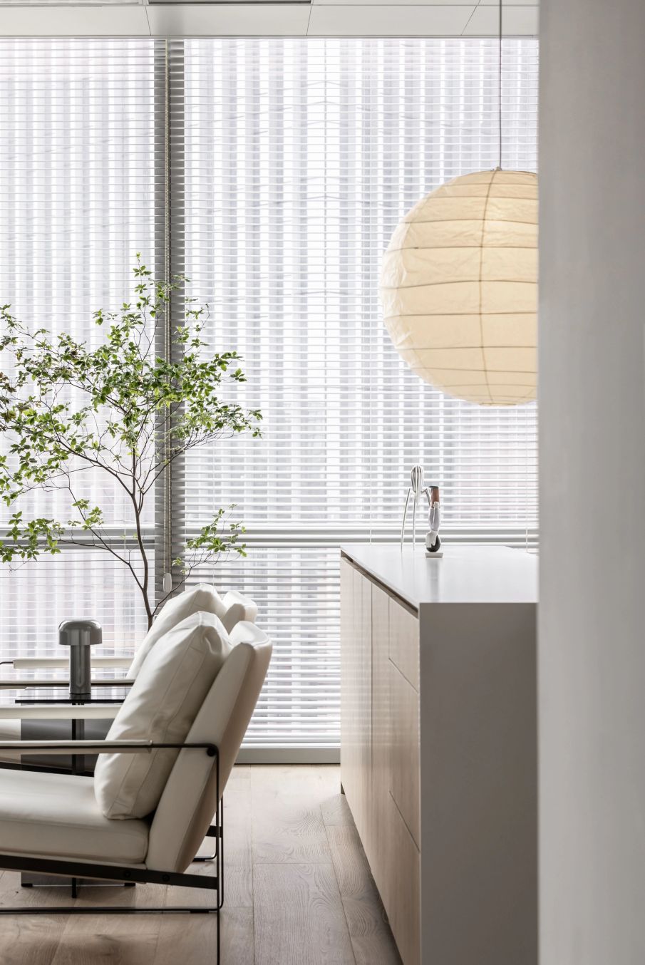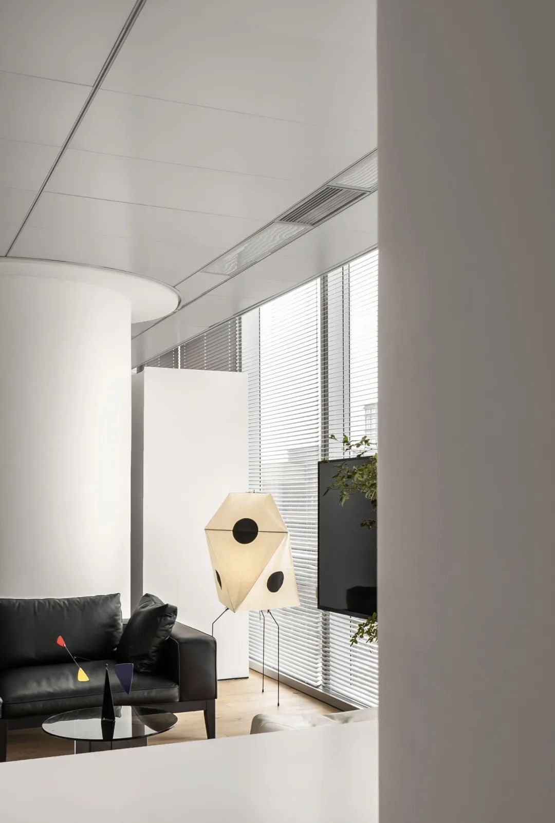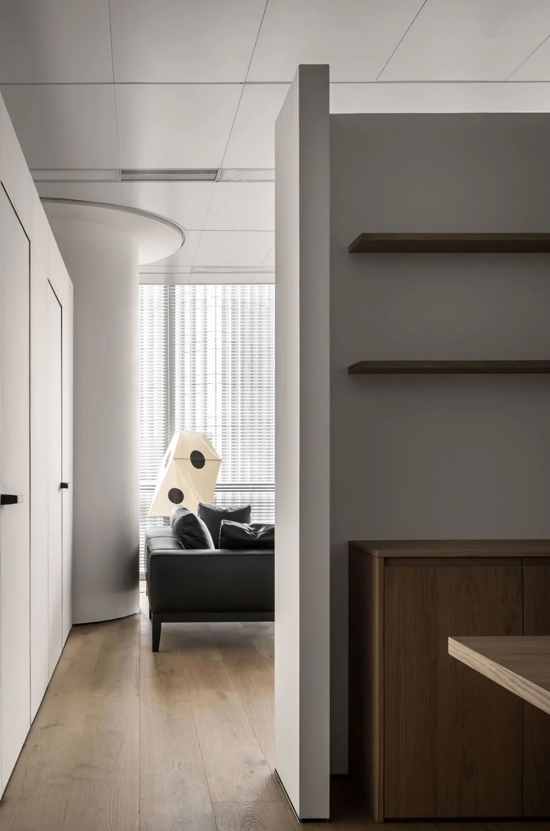 空间入口的纯白背景墙,公司LOGO跃然进入视线,便给予人们无尽的畅想。简洁、安静、自然、永恒的空间气质翩然而至,朴质为表,内里追求自然、艺术、美学的浸润,于自然中探索灵动、隽永、纯粹的设计本真。右转进入空间内,设计师将原有柱子只做了最简单的圈围造型,正所谓“万物初始,大道至简”。在会客区,设计师用浅木色地板搭配纯黑色简洁的皮质沙发,营造视觉空间的跳跃,缔造和谐宁静的会客氛围。