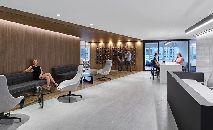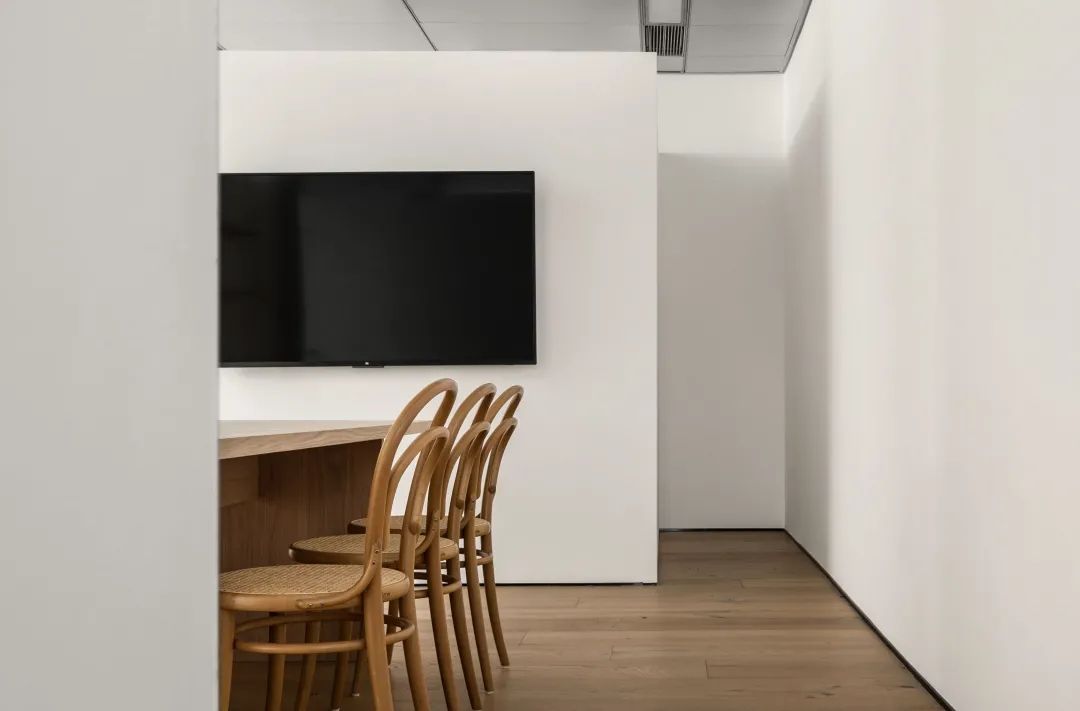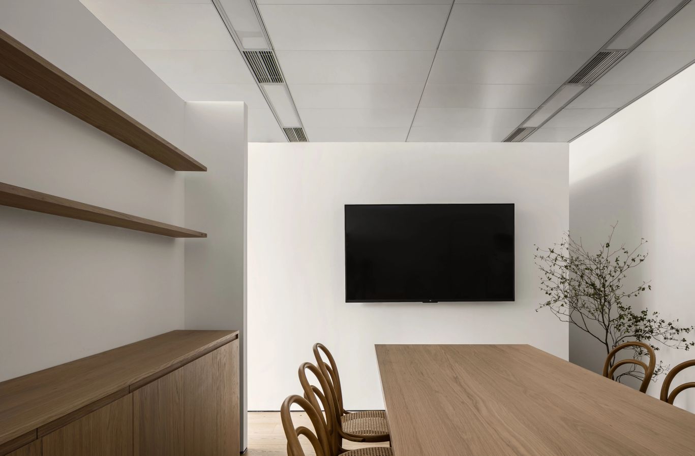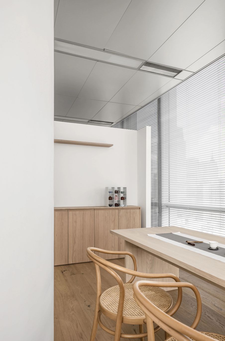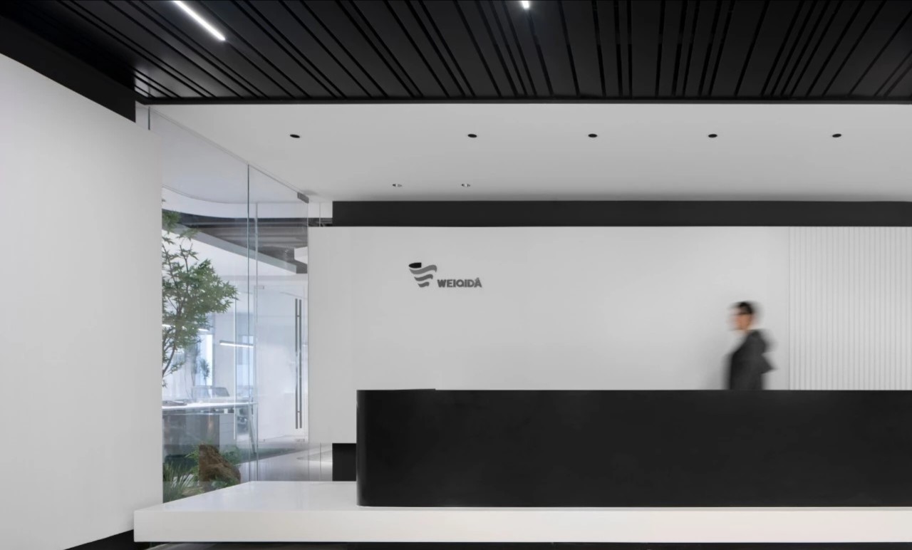 空间入口的纯白背景墙,公司LOGO跃然进入视线,便给予人们无尽的畅想。简洁、安静、自然、永恒的空间气质翩然而至,朴质为表,内里追求自然、艺术、美学的浸润,于自然中探索灵动、隽永、纯粹的设计本真。右转进入空间内,设计师将原有柱子只做了最简单的圈围造型,正所谓“万物初始,大道至简”。在会客区,设计师用浅木色地板搭配纯黑色简洁的皮质沙发,营造视觉空间的跳跃,缔造和谐宁静的会客氛围。