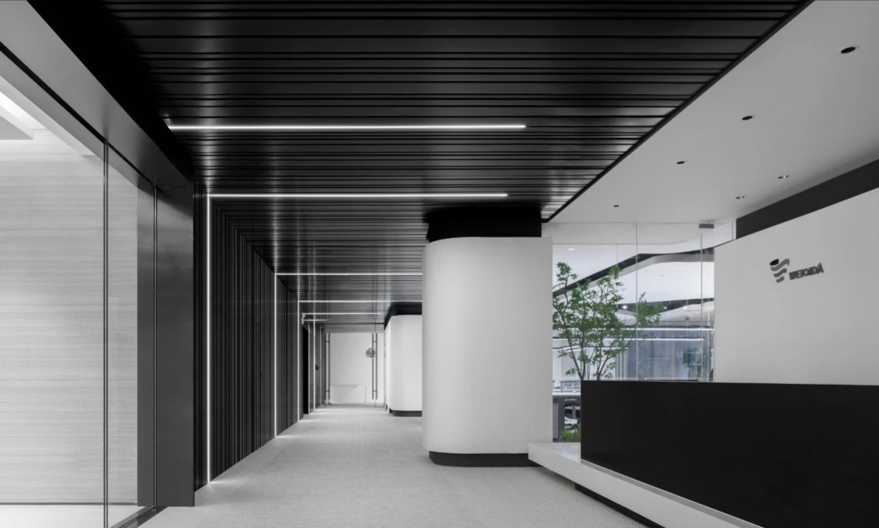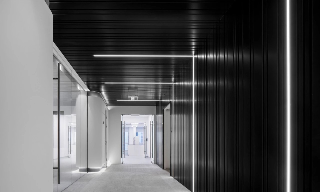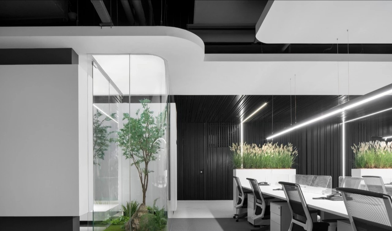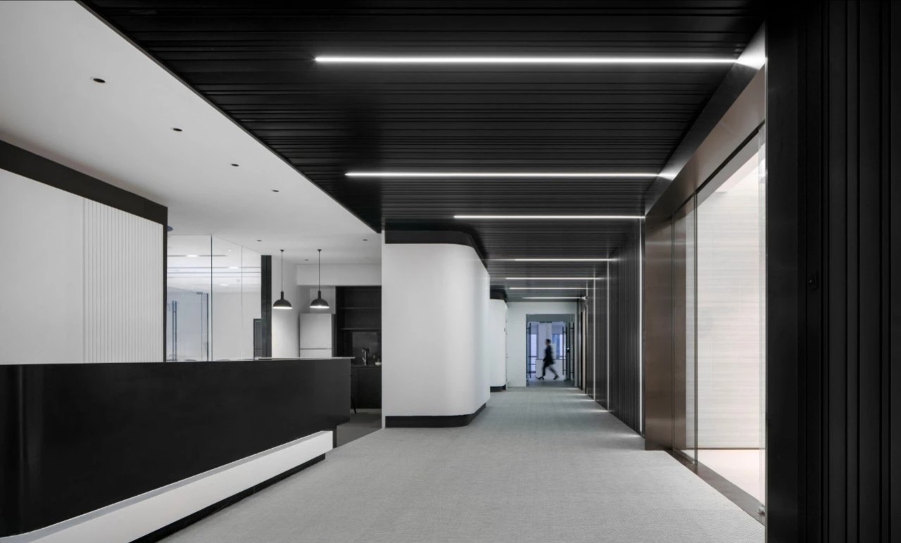 简洁中透露着冷静,使清晰的脉络在美学上达到一定的平衡感,铝方通从顶面延伸到墙面,结合错落有序的线性灯形成了极强的律动感!被黑白灰包裹的空间增加点绿色,顿时活灵活现!