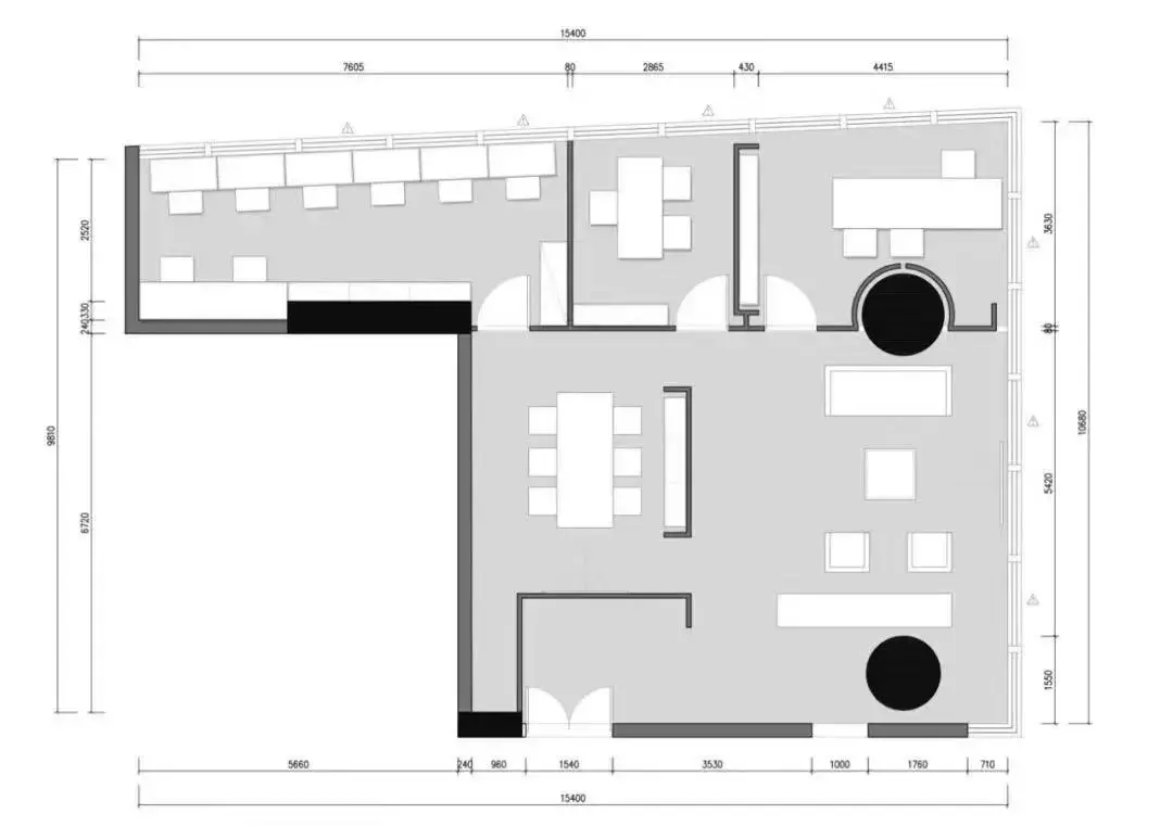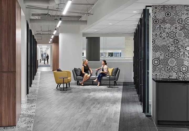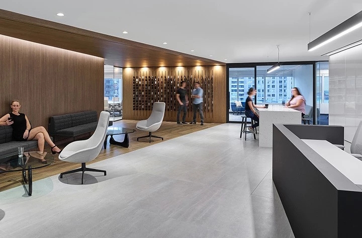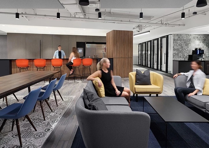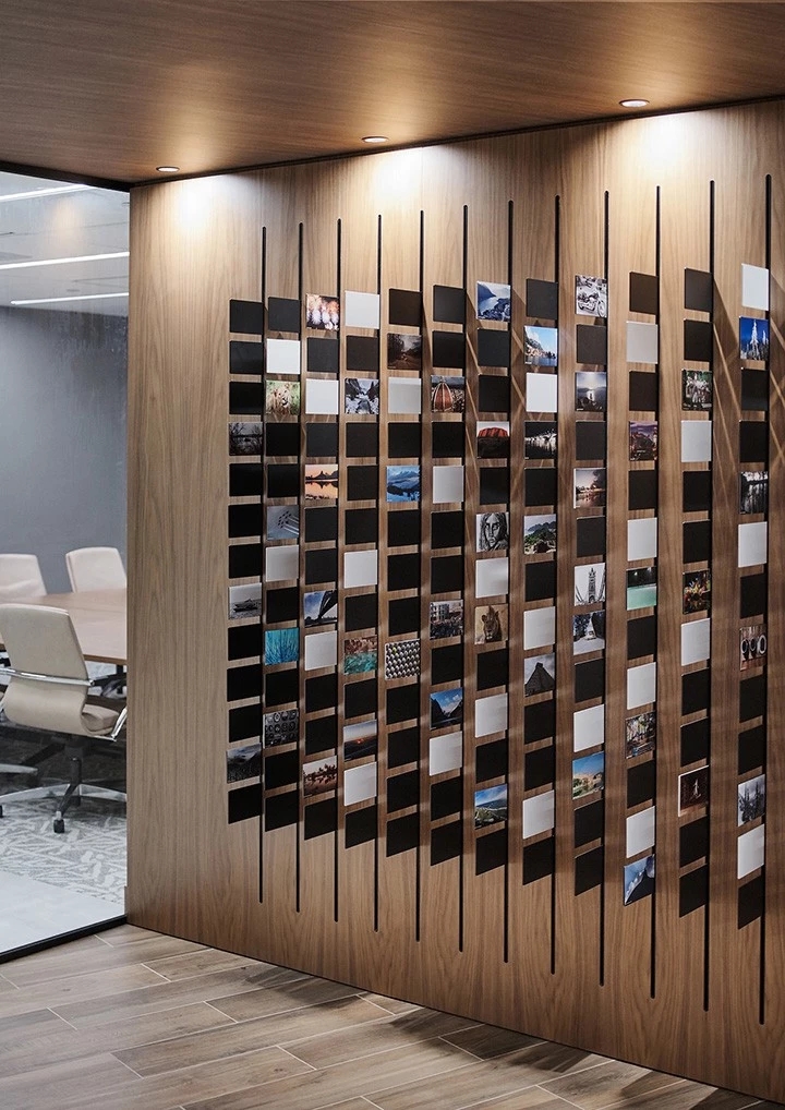 从接待区胡桃木装饰的过渡空间可以直接来到由透明玻璃隔墙围合的大型会议室。胡桃木、黑色金属装饰、石材、玻璃,不同的纹理和质感构建了一个极为有趣的空间场景。宽敞的午餐室是平面规划的核心空间,是活动和聚会的中心场所。设计以可移动的家具创建空间的流动性和灵活性,便于随意重组开展各种形式的活动。漂亮的木纹肌理、时尚的花纹瓷砖、以及亮色的家具装点,为这里带来时尚活力氛围。一面由数百块金属板组成的特色墙,它们代表了每一位员工的价值观,一方面映射出他们积极的生活方式,一方面也如同DNA图形彰显于环境中。