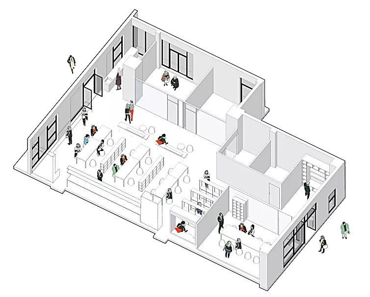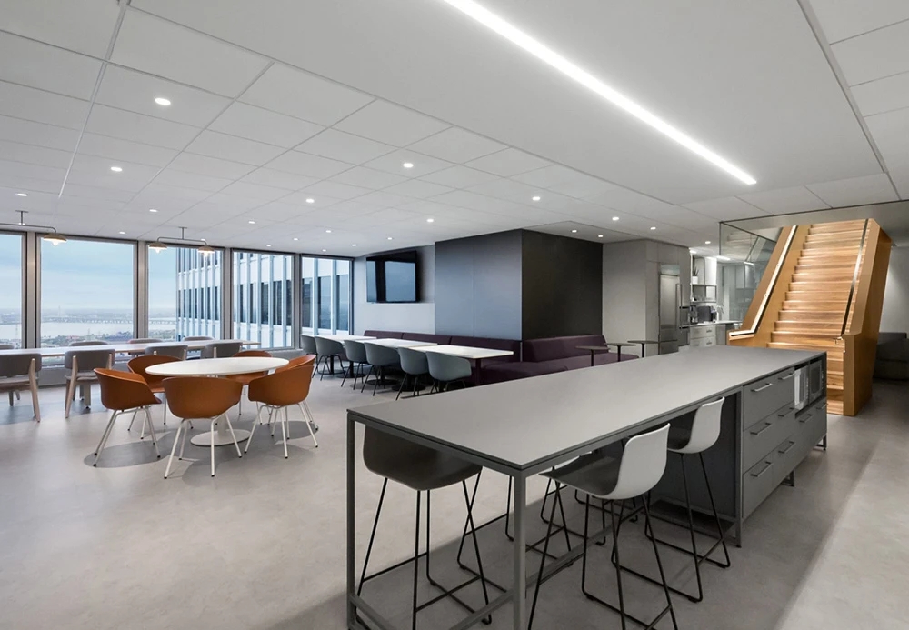十字形建筑平面的交叉点,自然形成了一个活力中心枢纽。这里设有非正式会议室、休息区、图书室、咖啡吧、还有一张乒乓球桌,旨在打造成一个开放休闲的员工社交中心。整个环境旨在创建一种具有协作精神的生活环境。