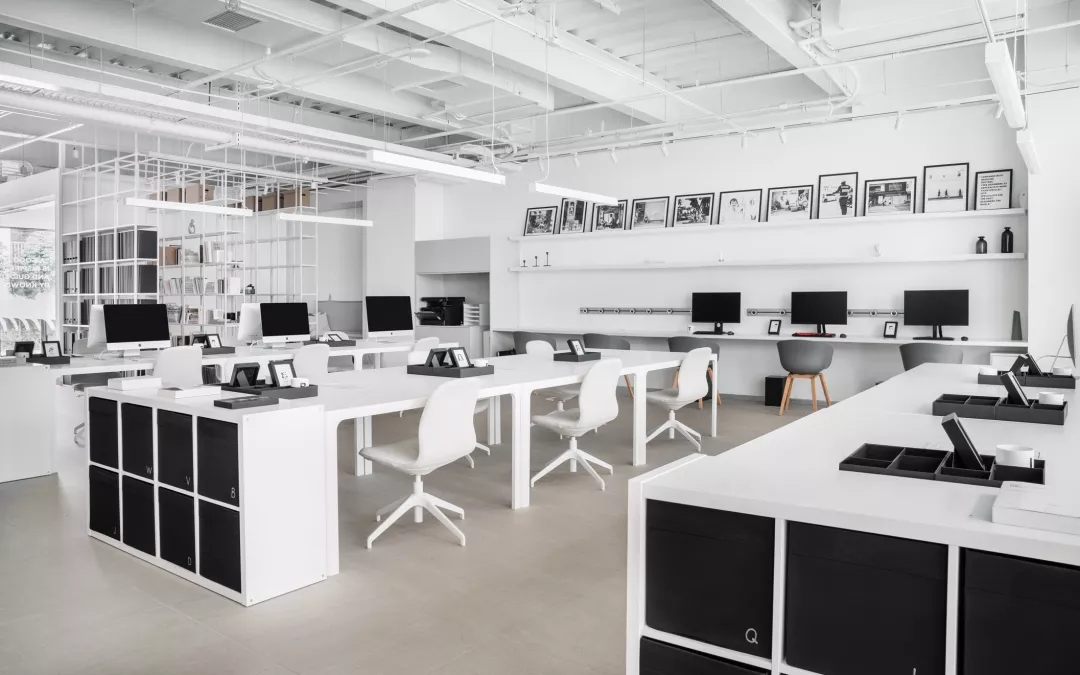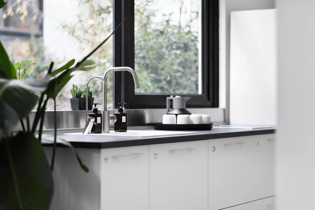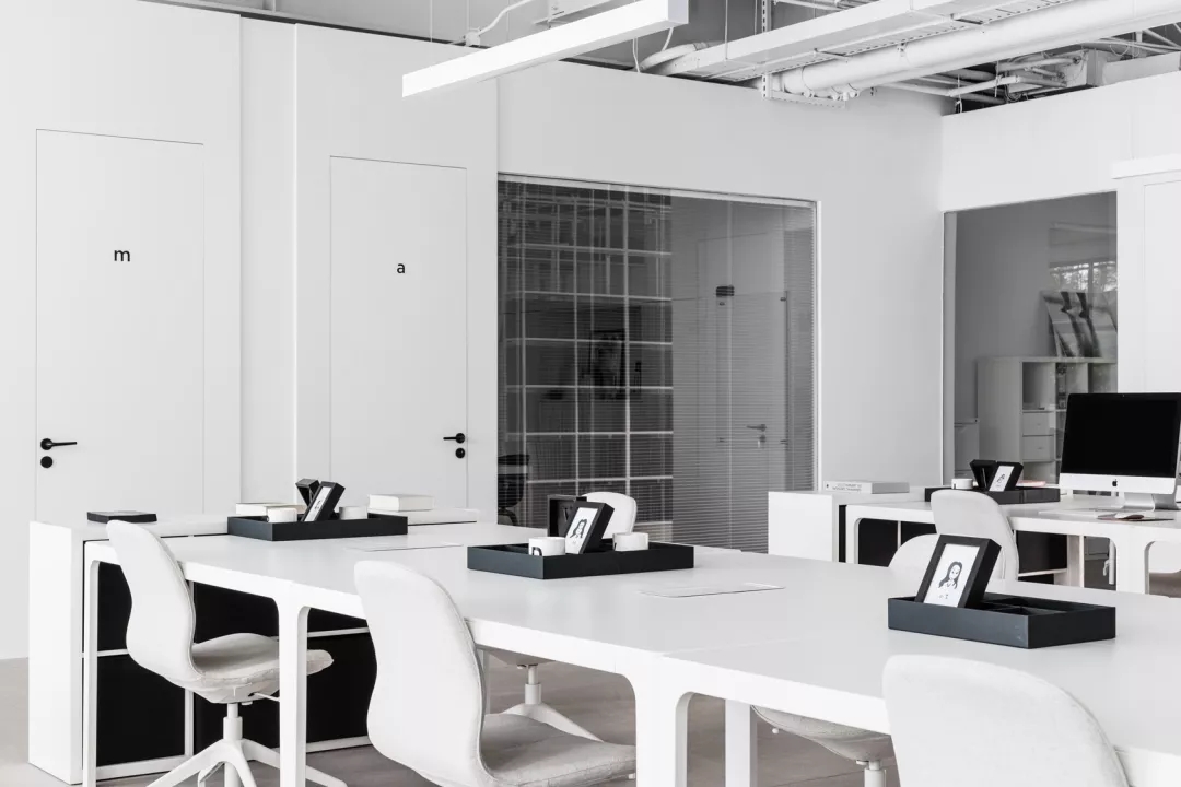 Z/S STUDIO设置了两个出入口,以保证安全的消防通道及清爽的办公通风环境。我们将会议室安排在了光线最好的位置,让这个年轻的创意团队在明朗的空间里尽情的头脑风暴。开放式的员工办公区,资料查阅区集中在整个空间的核心位置,方便团队各自高效有序的办公及沟通。一排开放式文件柜将两位主理人的办公室与员工办公区用通道的形式划分出来,即保证了合适的办公尺度,也提升空间利用率及通往各个功能区的流畅度。设计团队利用大面积的窗户,将中庭天井的光线,园林景观引入茶水间的视线,旨在繁忙的办公间隙,能为大家带来一丝放松,感知自然的美好。
