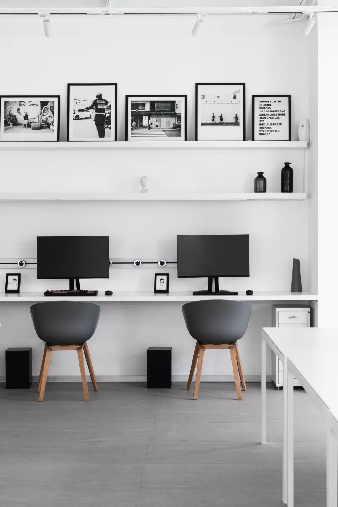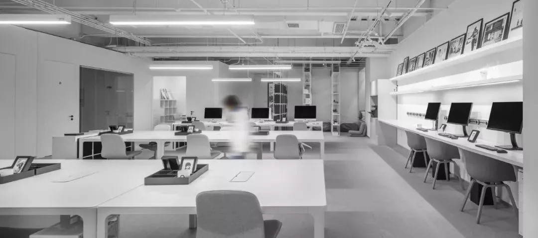 室内的主要材质采用浅灰色的干粒通体砖、黑钛拉丝不锈钢以及大面积的白色定制柜体。材质的选用既考虑到与建筑的整体色调统一,在视觉上,给予足够的有序及利落感。空间视觉上的适当留白,将“内容”交给充盈在空间中的无限创意和发生的故事。