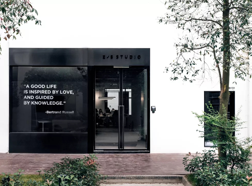 门头的设计考虑到与园区建筑白色工业风格的呼应,在利落的黑钛拉丝不锈钢的衬托下,橱窗上的英文,正婉婉道来Z/S的理念。“档案室”所代表的丰富内涵、沉稳积淀和并然有序,成了Z/S STUDIO新办公空间最核心的设计基调。在空间入口处的展示区不仅陈列着Z/S STUDIO过往所有的出版物及生活好物,更为日后更多创意内容和展览预留出空间,呼应着“档案室”的设计灵感。