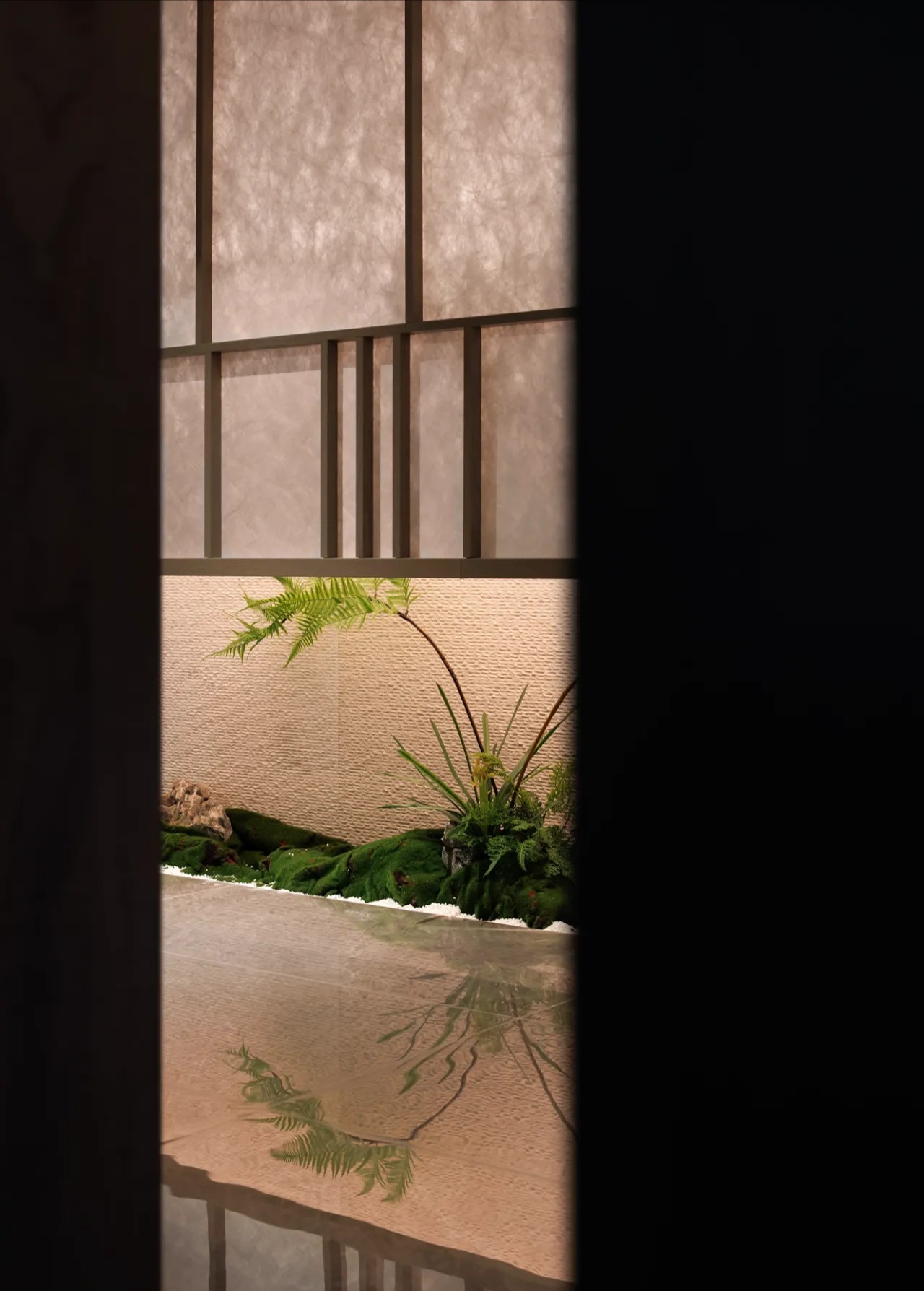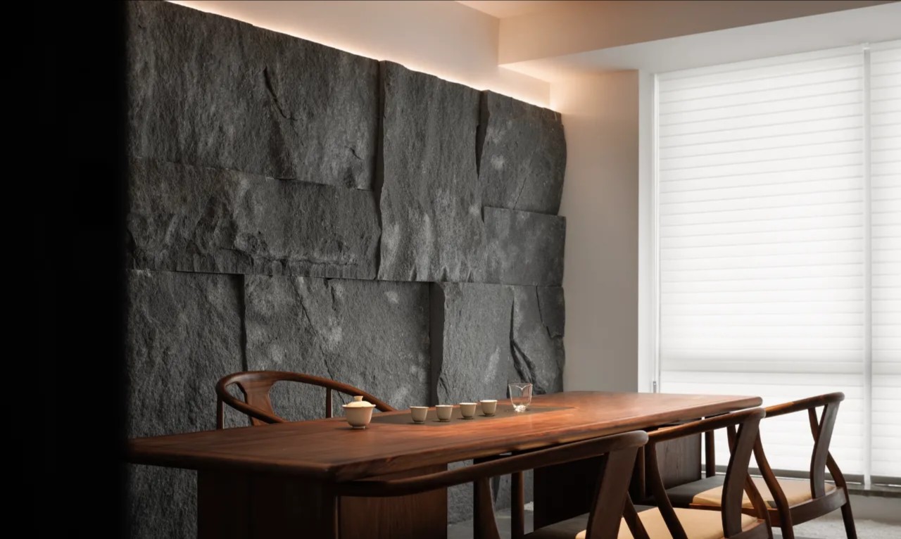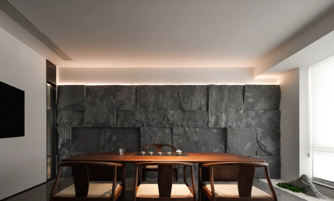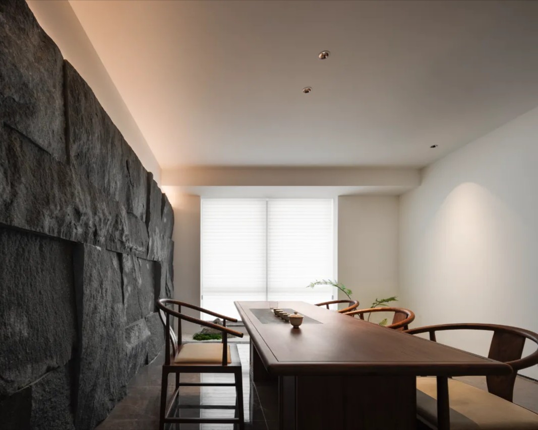 茶室作为功能补充,满足多样化的办公场景——无论是非正式会谈,还是商务沟通,均能提供对应的轻松氛围或私密保障。茶室,石材断面凹凸打磨的天然感,在简洁利落的现代办公场景中形成微妙的反差感,散发出的别样魅力,空间情绪在丰富的层次中格外松弛与率性。