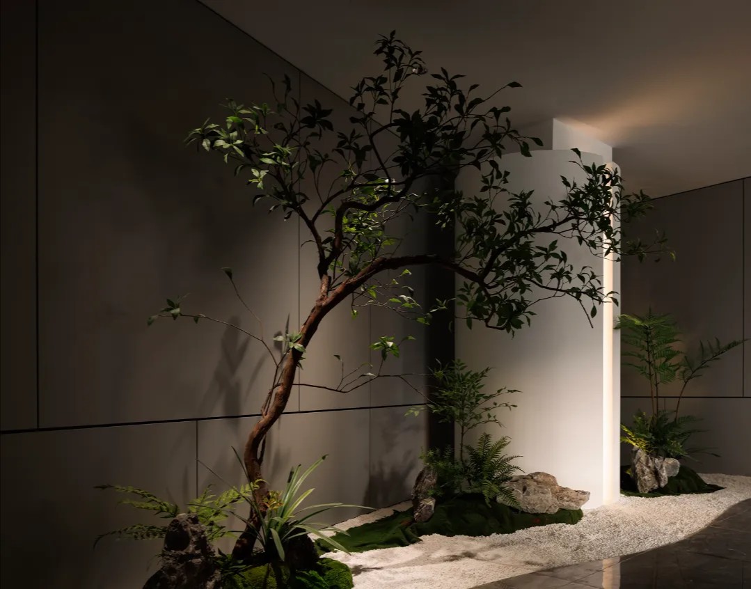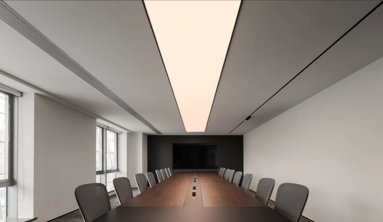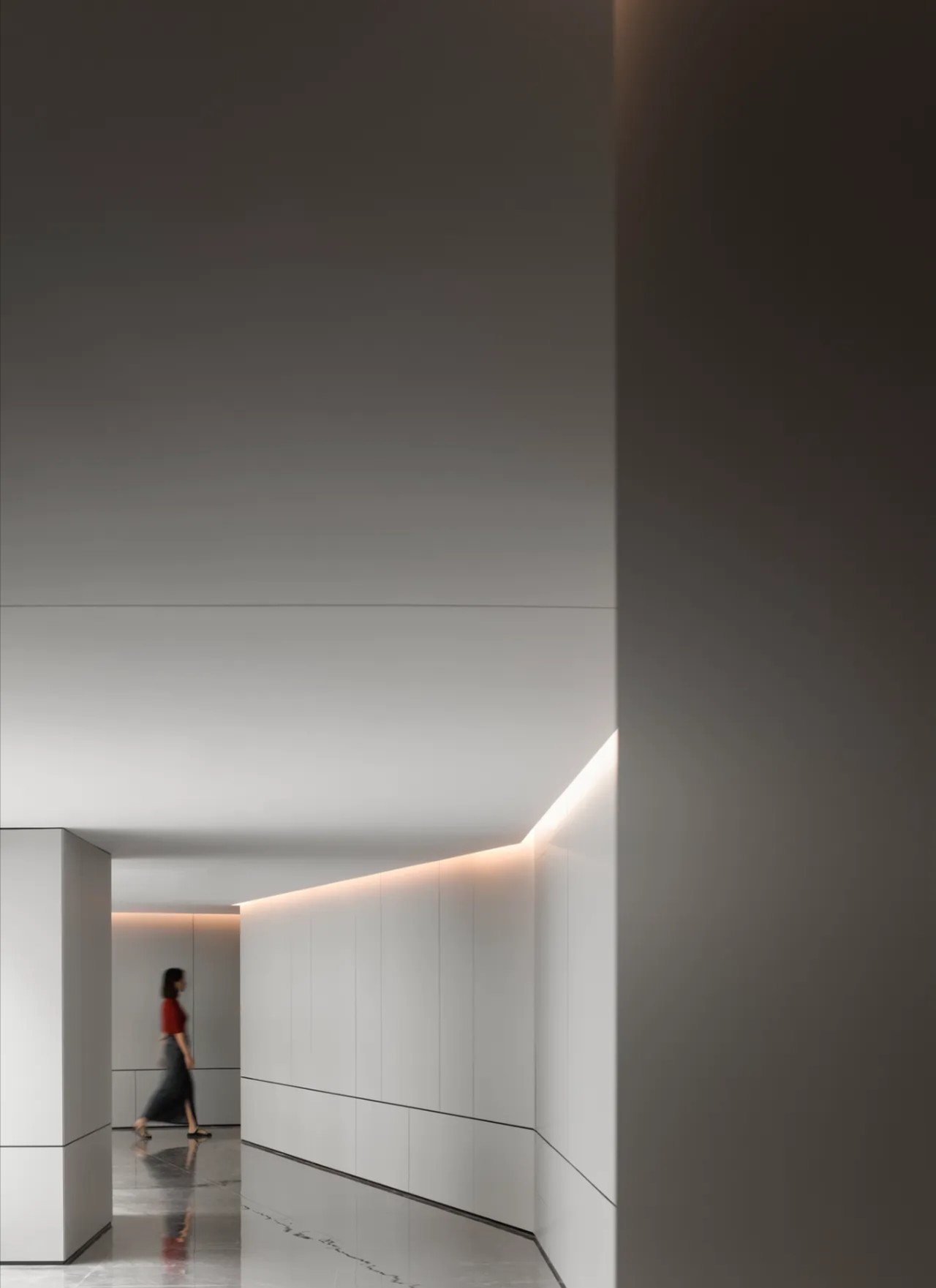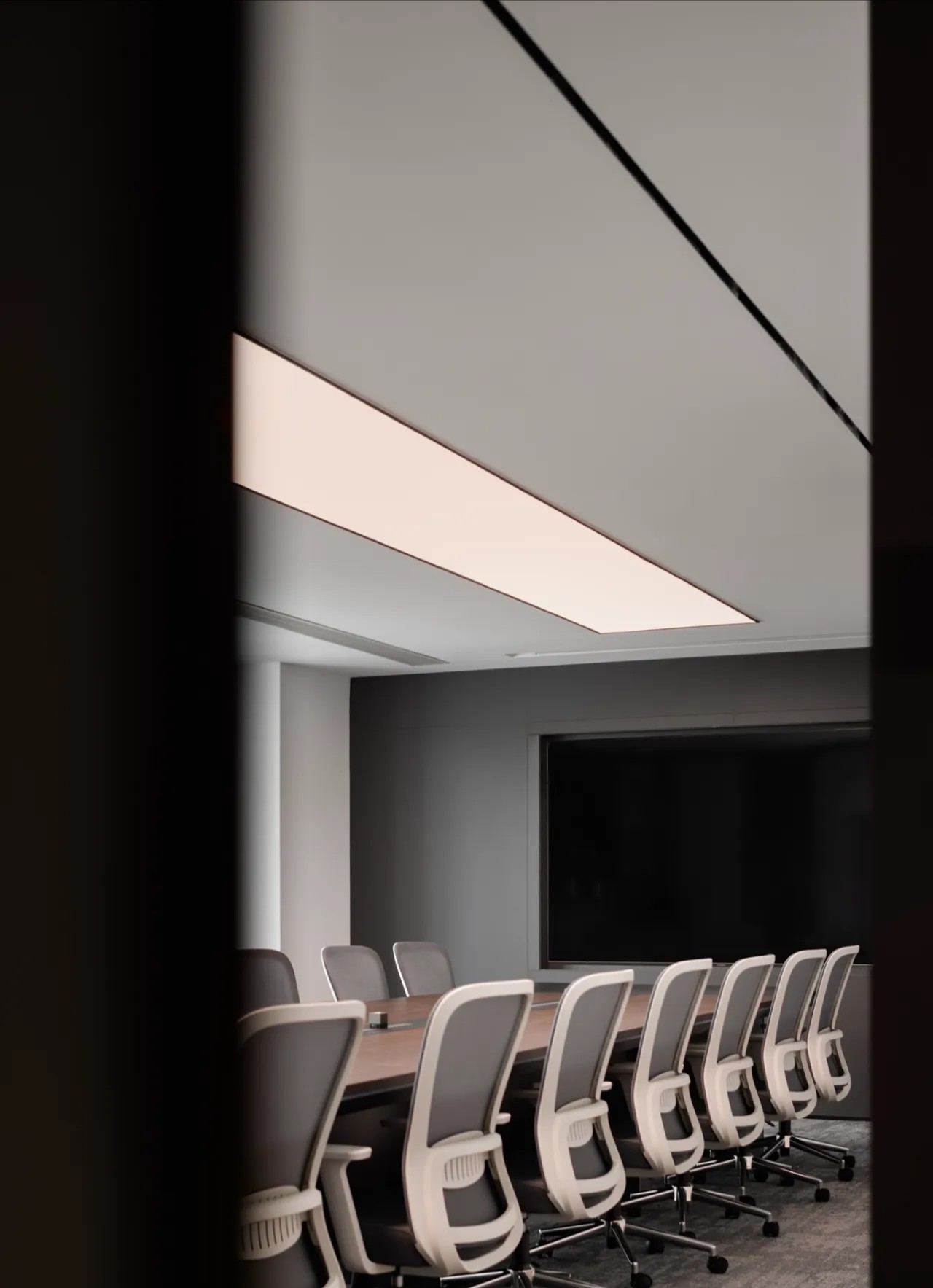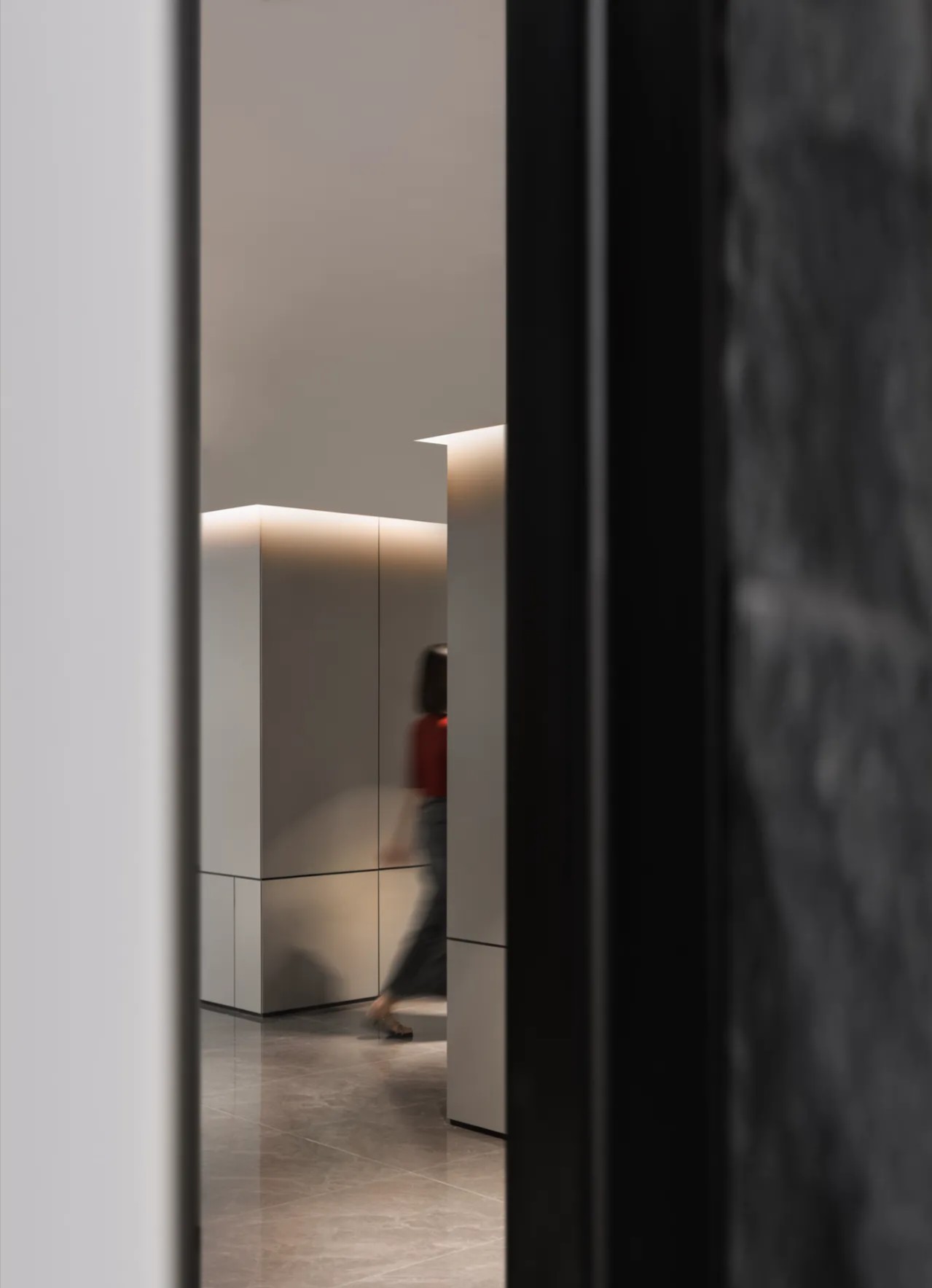 整个办公区采用回型动线,通道以线条和灯线呈现向内流动之效,向人们发出欢迎探寻的邀请。循步深入,视野所到之处,皆是被浅灰包裹的亲和与静谧,一派安然闲适。偶得一些精致小景,如春水洒落在平静的湖面,令人意外中带有惊喜。