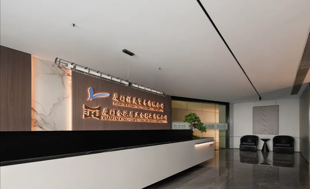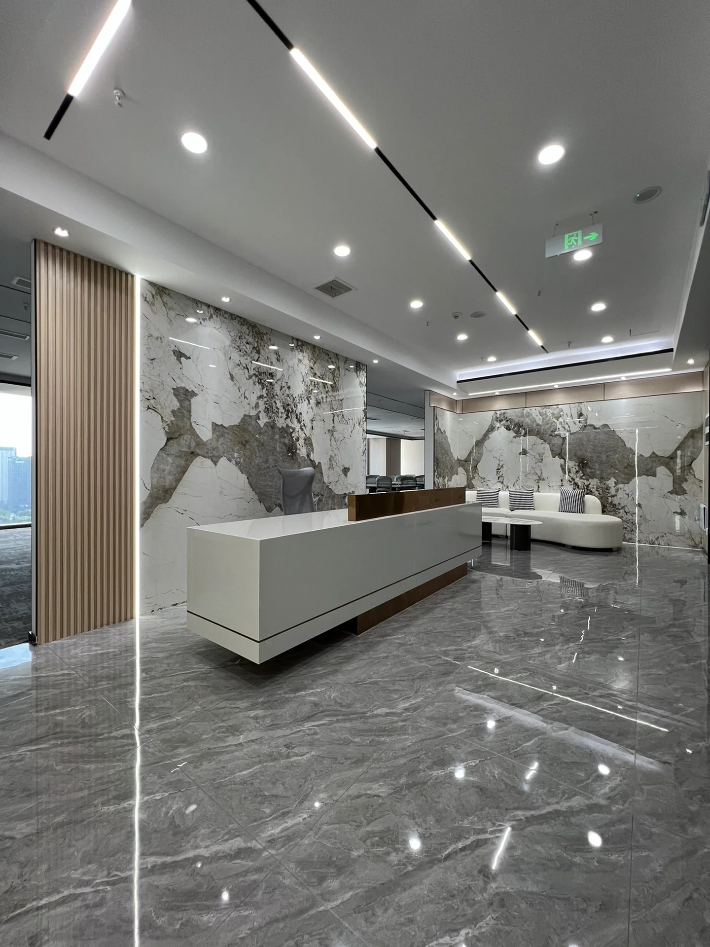 从空间的动静界分,到空间功能的灵活转变,干练、精英的使用者画像,指引着设计的整体风格与气质走向。作为进入空间中第一印象的存在,接待前台以“简洁、大气”的形式呈现,设计考虑的是以利落的体块和安静的氛围,让到访者直接感受到企业的气质。