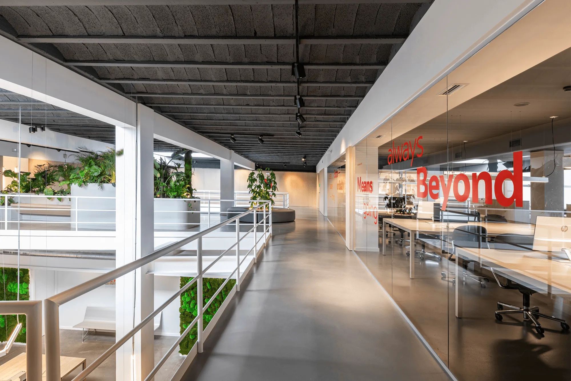 丛林的中心绿洲是莫里拉斯的中心,是生命的源泉,以光线和周围的自然以及三层楼的其余部分从中出现的核心空间为标志。这种开放和包容的垂直建设性元素决定了总部的整个结构:从会议室到组织不同团队和自助餐厅的灵活区域。
