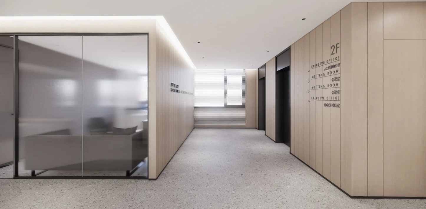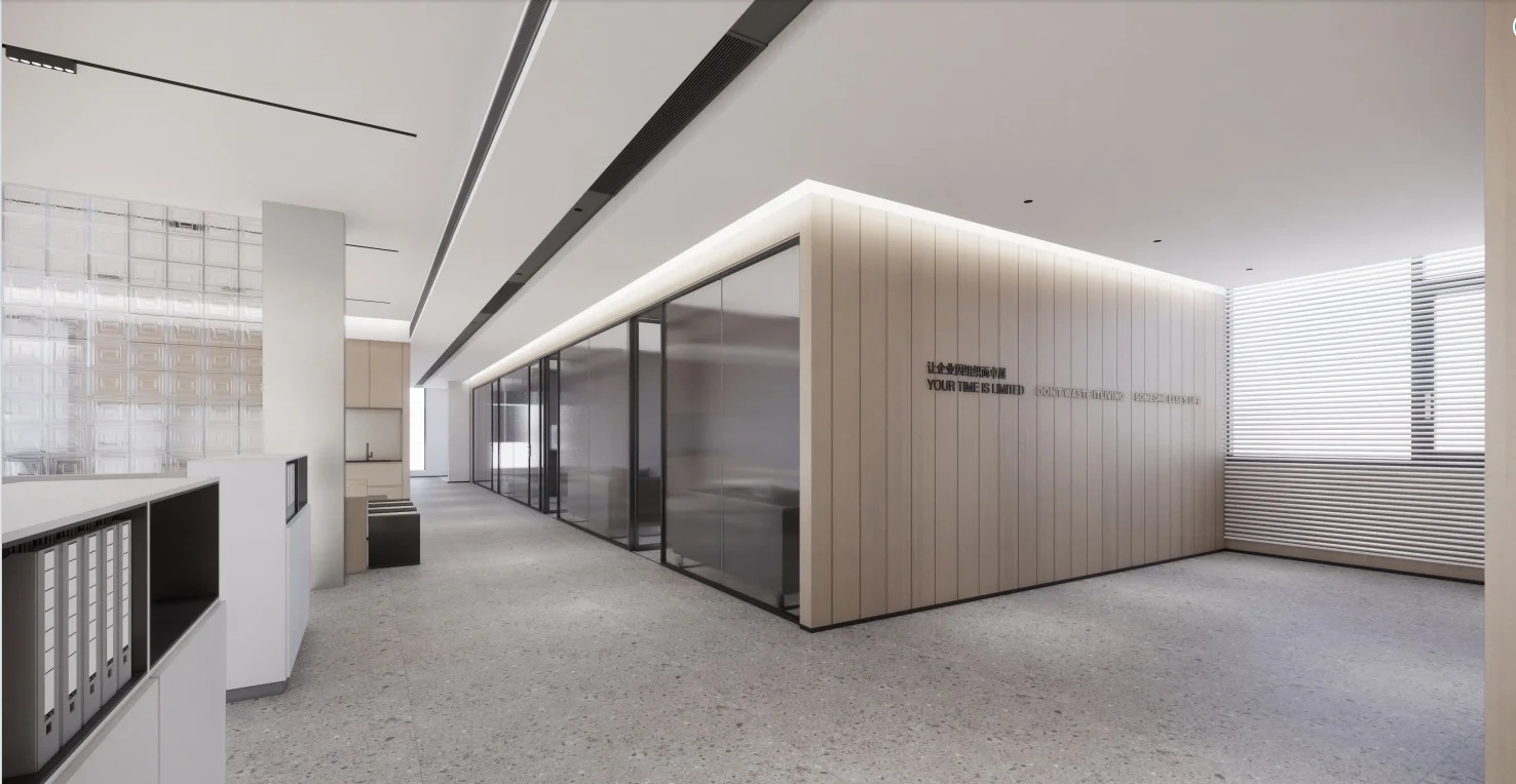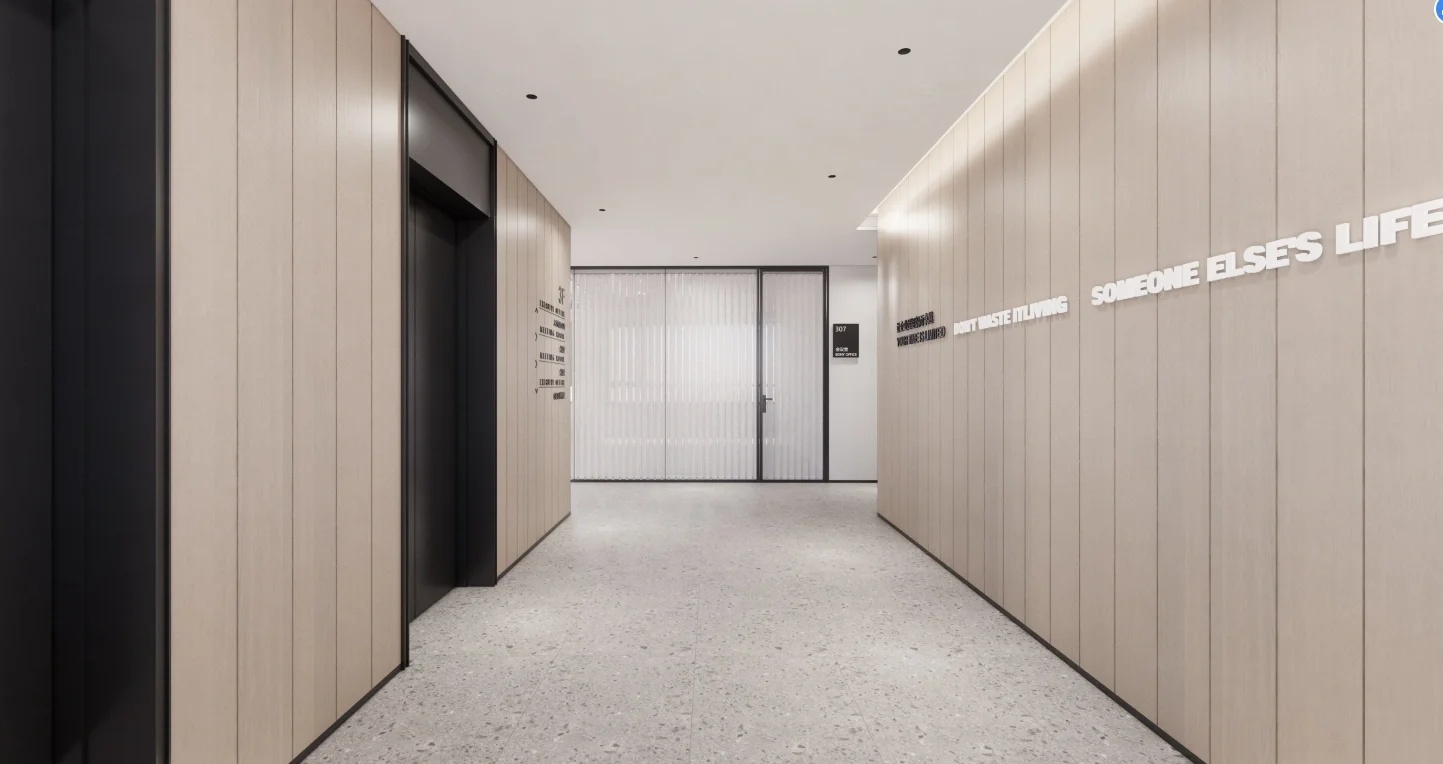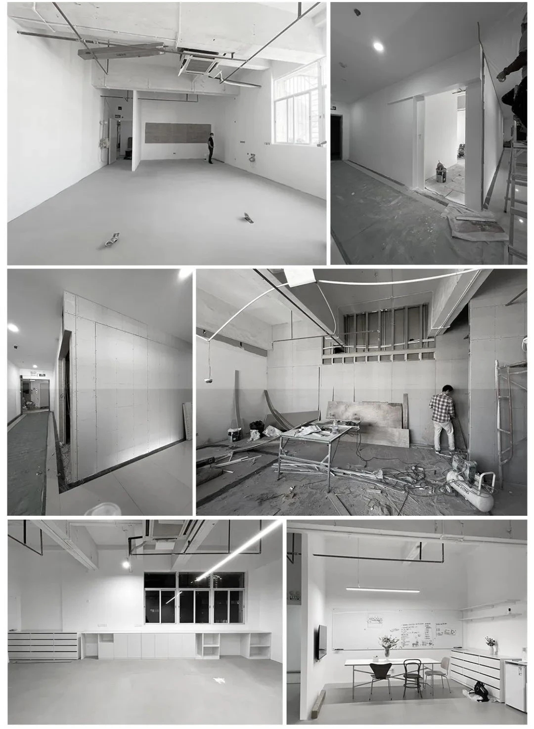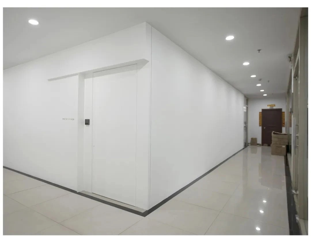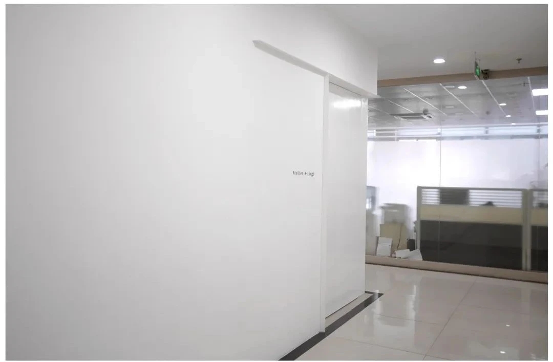 对于套内面积仅50平米左右的单间办公室来说,这个空间反而变得狭窄且动线不顺畅。同时,访客不管是通过货梯通道或者走廊来我们工作室会首先看到转角处那面墙而不是走廊侧边的墙。于是我们将入口的方向调整,让工作室的入口形象更好的被展示。进入时,动线更顺畅,视线也更开敞。