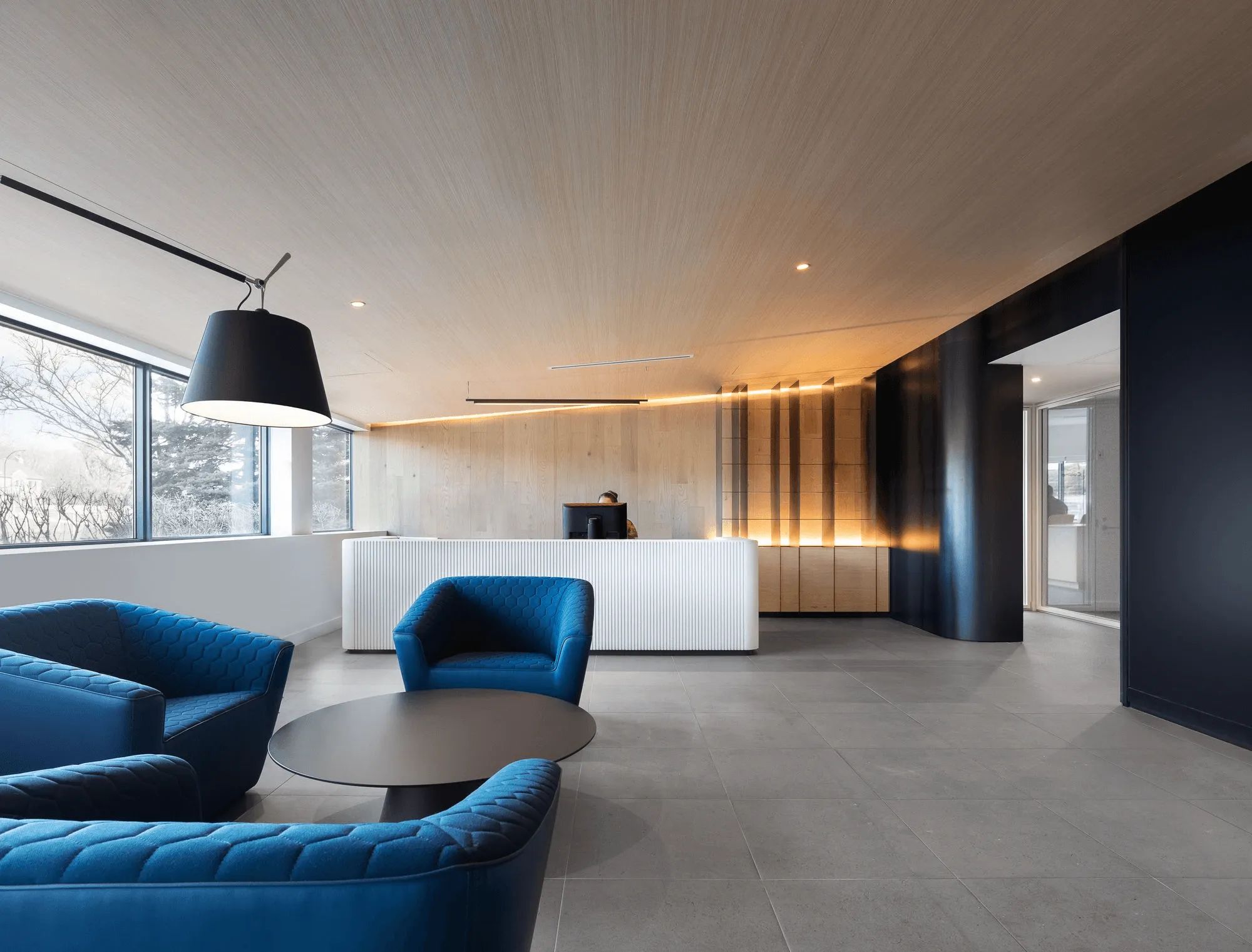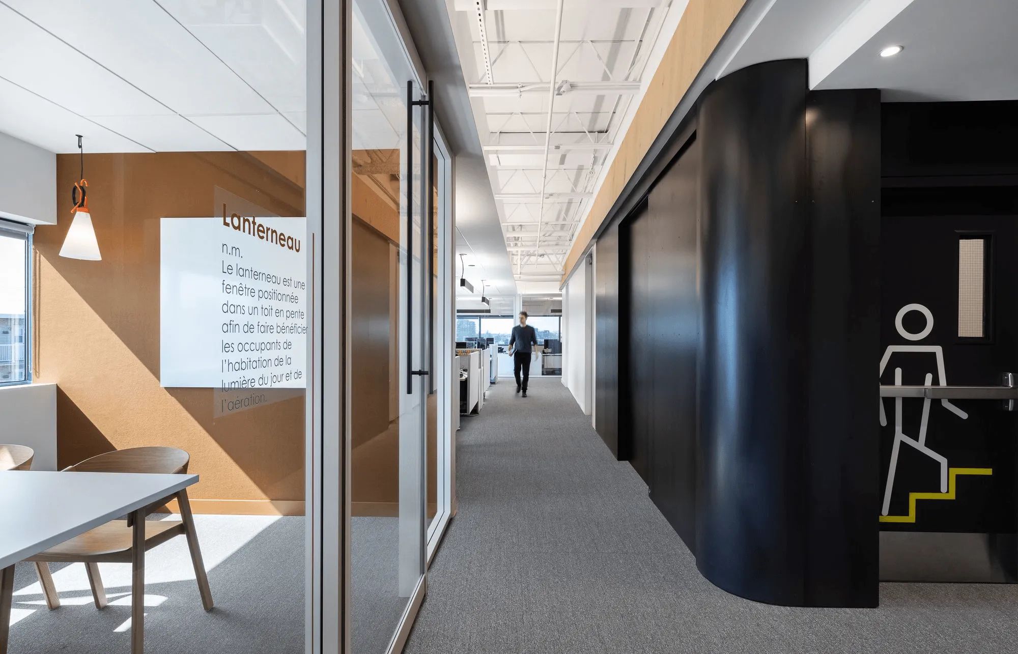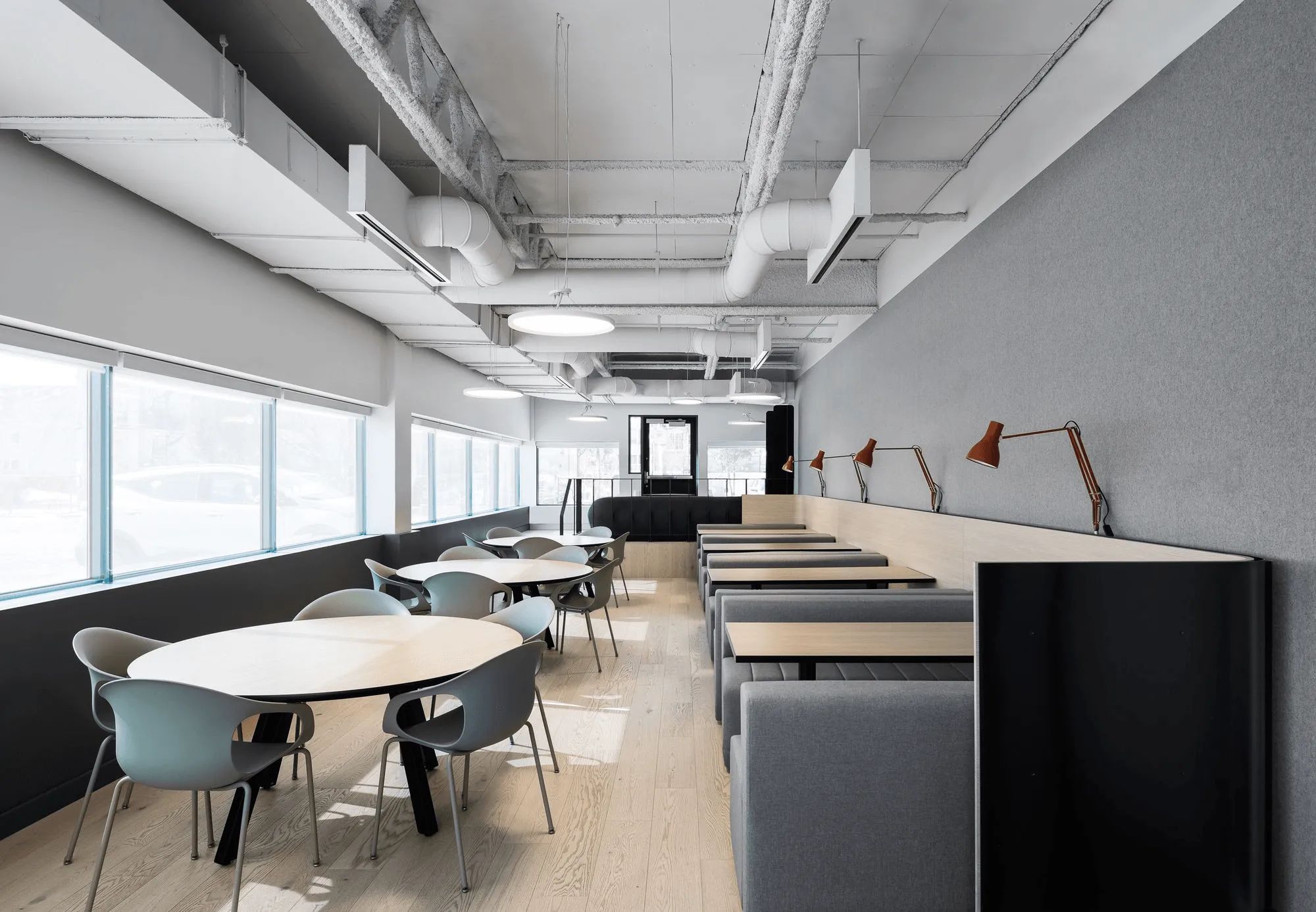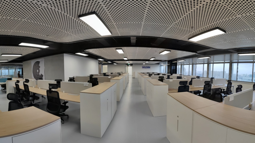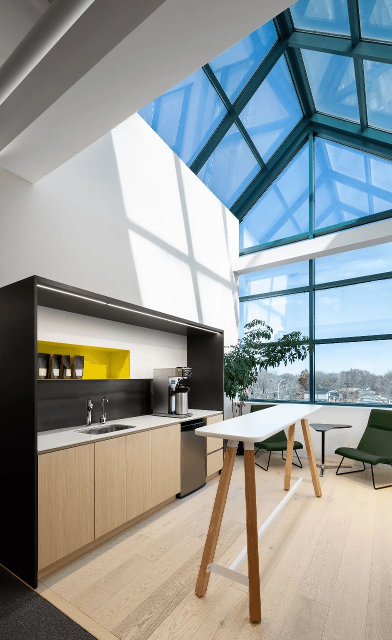 除了定义工作区域外,悬挂式声学天花板瓷砖还让人平静和专注,而流通区域的裸露结构唤起了建筑的原始面。通过柔和的间接照明以及一系列环保材料展示基础设施,让人想起对空气质量和用户舒适度的关注,旨在获得LEED金级认证。