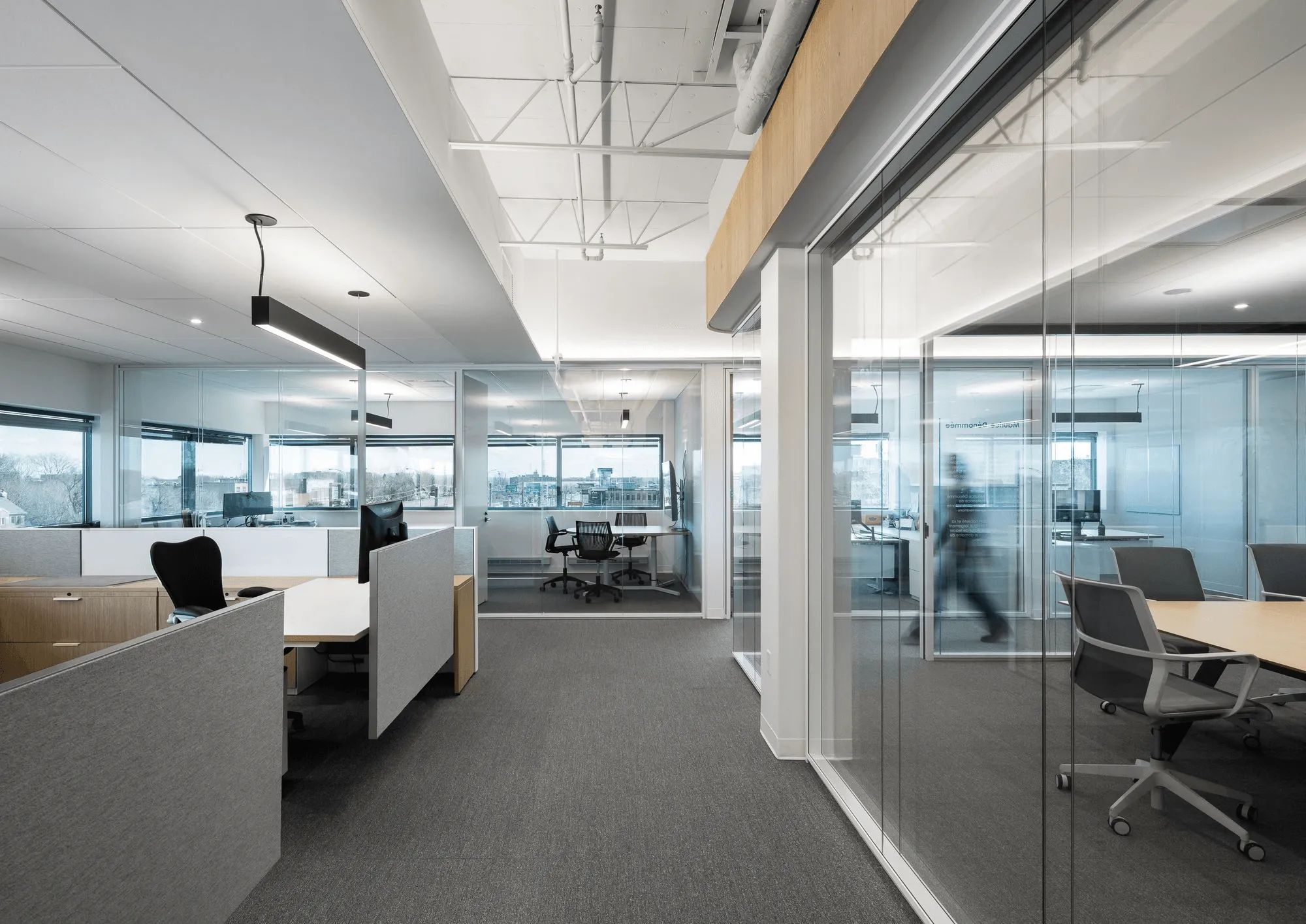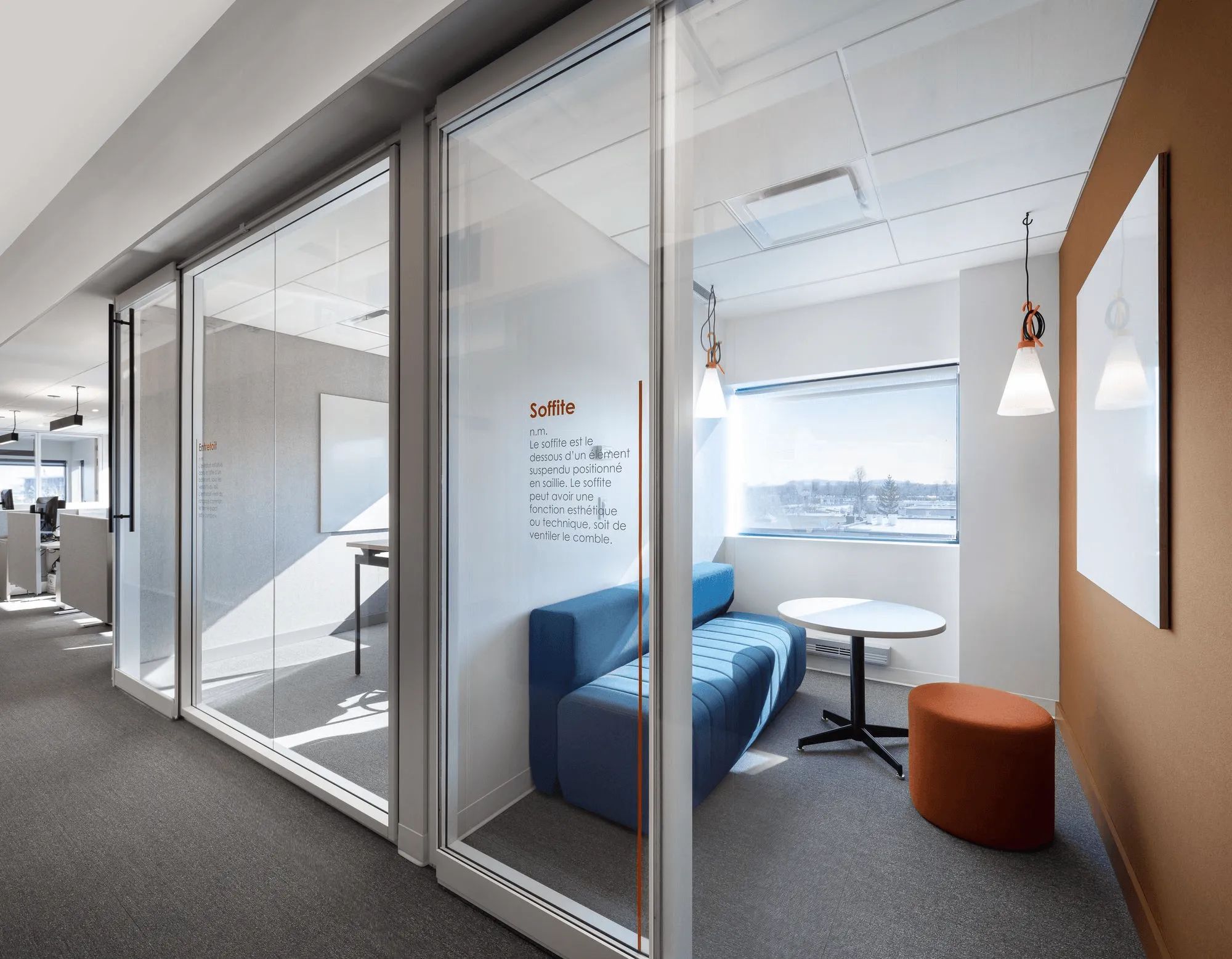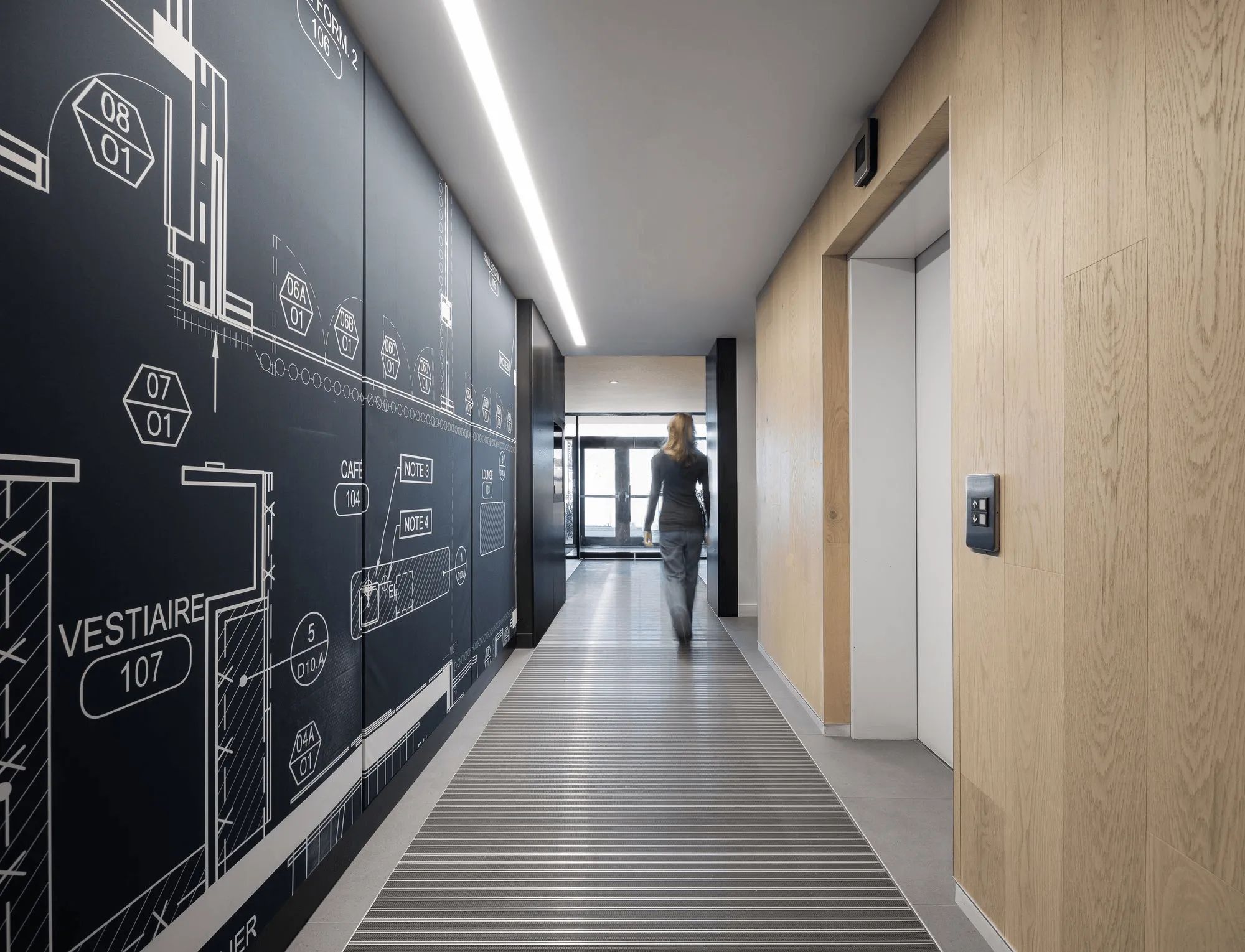 新环境的物质性以白色、灰色和大地色调的矿物调色板表达。白橡木在魁北克的大量使用散发出与家的温暖相关的柔和舒适感。热轧钢的祖母绿卷轴为这种体现强度和稳定性的当地材料带来了质感和深度。偶尔以墙板或镂空的形式添加毛毡,有助于空间的视觉舒适度和声学效果。