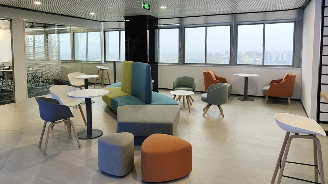 进入空间之前,那得先让一场仪式感围绕身边,红墙黑瓦和绿植的布景顿时带你进入另一种体验:未来、高级、好奇,几种不同感觉融合在一起,行进中,通过不同视角得以窥见内部办公区域的场景片段。休闲区以通透和开放的姿态,体现出该空间大大的自由感,让大家在工作之余拥有更多相互交流的机会,重新找回彼此间情感的温度。