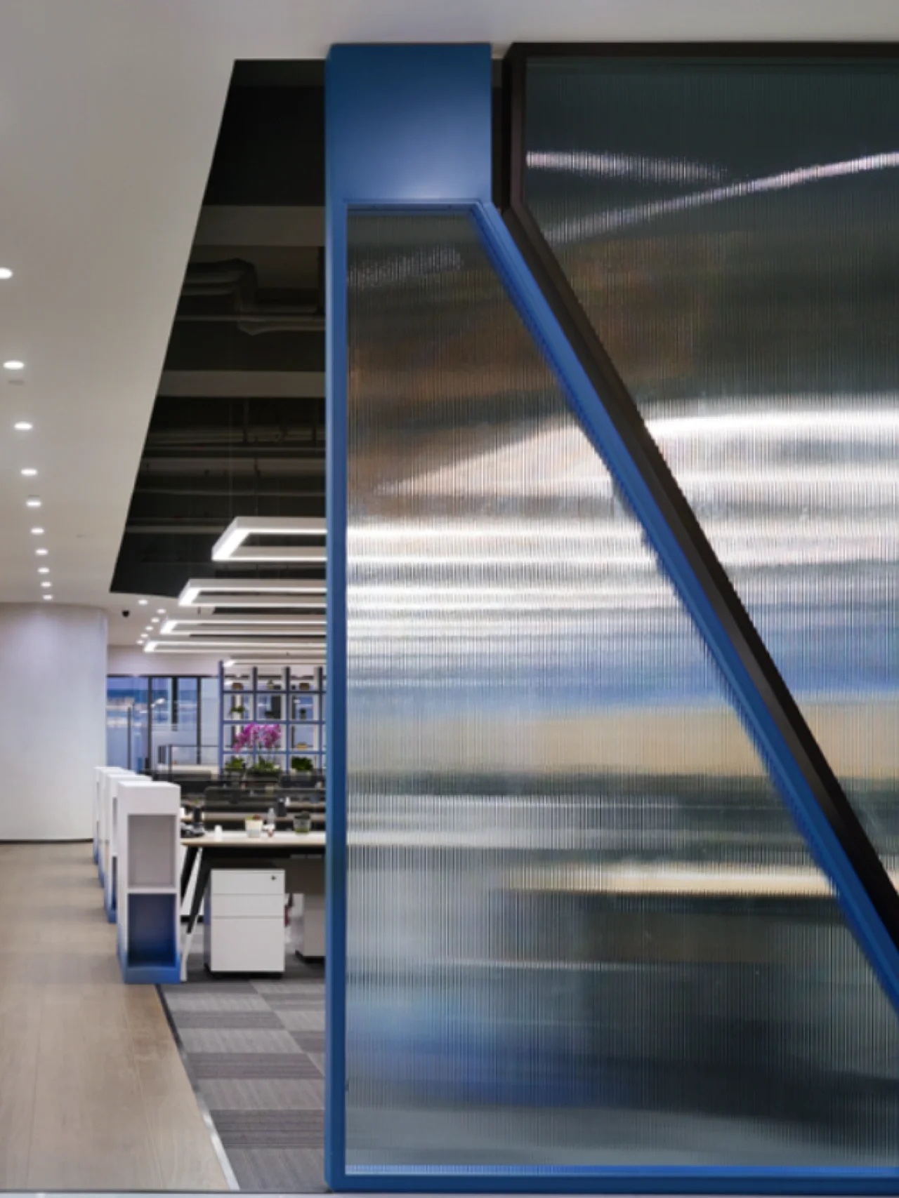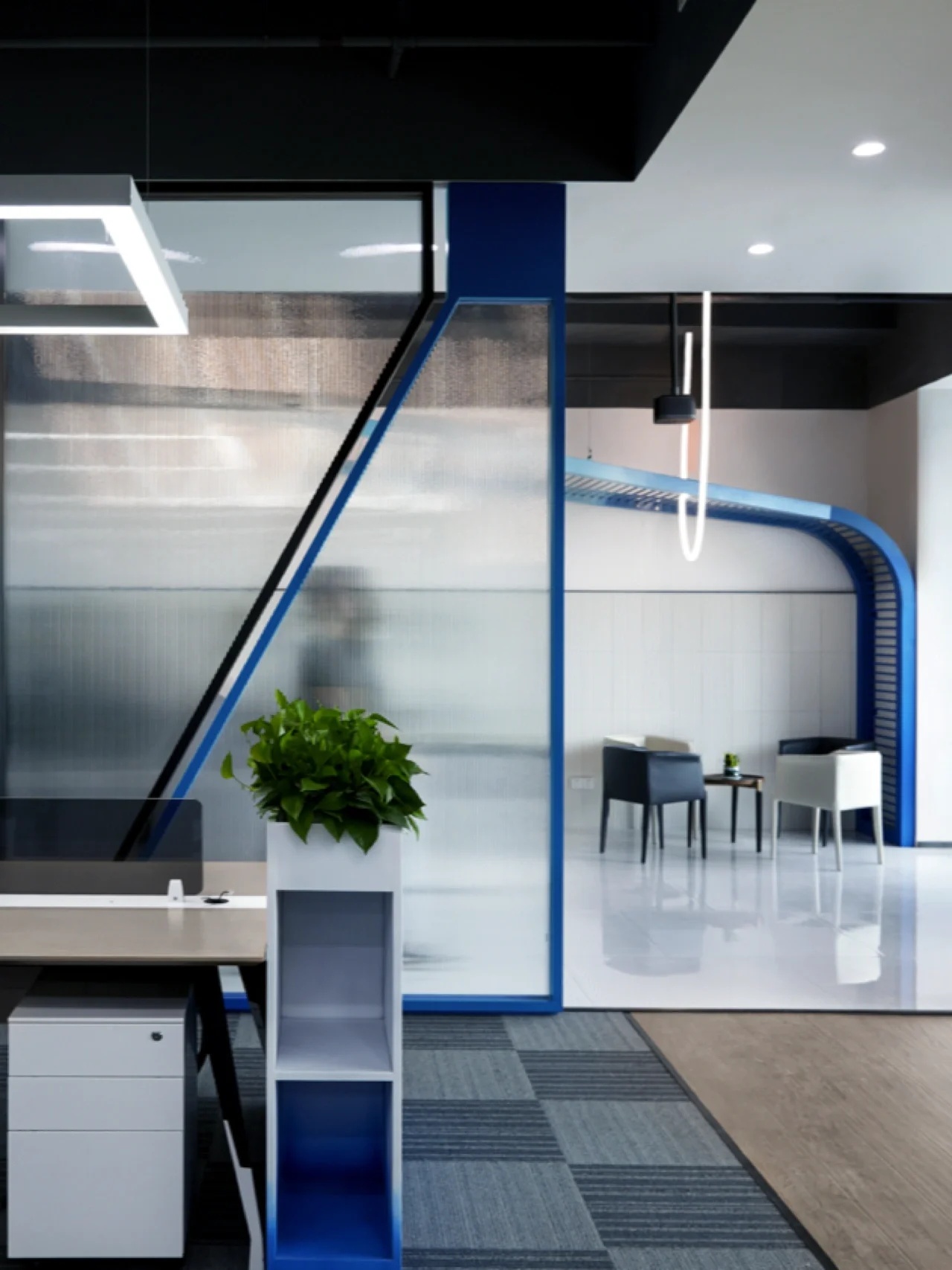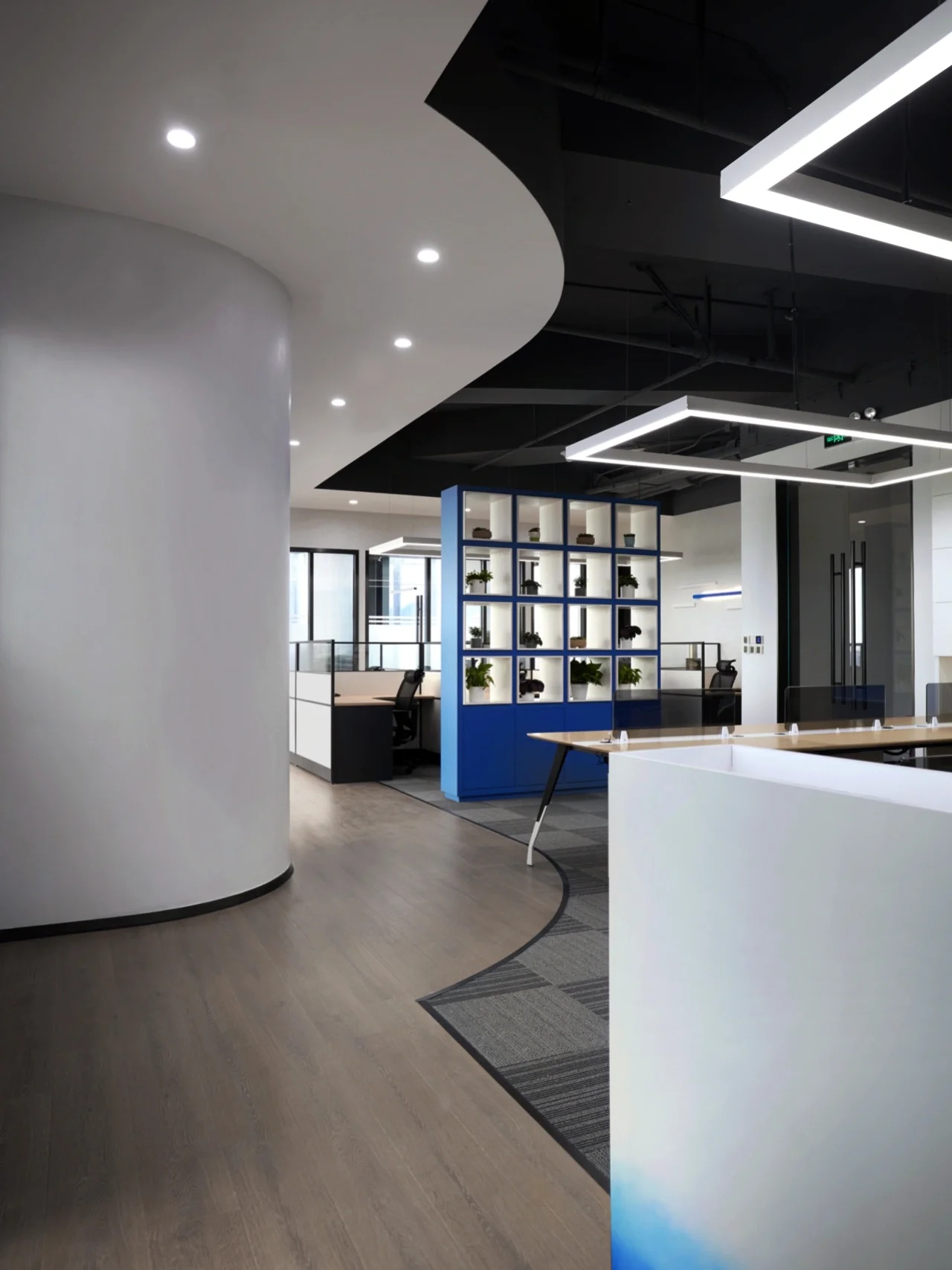 我们的设计主题是让整个空间能与大海概念相融合,从蓝色的色阶及渐变上做到变化,办公区域采用自由、开放式的场景,让无敌海景在各个区域随时映入眼帘。办公区域整体用色融入海的蓝色概念,100个大小不等的BOX书柜的蓝色渐变,采用钢结构蓝色渐变,布艺墙体的蓝色渐变,还有5个落地的矮书柜隔断蓝色渐变,在色彩上让其浑然天成,让其视觉美好放松为办公室提升视觉属性,我们一直努力着。