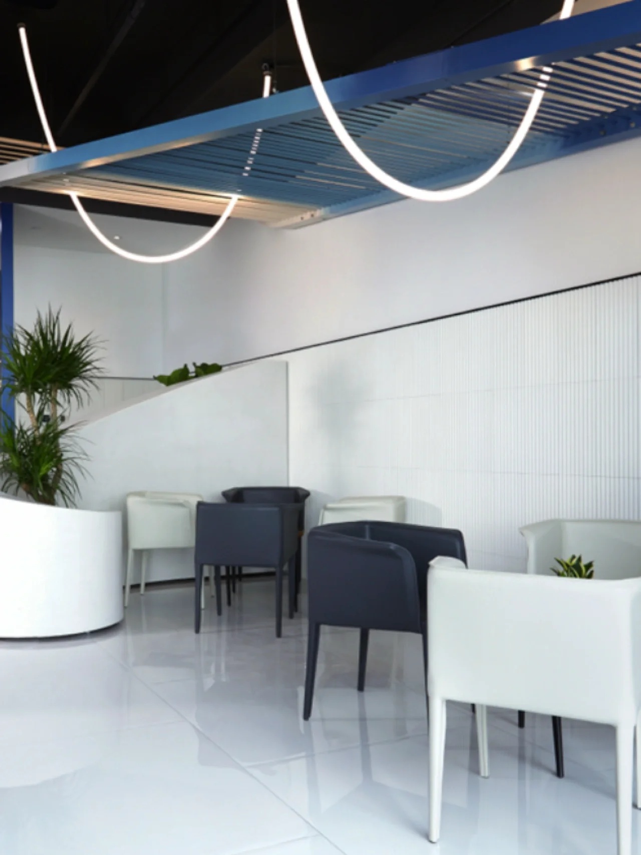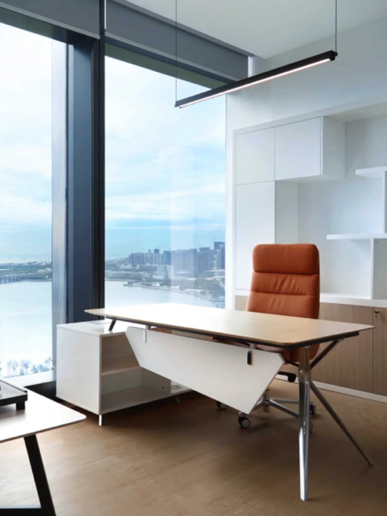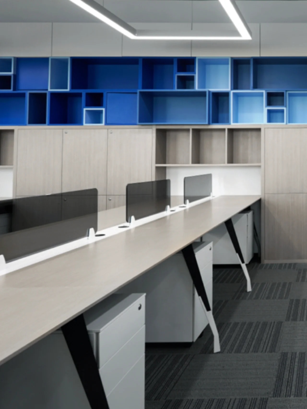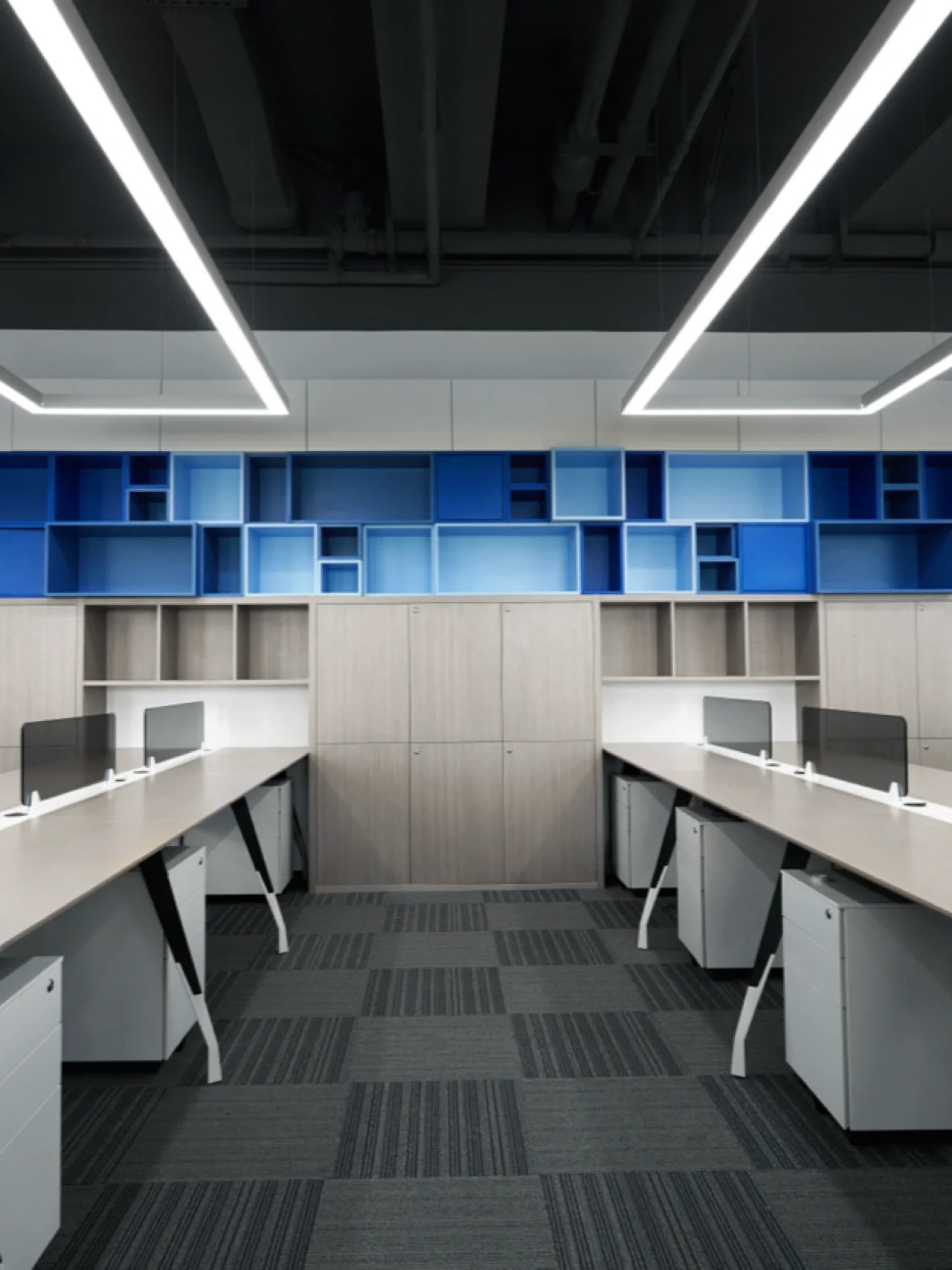 我们的设计主题是让整个空间能与大海概念相融合,从蓝色的色阶及渐变上做到变化,办公区域采用自由、开放式的场景,让无敌海景在各个区域随时映入眼帘。办公区域整体用色融入海的蓝色概念,100个大小不等的BOX书柜的蓝色渐变,采用钢结构蓝色渐变,布艺墙体的蓝色渐变,还有5个落地的矮书柜隔断蓝色渐变,在色彩上让其浑然天成,让其视觉美好放松为办公室提升视觉属性,我们一直努力着。