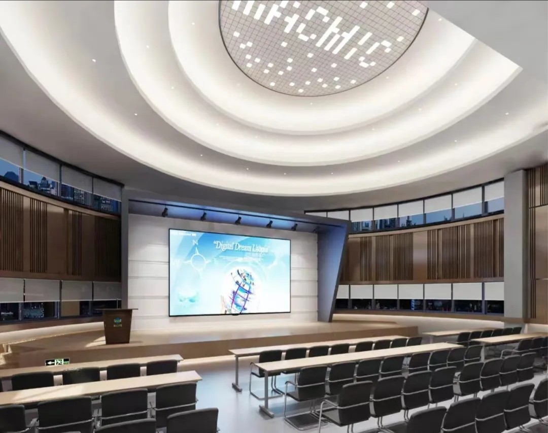 报告厅运用了圆形吊顶以及流线的空间分隔。结合了展厅的设计特点,软装配饰的风格也同样是选用一些流线感的木饰面吸音板,顶面通过一些几何结构和流动性线条打造一个抽象且动态的空间。