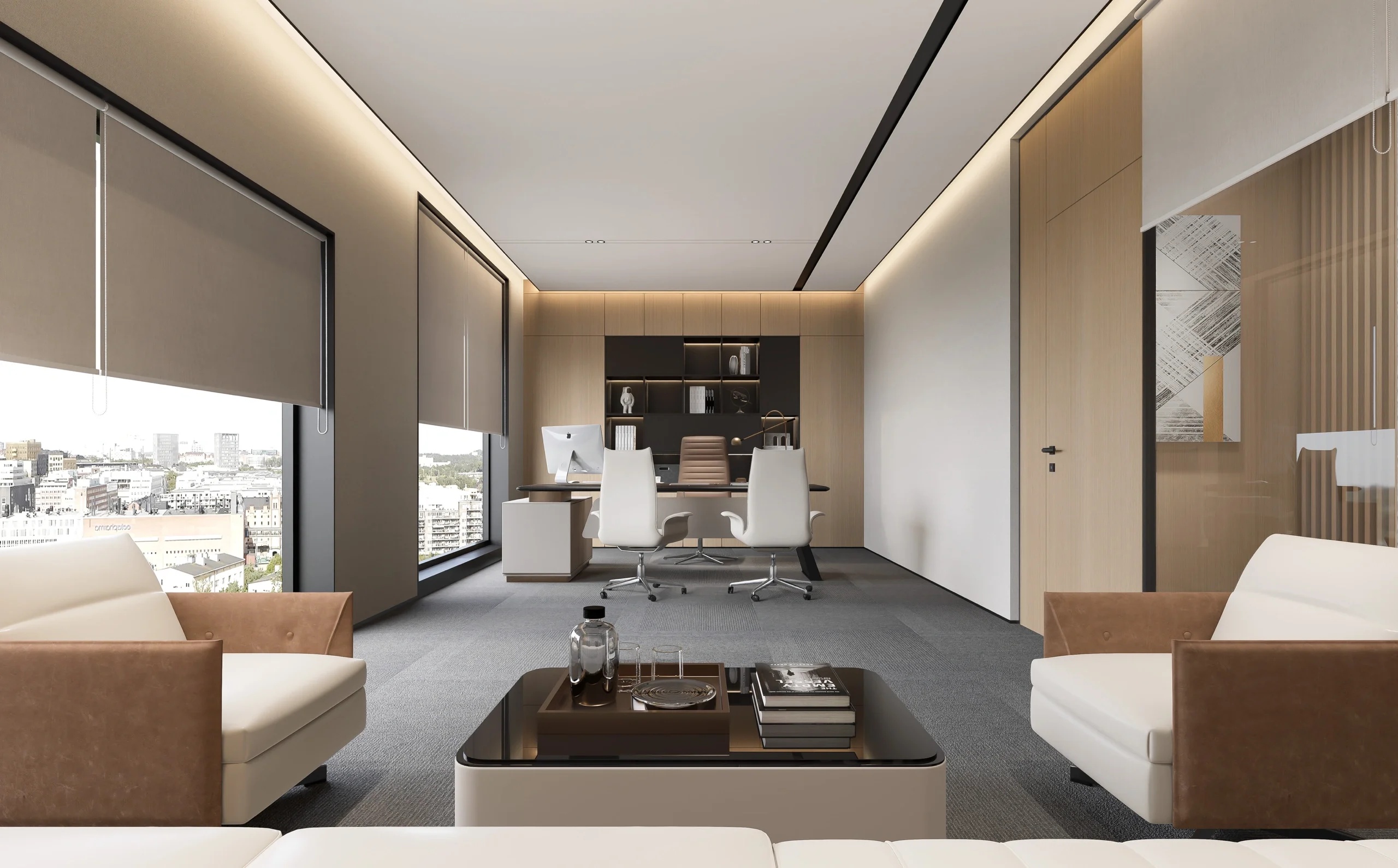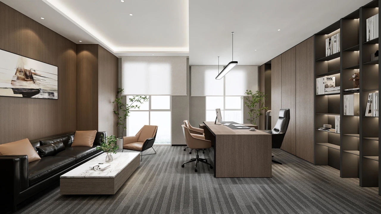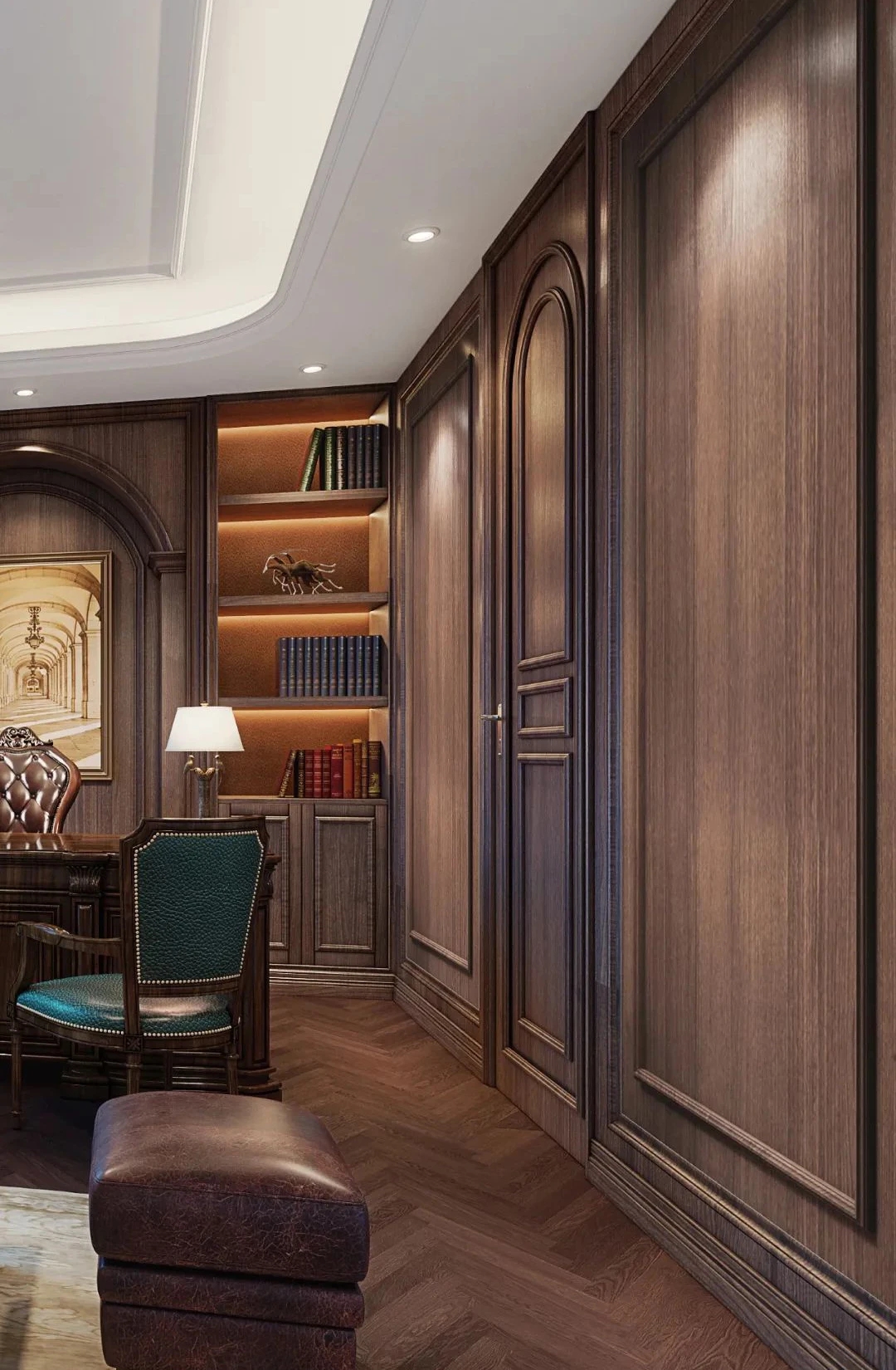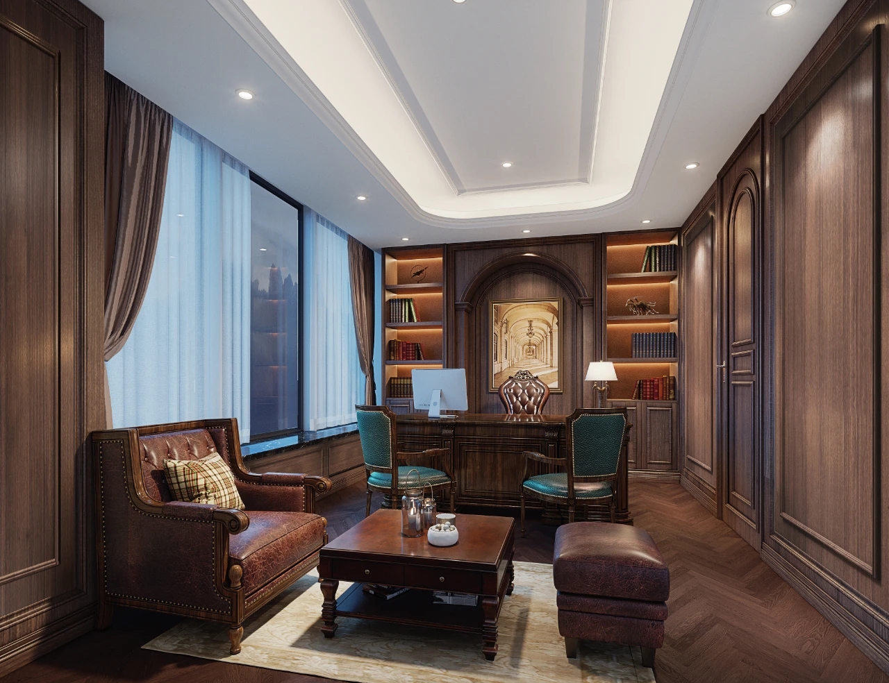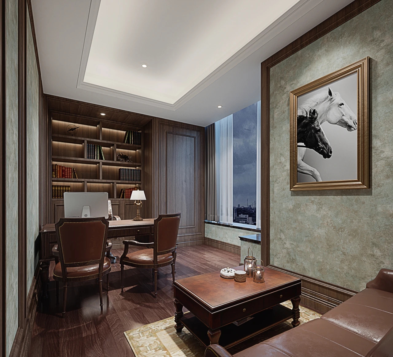 董事长办公空间在延续空间风格基础上,运用英式风格其他经典元素,家具运用雕花,让整个空间更加典雅、精致、富有气魄,在细节上的静谧、内敛的风致漫漫荡漾开来。