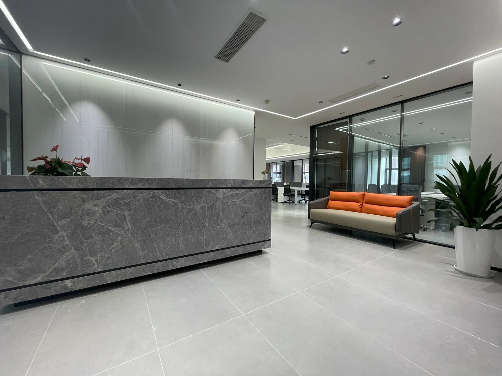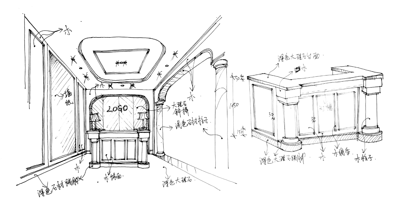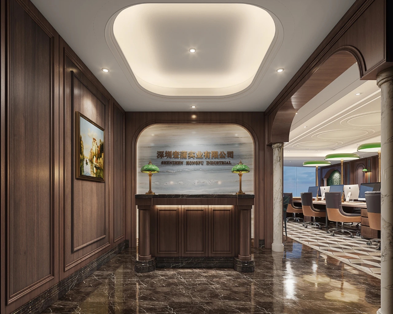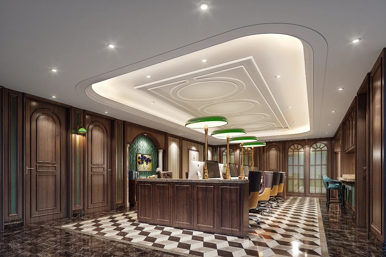 重塑20世纪30年代的流金岁月,去解锁贵族圈层的办公方式,古典元素木饰面线条加墨绿色元素进行点缀,让整体空间更加和谐,大厅正背景采用蓝金沙大理石,给人第一眼高贵典雅气质。