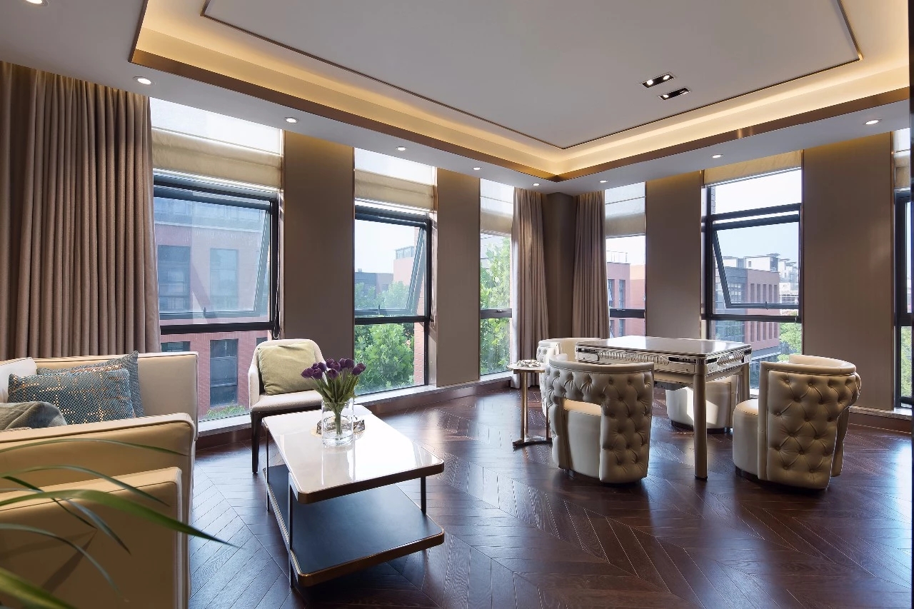 从彰显典雅、庄重、传承到实用体验,气派的接待室切近业主职能需求。深咖色的墙面分割及浅色墙面漆和黄铜元素的巧妙混搭让原本单调的空间更添层次,华丽感也瞬间提升。