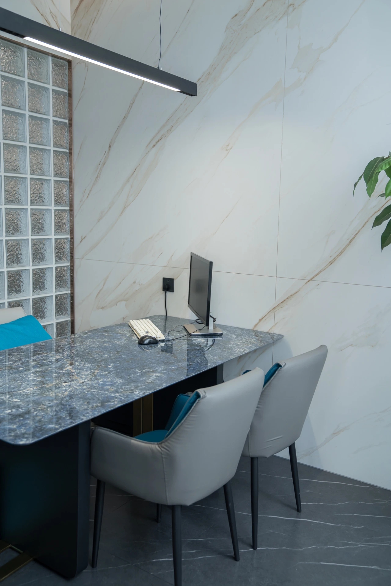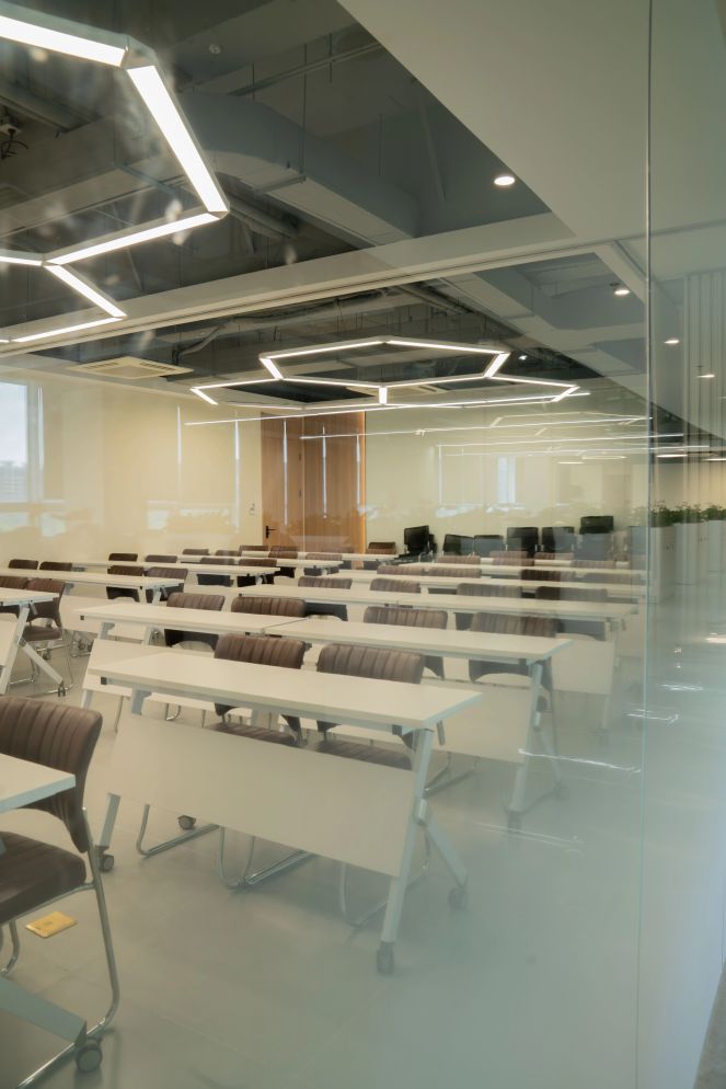 灰调给人静谧思考的情绪,灰调地毯在商务办公空间的运用将这种情绪精准传达,透明落地窗保证了室内明亮的空间感。在这里还能看到全高的窗户,将室外的光线和景色带入室内。