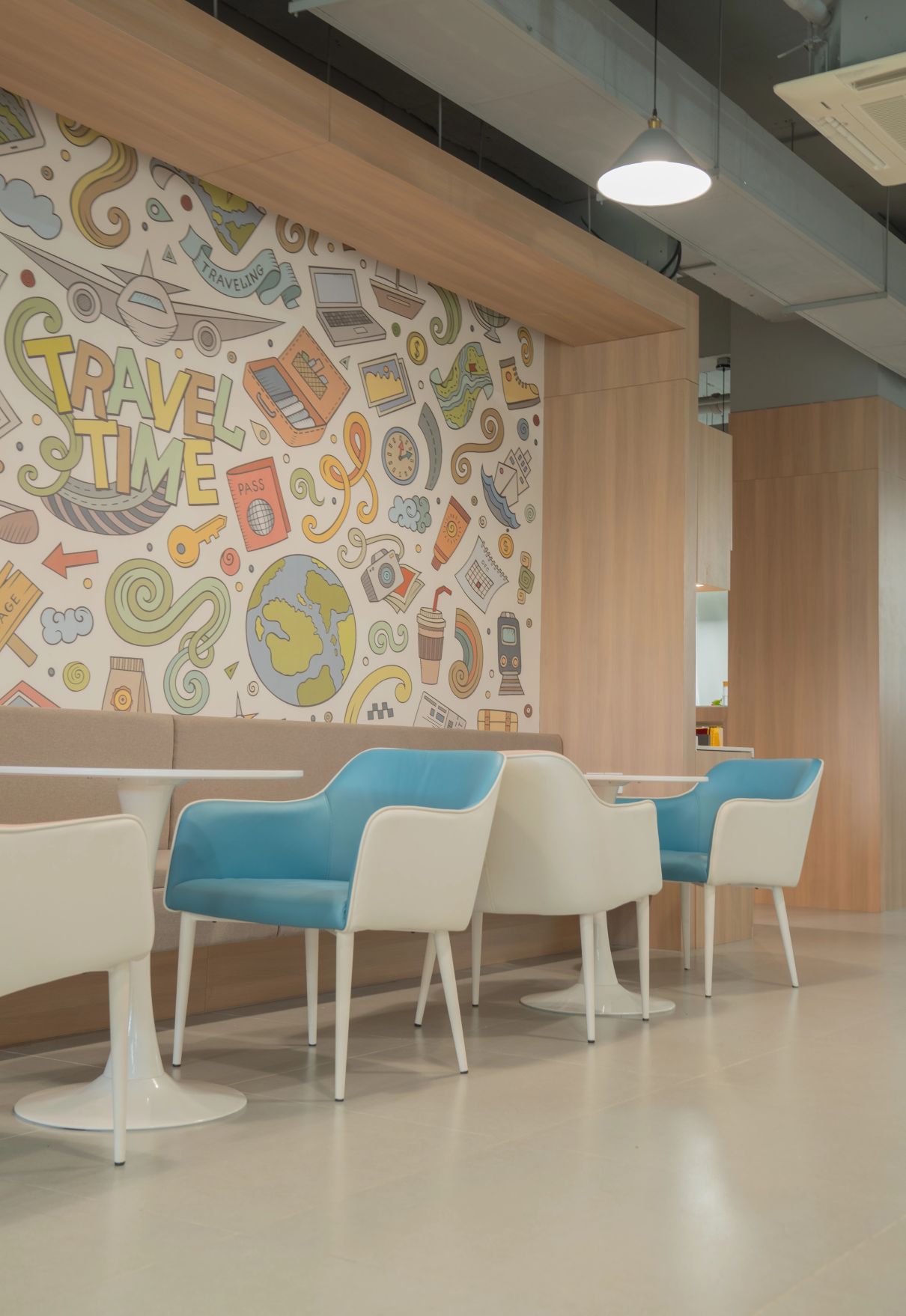 书吧、用餐区、咖啡吧地面草绿、淡蓝色的运用,将这一块区域营造得活泼、轻快。H.WORK SPACE的书吧有着简练的设计风格,橡木踏板与阶梯座位的设计,更是将这种简练的语言表达得透彻明了。