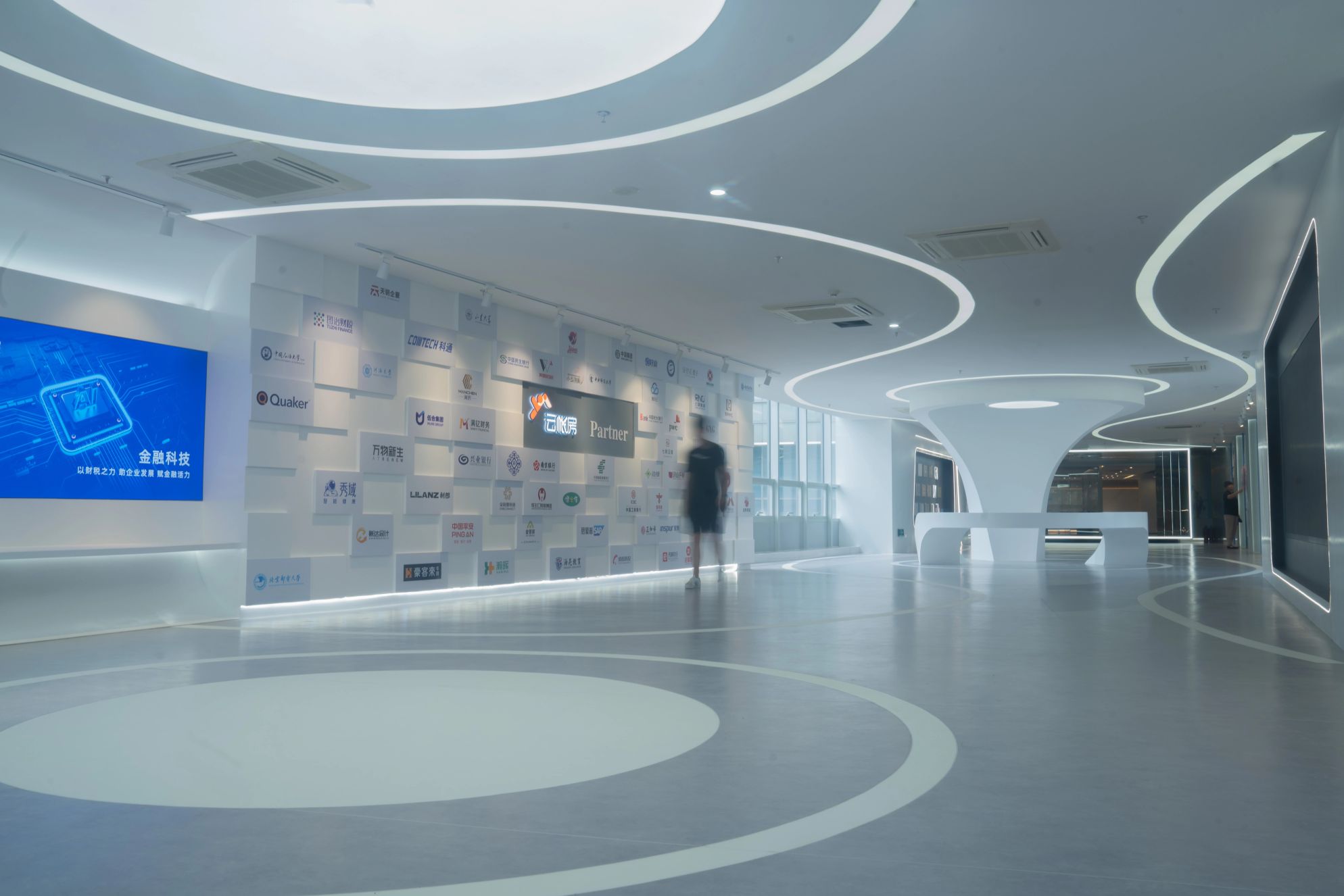通透的二层平台打开与展厅交互的窗口,引入光与声的遐想,突破利用场地层高,构筑开阔的视觉观感。