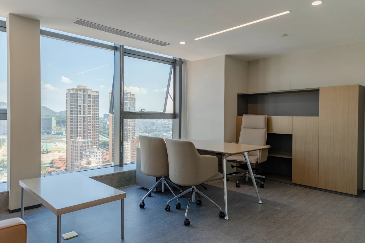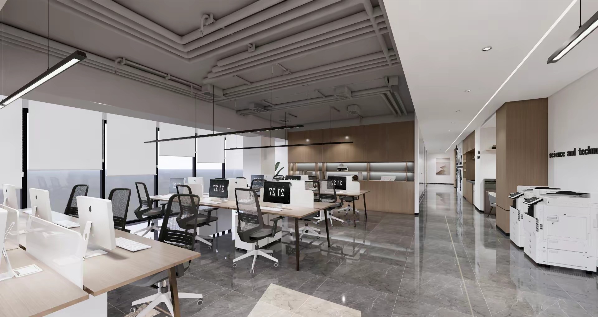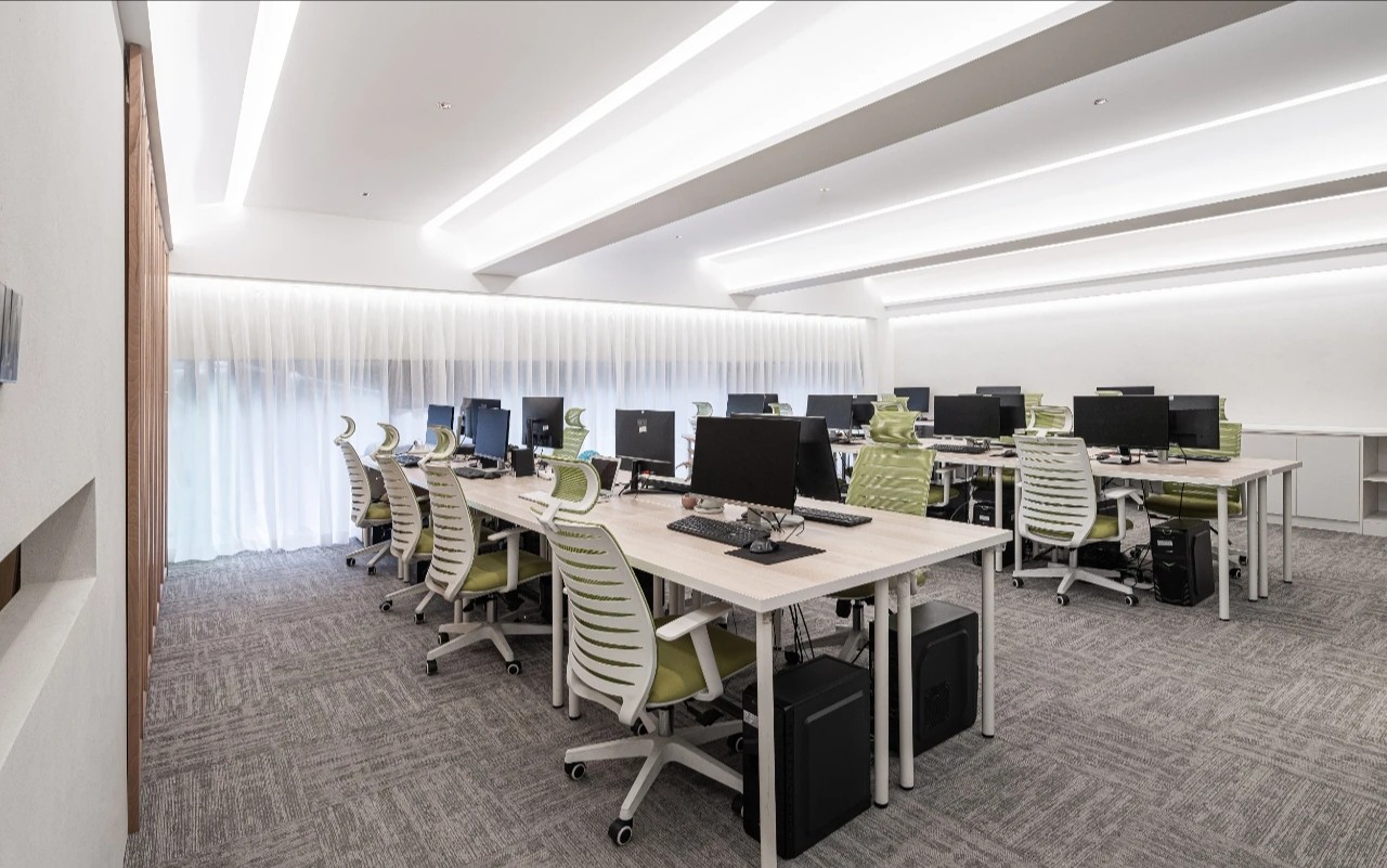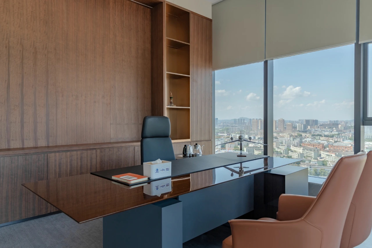 开放办公区从工作模式、行为习惯出发,屏风式卡位保护了员工的部分隐私权,从实用性出发,提升办公室整洁性,呈现整个空间专业,自信的集团企业态度,给到访的人员带来更深层的信赖感。个人办公区选用板式油漆班台,深胡桃木色这样深色调搭配,能营造沉稳、稳定的空间氛围,让空间使用者在办公环境内更更加冷静面对细微繁琐的工作任务,从而做出最优的判断。
